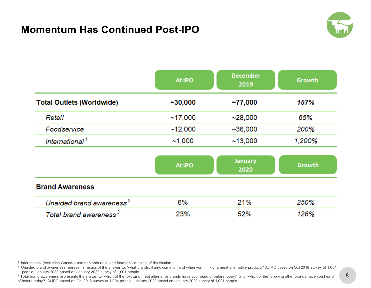 公司IPO后,这种势头仍在持续。下面可以看到,相比IPO时,公司全球渠道数量增长157%,零售渠道增长65%,餐饮渠道增长200%,国际渠道数量增长1200%。品牌认知不断增强,未提及品牌认知提升250%,整体品牌认知提升126%。