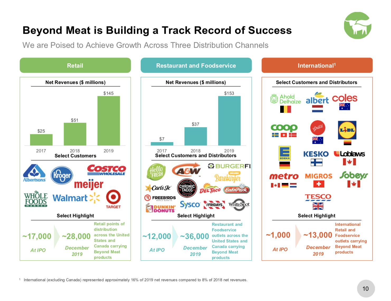 Beyond Meat正在创建一连串的成功记录。通过三个分销渠道实现增长,它们分别是零售渠道,餐饮和食物服务渠道,以及国际市场。