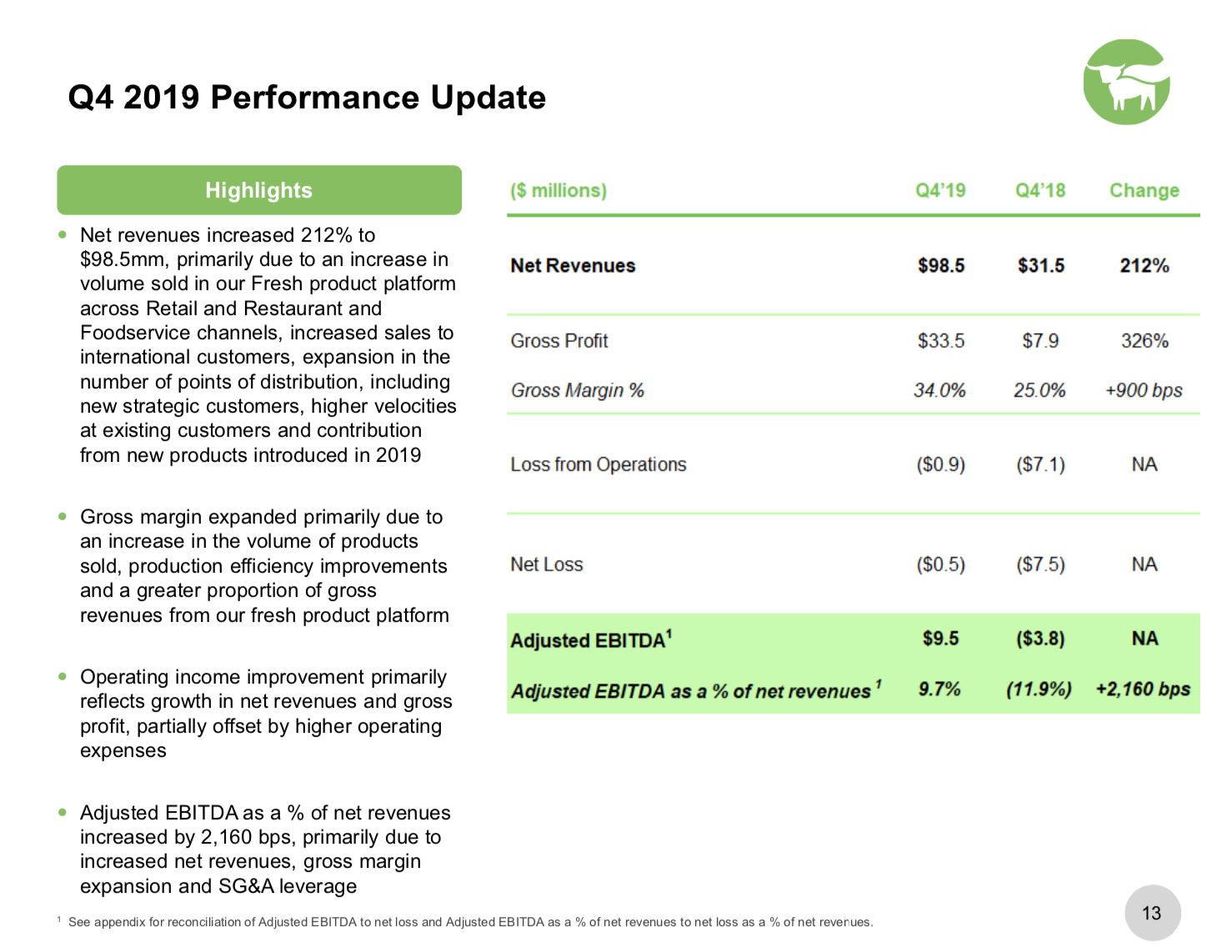 4季度净增营收增长212%至9850千万美元,主要是零售和餐饮渠道新鲜产品的销量增长,包括向国际市场客户销售,扩大销售渠道数量,如新增战略合作客户,现有客户消费的增长以及2019年引入的新产品贡献。