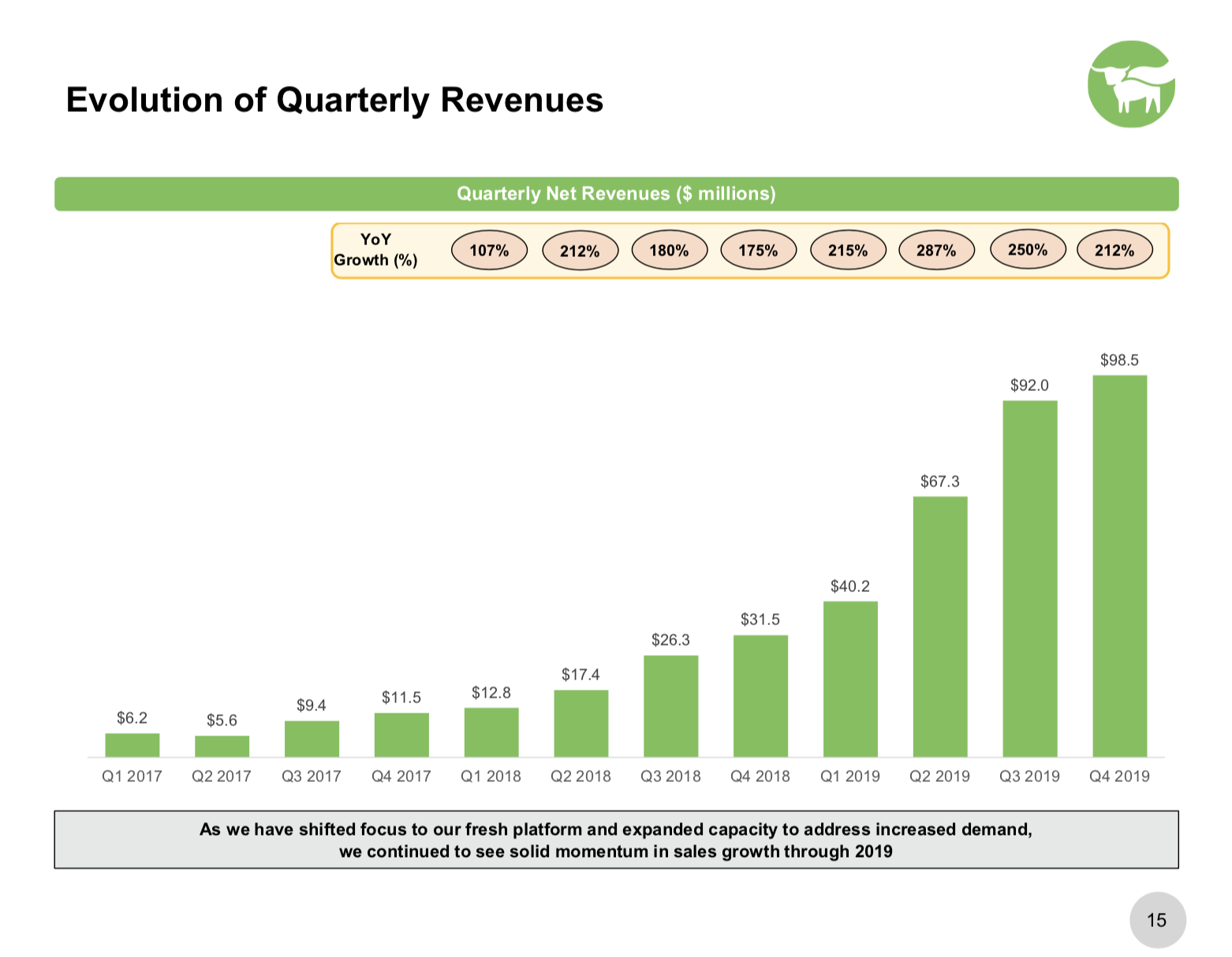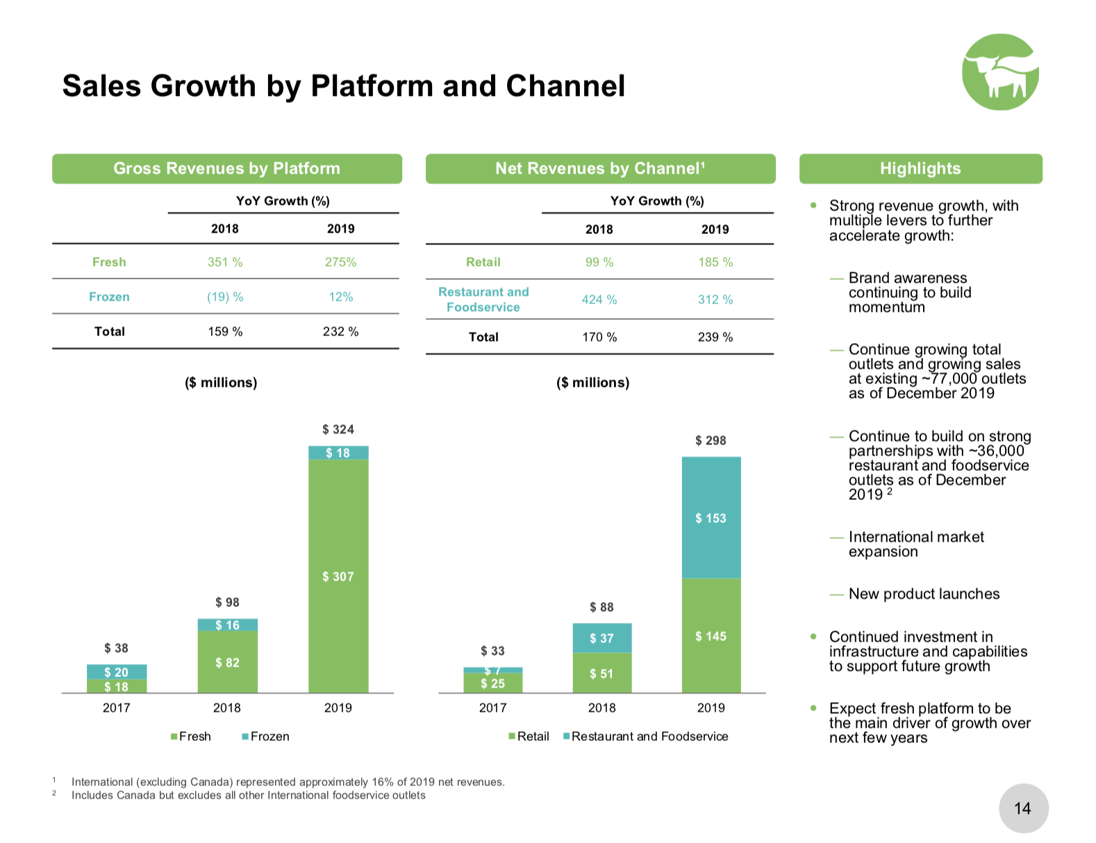 下面是平台和渠道方面的增长数字,因为公司战略方向是做新鲜产品,所以新鲜产品增长很快,2019年为3.07亿美元,同比增长275%;冷冻产品从1600万美元增至1800万美元。