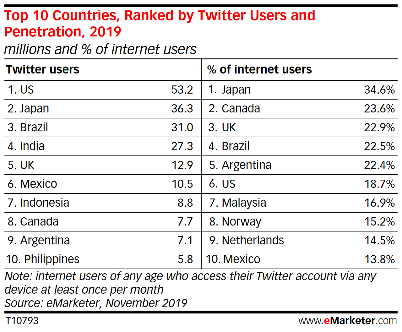 Twitter在日本的吸引力可以归因于一系列因素:日语在Twitter上的字符限制方面表现很好,使用汉字可以比其他语言表达更多的内容。匿名在日本很受重视,许多用户使用反映特定兴趣的用户名注册。与其他流行平台不同,Twitter不要求用户使用真实姓名。日本的智能手机普及率(68.4%)。