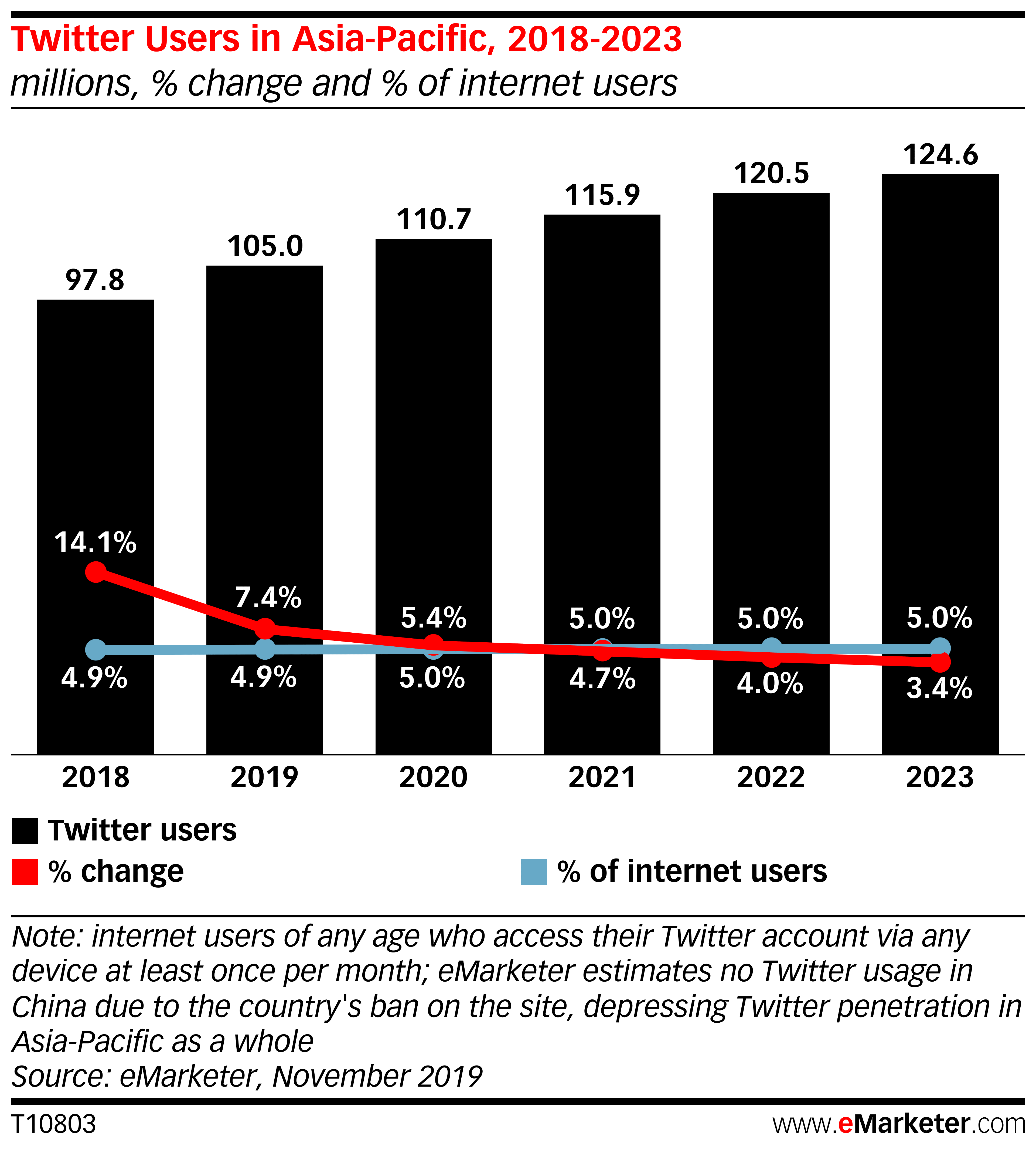社交媒体用户被Instagram和Snapchat等较新的平台吸引,Twitter的用户增长多年来则一直停滞不前。但eMarketer对Twitter用户增长的预测显示,Twitter十大市场中有7个在亚太地区,这一地区趋势在Facebook上也很明显;在某种程度上,Instagram也是如此。