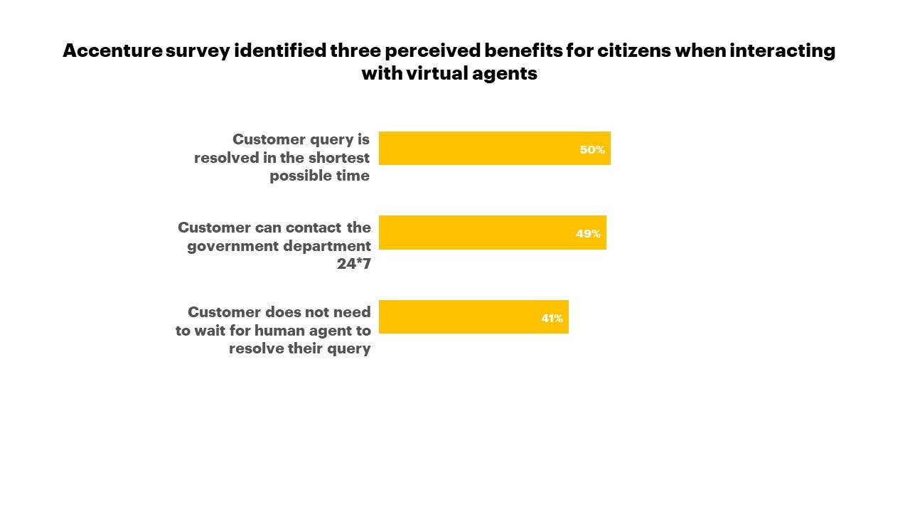 超过3/4的受访者(78%)看到了使用虚拟助手(人工智能)接受政府机构服务的好处,近一半的受访者(47%)希望使用虚拟助手完成一些业务。此外,一半的受访者(50%)相信他们的问题可以通过虚拟助手在尽可能短的时间内得到解决;另有差不多的受访者(49%)预计,他们可以全天候获得政府服务。2/5的受访者(41%)表示,使用虚拟助手将减少他们等待人工客服的时间。