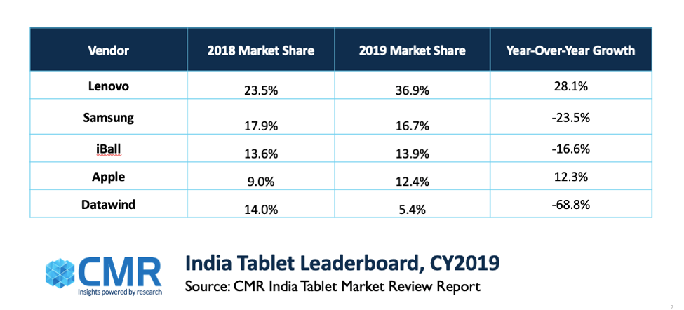 根据CMR发布的2019年第四季度平板电脑市场回顾,联想连续第十个季度统治印度平板电脑市场。虽然整体平板电脑市场同比下降了18%,但4G平板电脑同比增长了22%。
