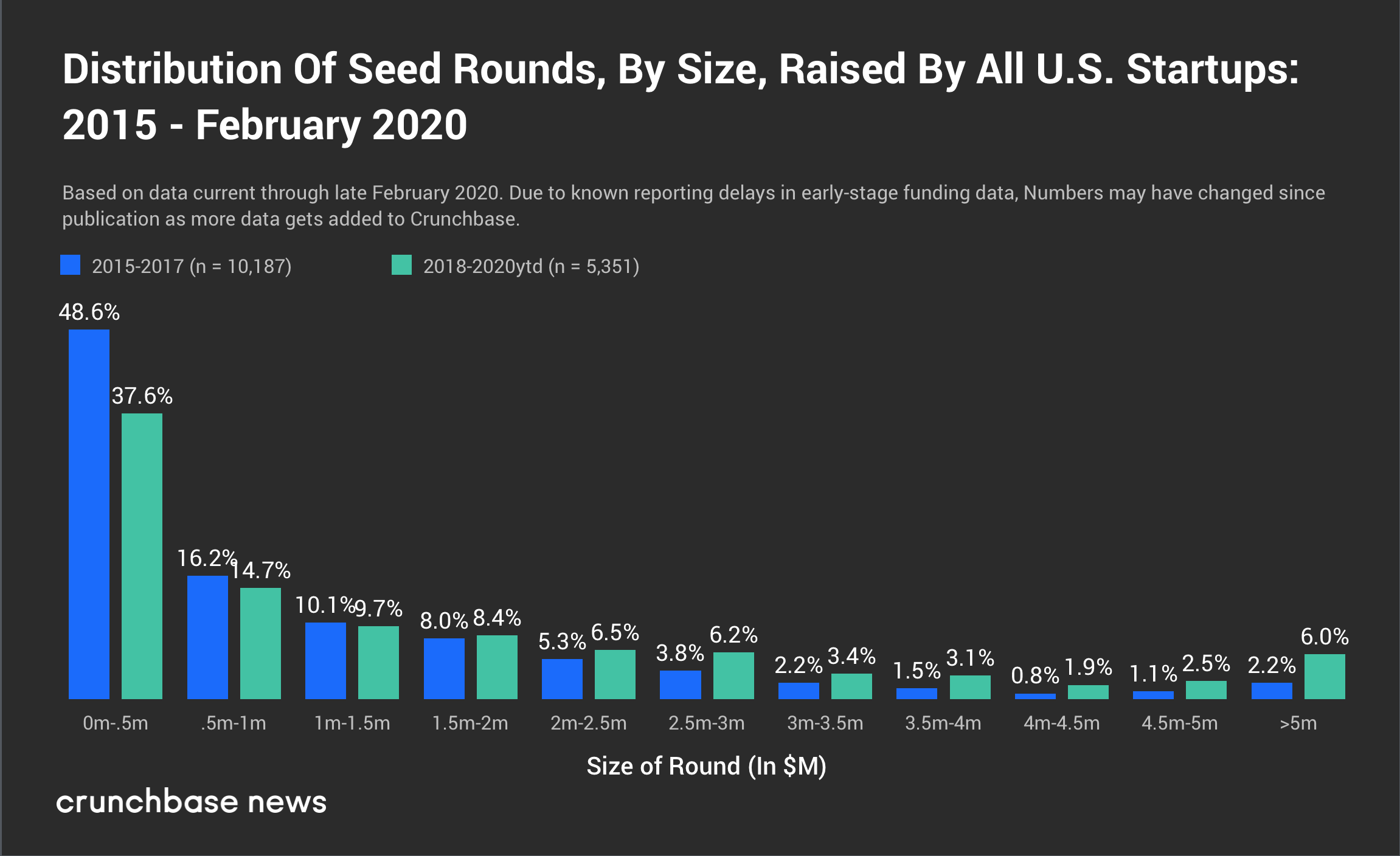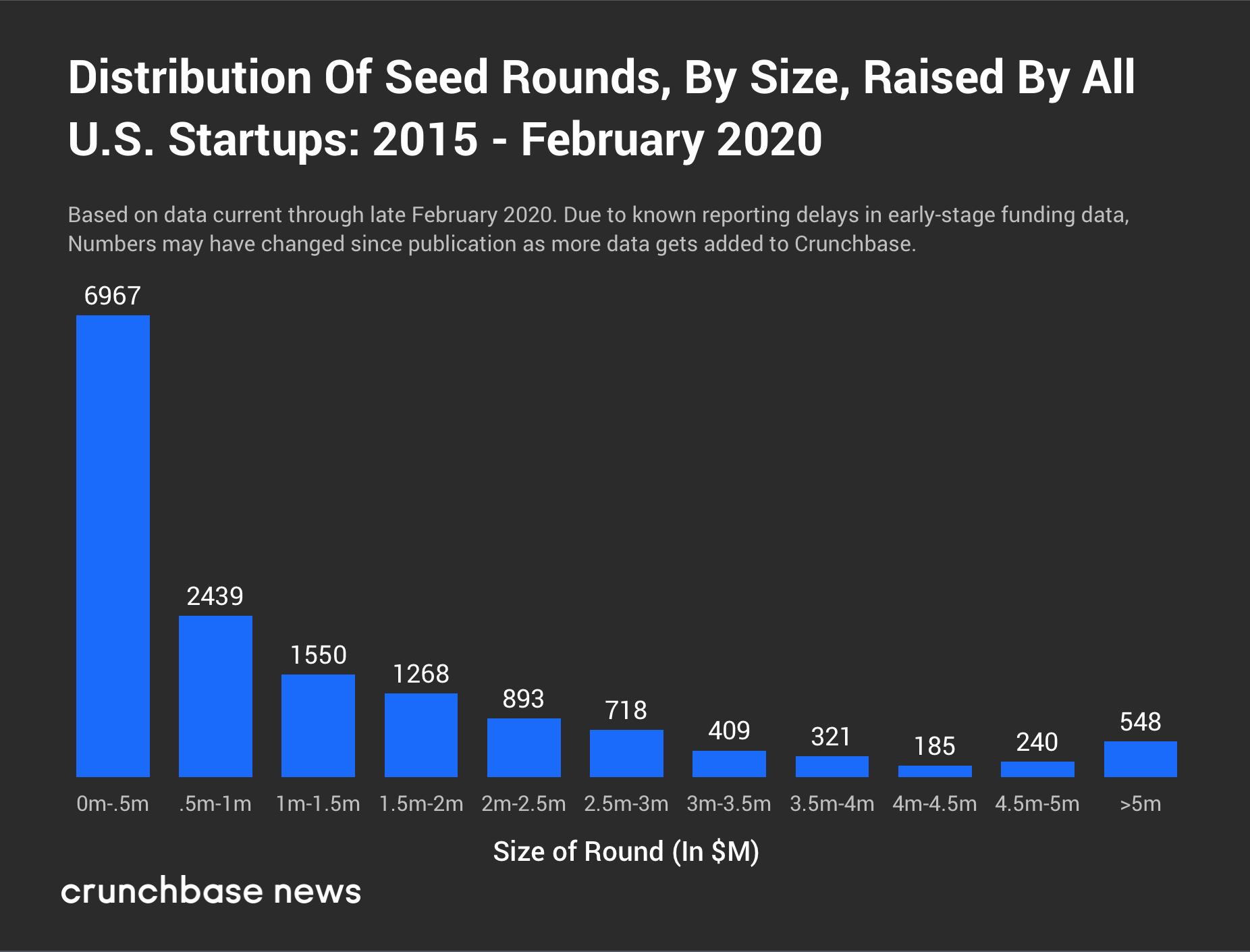我们分析了Crunchbase的数据集中标记为种子的15538笔投资交易,这些交易发生在2015年1月至2020年2月中旬,主体是12772家美国初创公司。然后,我们根据这交易的规模对数据进行了细分,以50万美元为增量(包括50万美元)对这些数字进行了分类。
