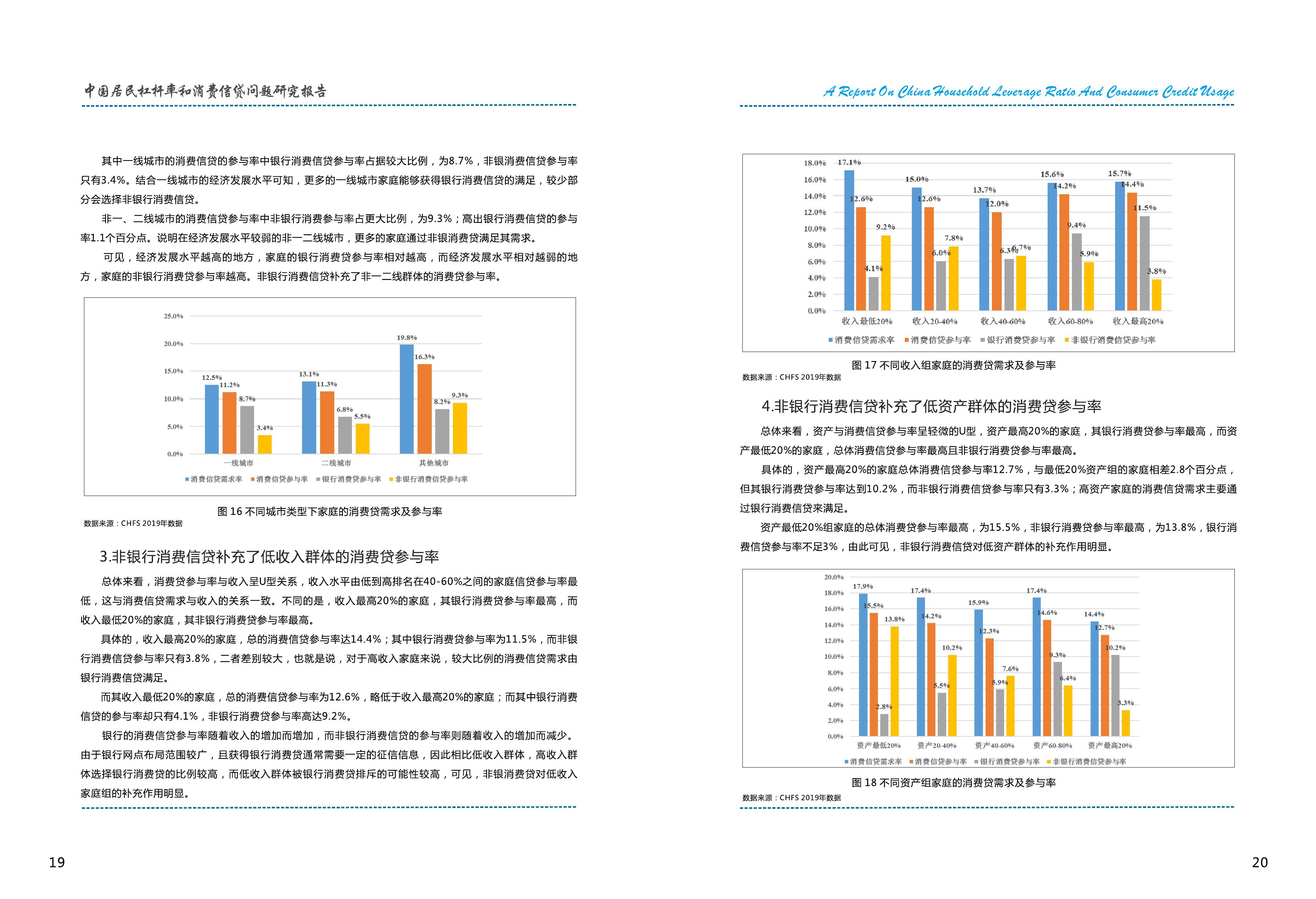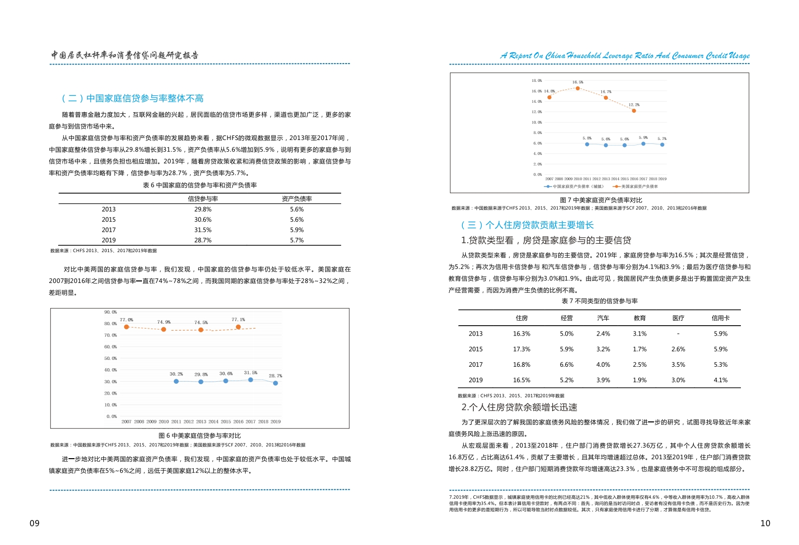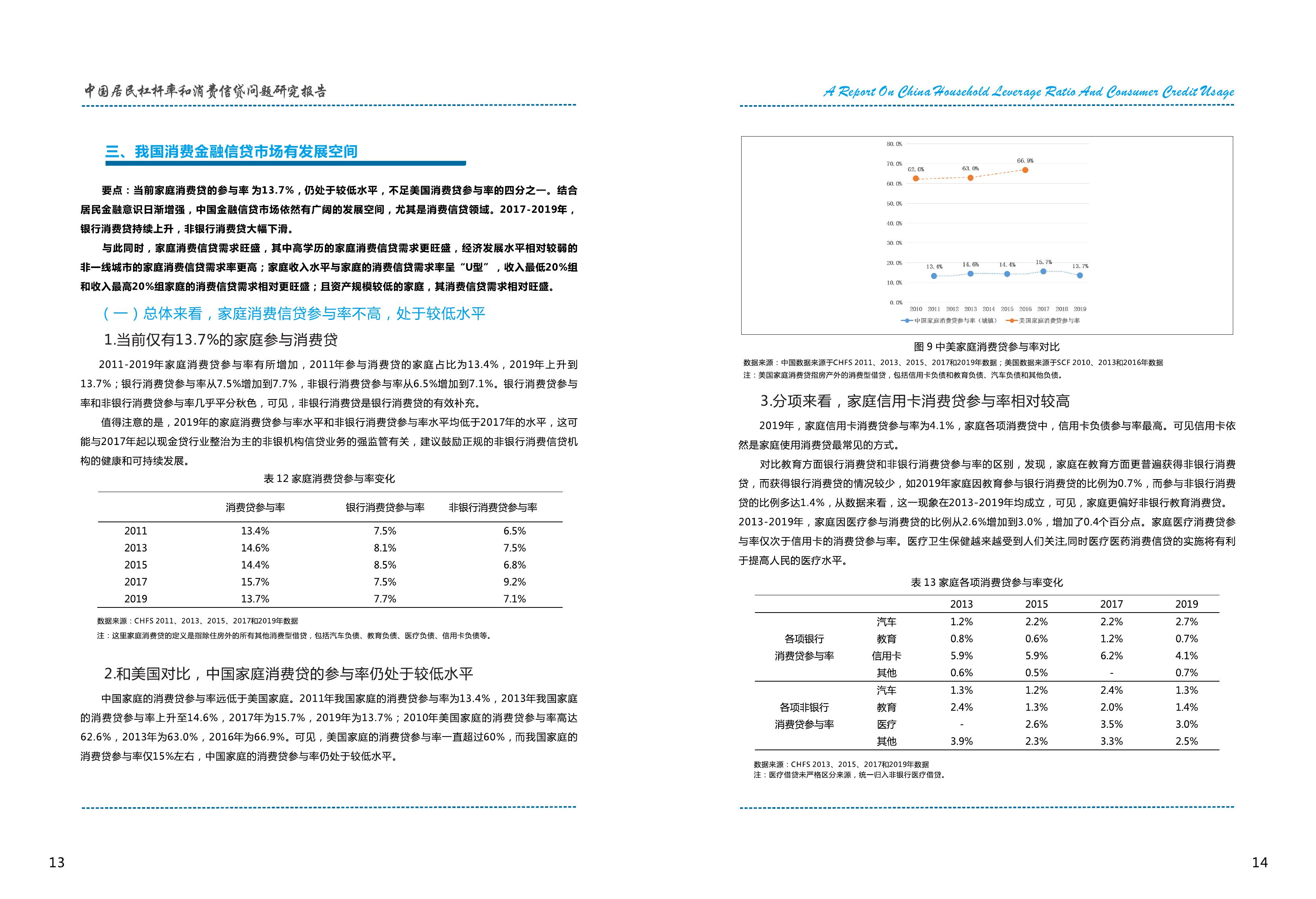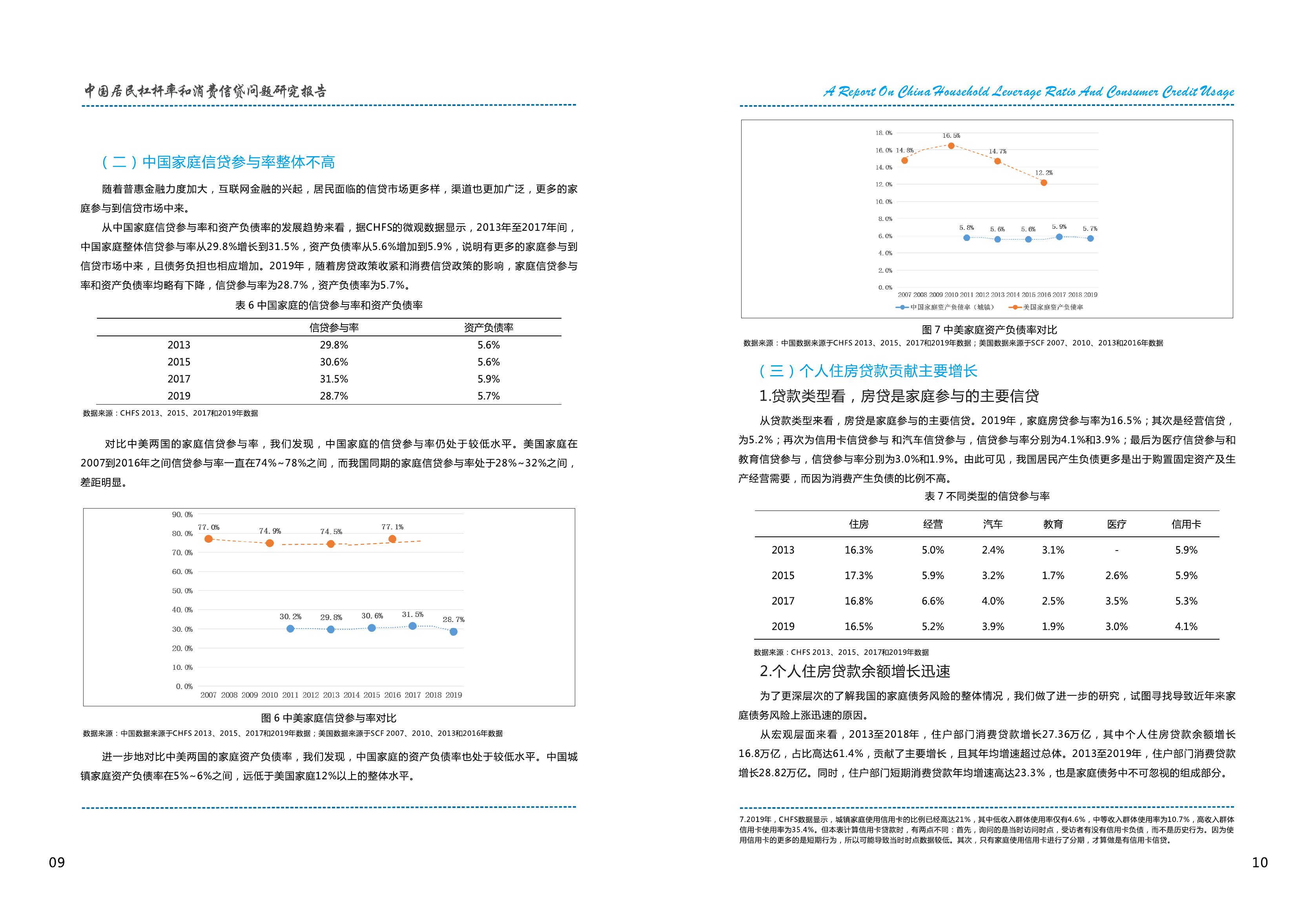 报告指出,首先,中国人的负债情况没有想象中那么高。数据表明,中国家庭债务占GDP比重为49.2%,远低于美国77.1%的水平。同时,在信贷参与程度上,中国的信贷参与率只有28.7%,也低于美国的78.0%的水平。其中家庭消费信贷的参与率更低,2019年只有13.7%的水平,更是不到美国的四分之一。