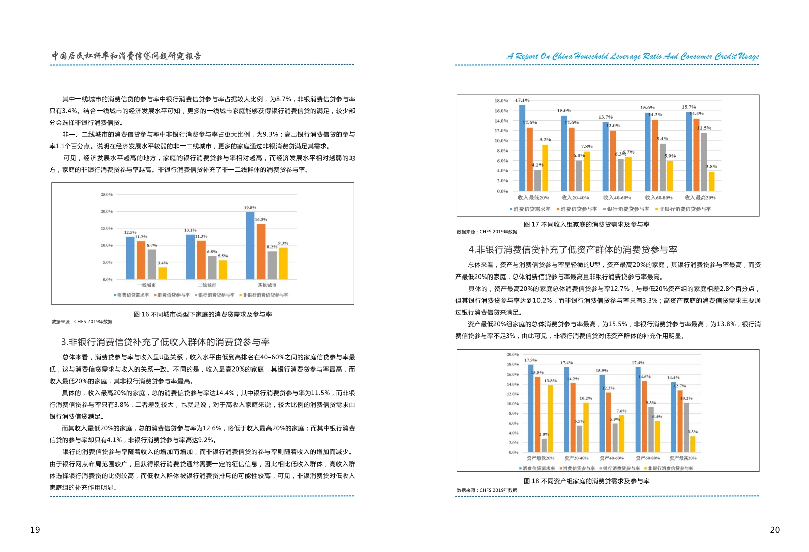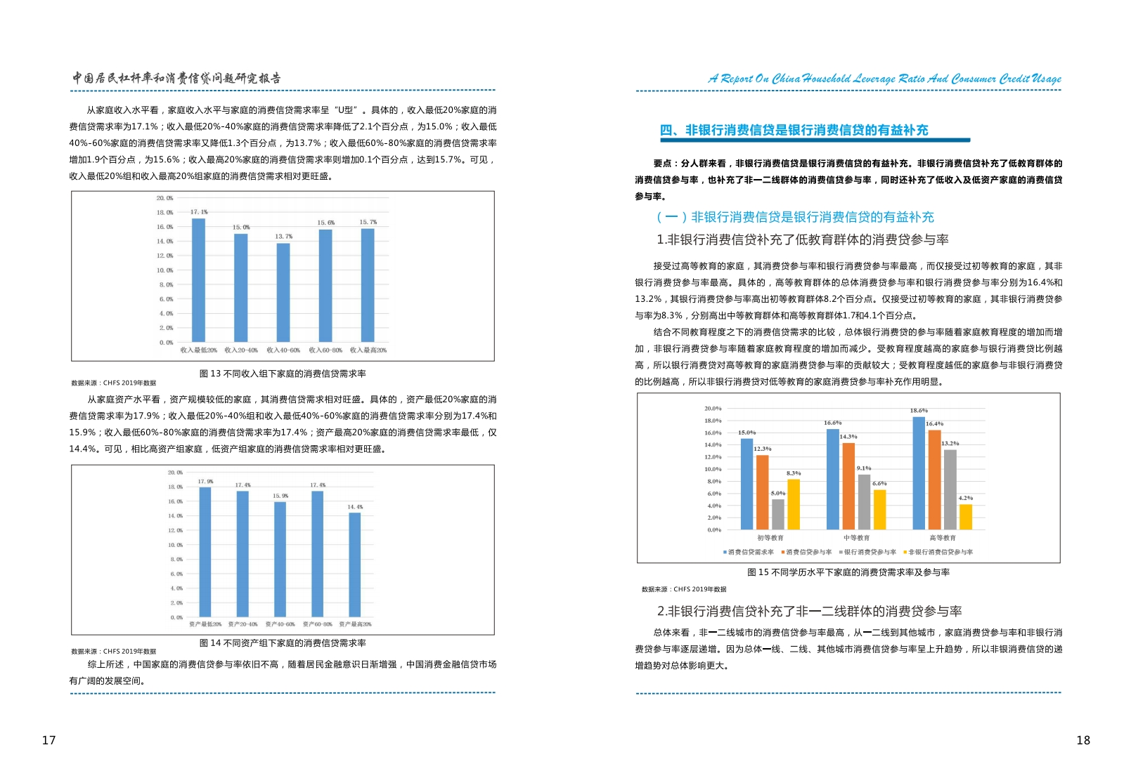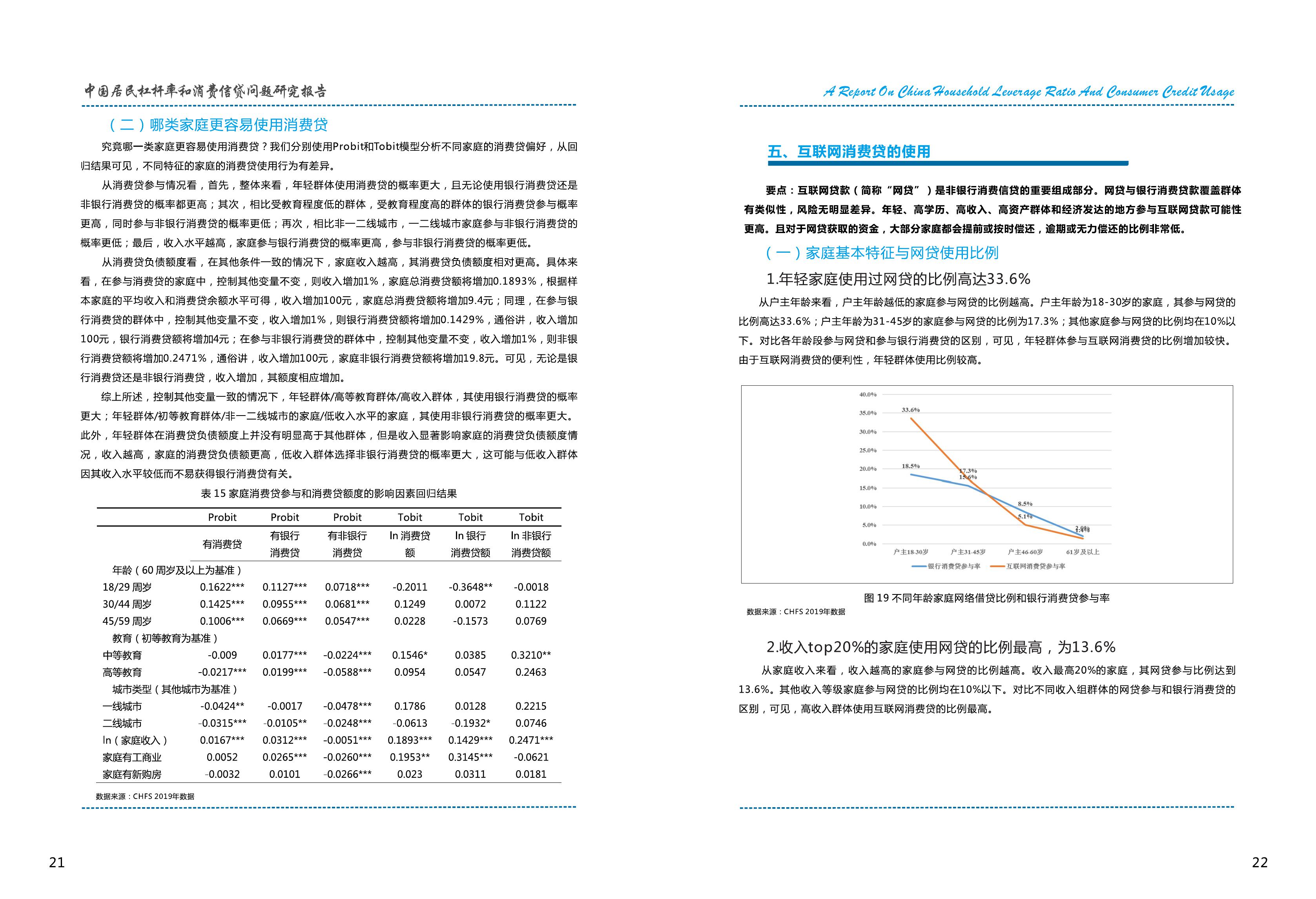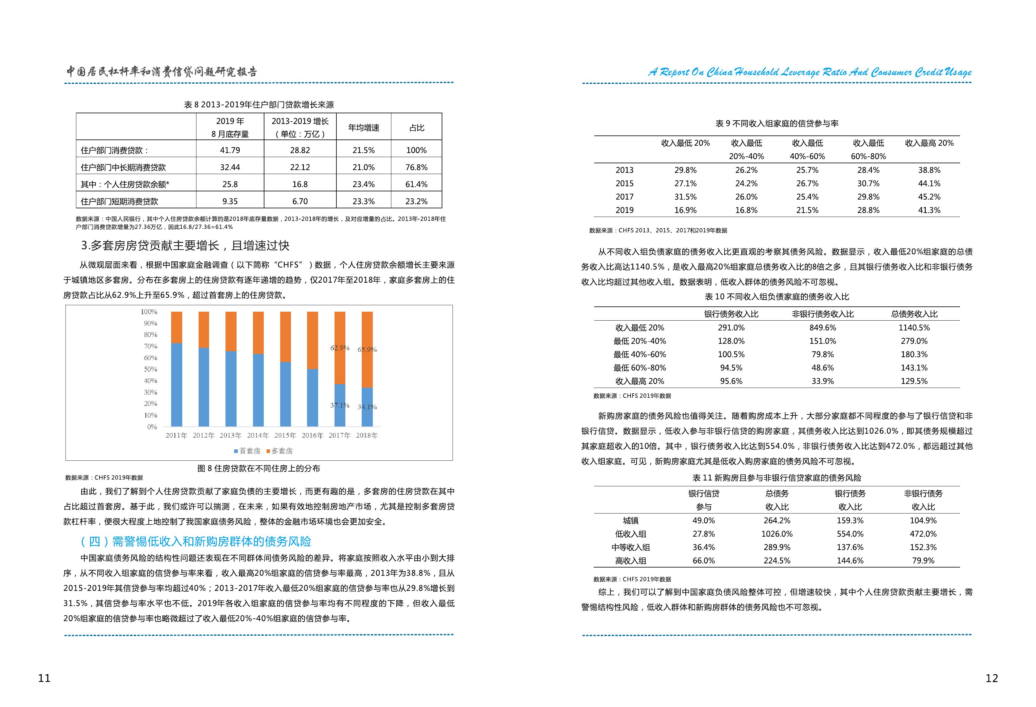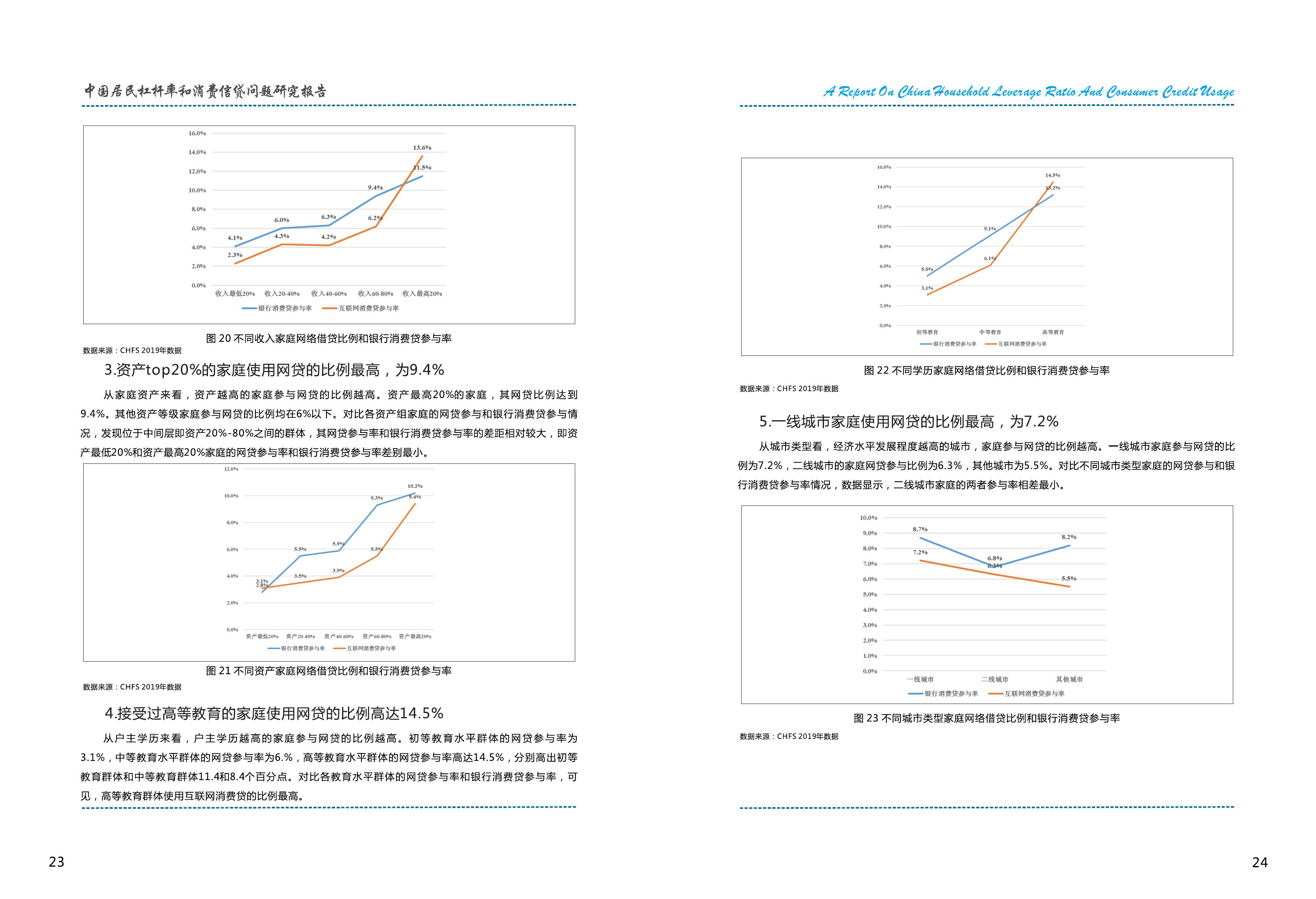 报告指出,首先,中国人的负债情况没有想象中那么高。数据表明,中国家庭债务占GDP比重为49.2%,远低于美国77.1%的水平。同时,在信贷参与程度上,中国的信贷参与率只有28.7%,也低于美国的78.0%的水平。其中家庭消费信贷的参与率更低,2019年只有13.7%的水平,更是不到美国的四分之一。