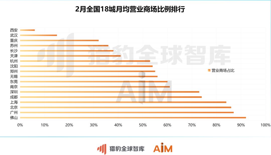 “猎豹移动AiM商场机器人大屏网络”的大数据显示,整个2月,在选取的18个城市样本中,佛山市和广州市的商场月均营业比例分别排行第一、二,其次紧随其后的为北京,三者未营业的商场比例分别是8%、13%和14%。另外,武汉商场的月均营业占比为15%,并且其中大多并非商场在营业,而是商场中的超市在营业;同时,西安的商场的营业意愿最低,月均营业商场占比仅为6%,