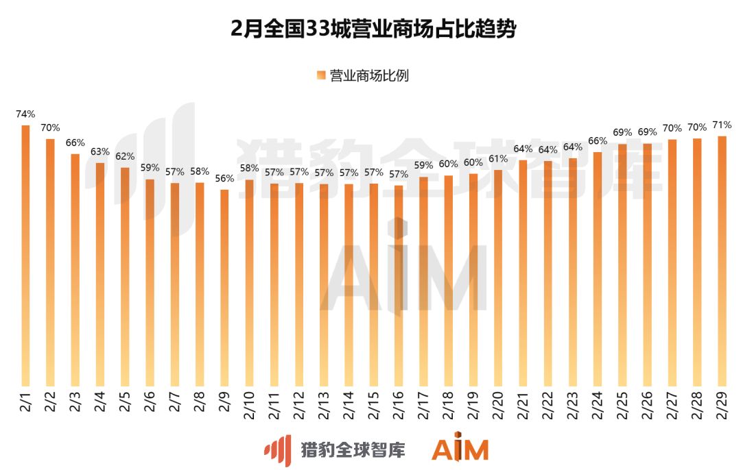2月,全国33个城市营业商场占比呈现“微笑”曲线,到了2月29日,全国未营业的商场已不足三成。同样该趋势也与全国新冠肺炎的新增确诊趋势呈现相反关系。