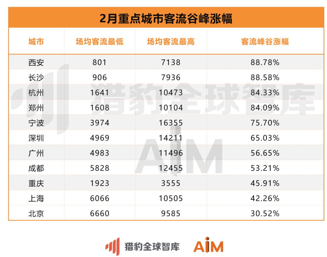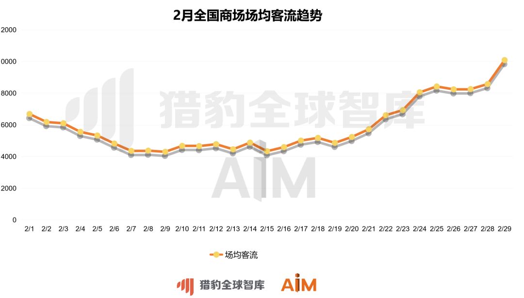 整个2月全国商场场均客流呈现“U”型上涨。其中从2月15日,全国场均客流最低谷4459人次上涨至2月29日的10089人次,谷峰涨幅超126%。