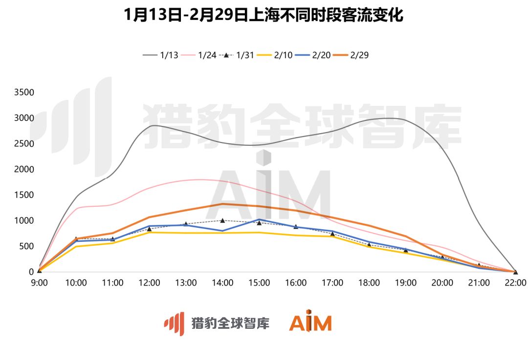 上海的客流高峰与武汉较为相近,主要集中在下午13:00-14:00之间,不过值得关注的是,前面提到的在疫情之前消失的晚高峰,在上海似乎有回归之势,我们看到19:00左右上海商场出现了一个小幅的客流高峰。