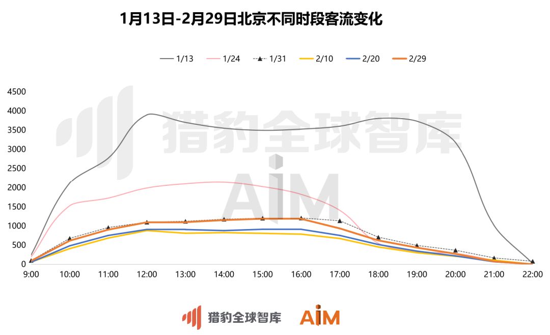 分析其原因,西安和长沙均为疫情重地湖北的邻省市,此前商场的场均客流基数较低,因此2月回流的速度较快。根据上一期“猎豹移动AiM商场机器人大屏网络”大数据可以看出,此前北京商场无论是营业占比,还是场均客流水平均排名靠前,因此在2月出现30%的客流峰谷涨幅也在情理之中。
