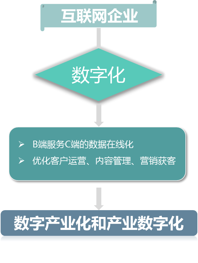 谈到To B的生意,我们更多的是抱怨客户特点千差万别、缺乏付费习惯、缺少粘性、行业周期长等一系列问题,不可否认,这些问题都是To B生意难做的重要原因,但如果单纯地认为这些因素是影响互联网进军B端市场的根本阻力,那未免也过于狭隘了。产业互联网时代最重要的核心就是数字化,而这一点互联网企业在C端市场积累的数据优势大有用武之地。具体而言,互联网企业首先可利用数字科技将B端企业服务C端客户的数据在线化,使数据沉淀下来,然后再利用自身的数据技术和分析能力帮助B端企业优化客户运营、内部管理、营销获客。换句话说,就是帮助B端各个行业实现数字产业化和产业数字化,这是互联网企业切入B端服务最重要的入口和底层。落脚到具体打法上,存在特点比较明显的两个策略:一是通过政府或其他公共平台,获得能够进行B端客户“画像”的公共数据,比如社保、纳税、公积金、用电等,实际上是解决了为B端客户提供服务时严重的信息不对称难题,因此,政府开放多大范围的B端数据一定程度上影响着企业数字化转型的政策风向;二是聚焦部分行业,帮助行业中的B端客户进行数字化解析,帮助他们将数字化嵌入到企业生产经营管理中,利用数字科技提高企业内部的精细化管理能力、提高风险识别和管控能力、提高企业外部的市场预判能力,从而在提高其数字化能力的中寻找商业机会和盈利模式,而最终沉淀下来的是自身服务B端客户的“数字化基因”。综合来看,第一条赛道考验互联网企业的政府公关能力,第二条赛道考验互联网企业下沉B端的决心和耐性。