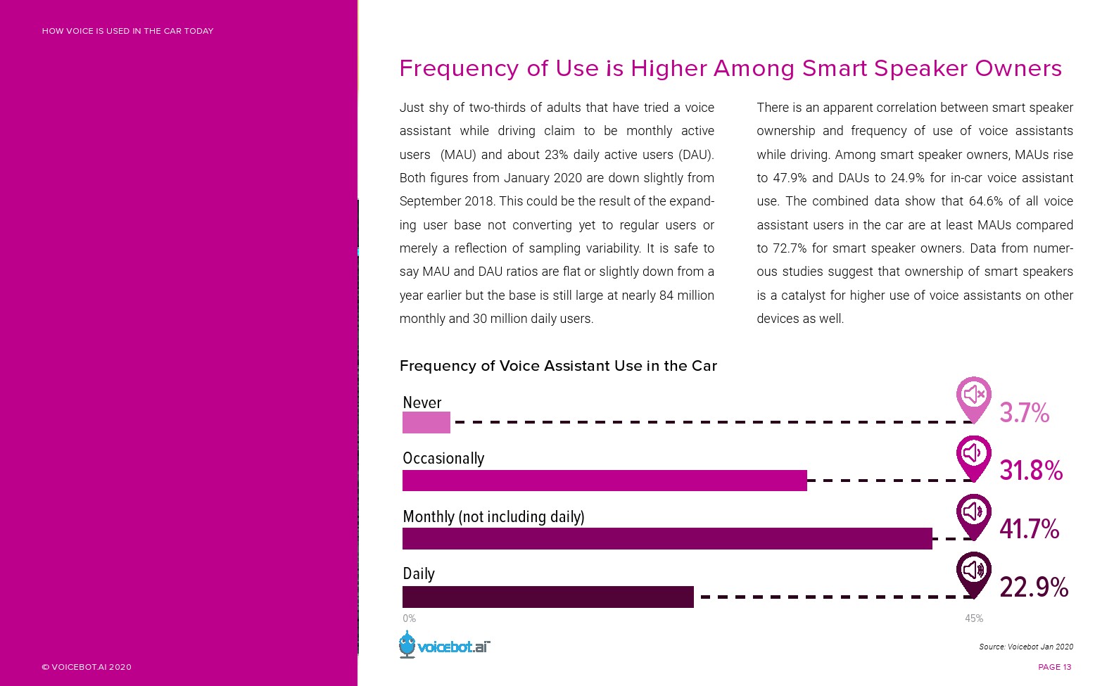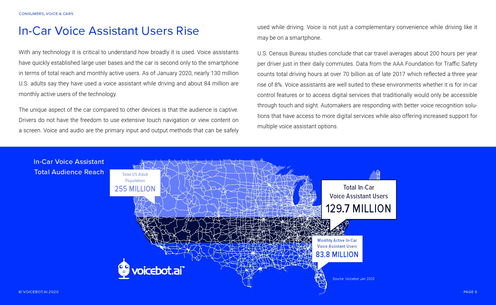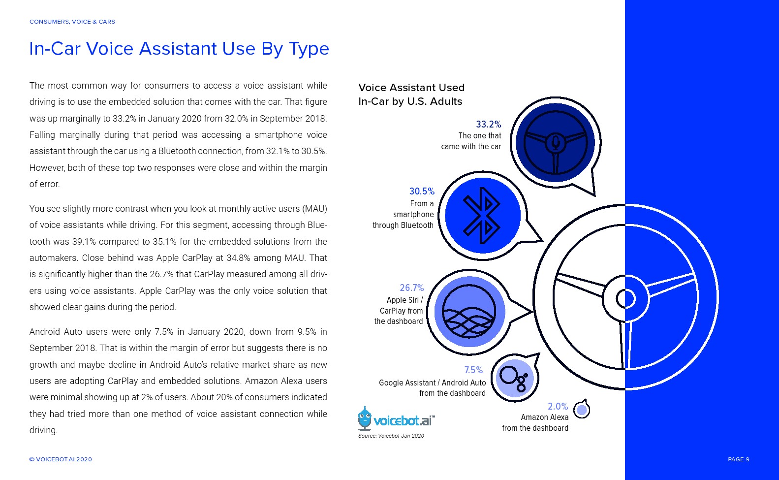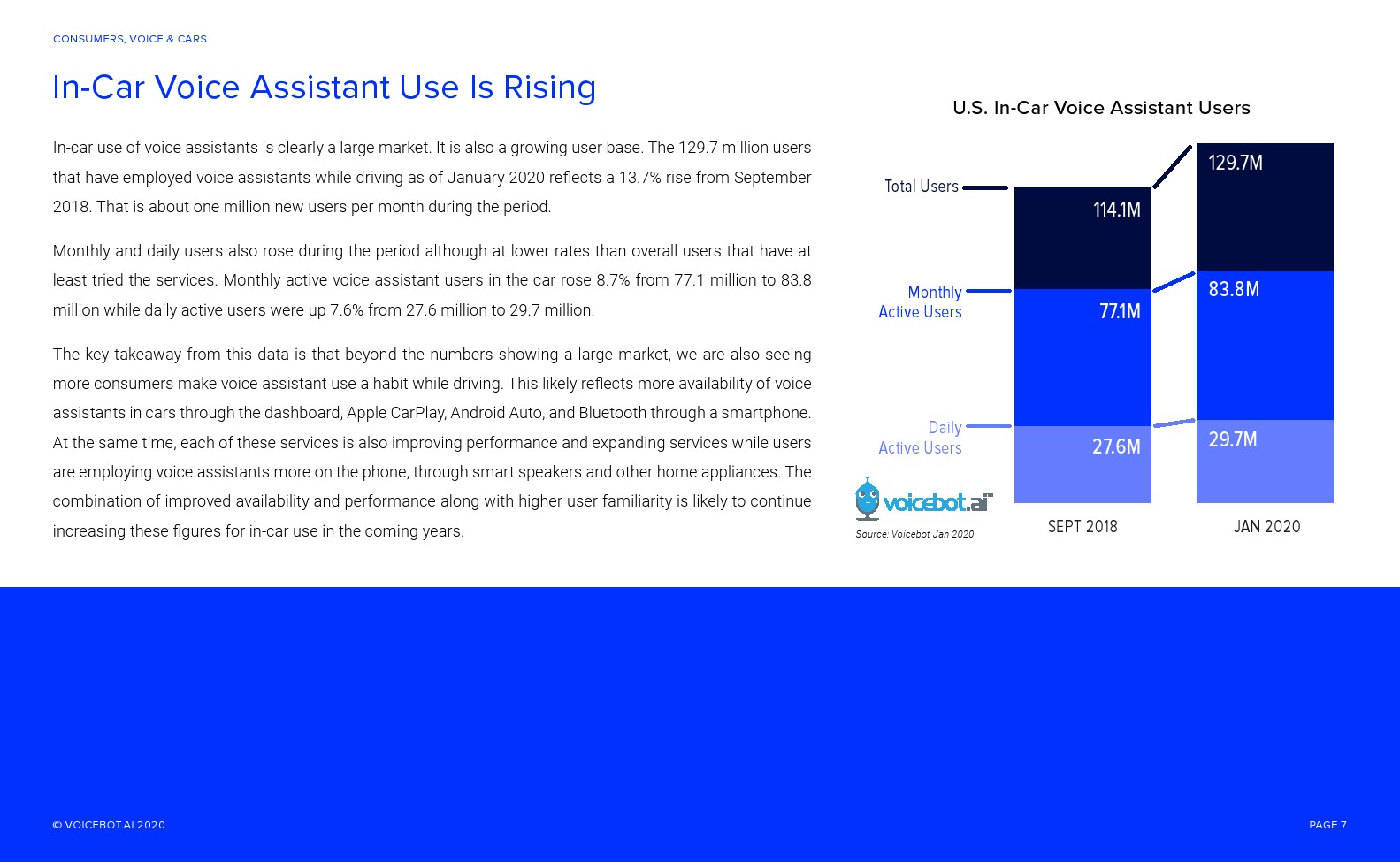 与智能音箱相比,车内语音助手的总用户和月度活跃用户更多。Voicebot.ai在2019年的报告中已经证明了这一点,现在仍然是正确的。人们可能很容易忽视汽车中正在发生的语音革命。