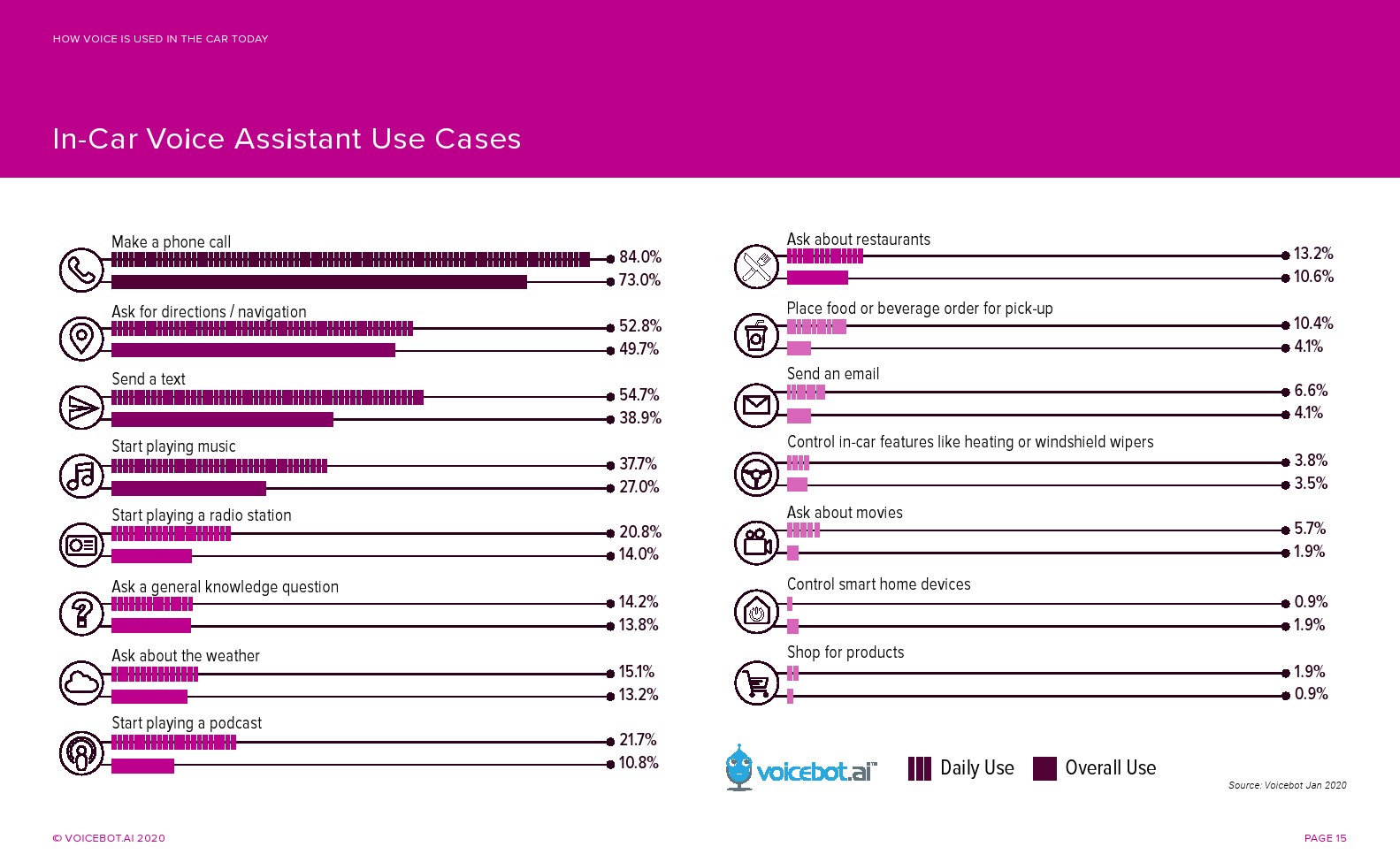 汽车中语音助手的使用案例与智能手机和智能音箱上的不同。开车时最常用的语音助手功能是访问音乐或提问。虽然这两种用例都是司机在使用,但没有哪种用例能与使用语音拨打电话或导航更具相关性。