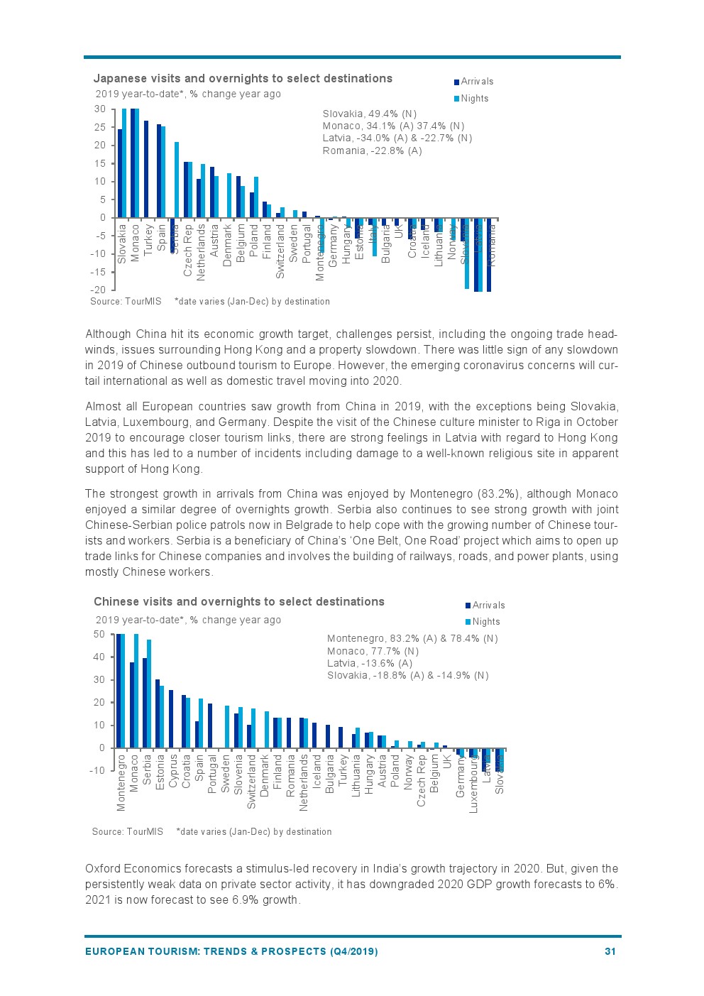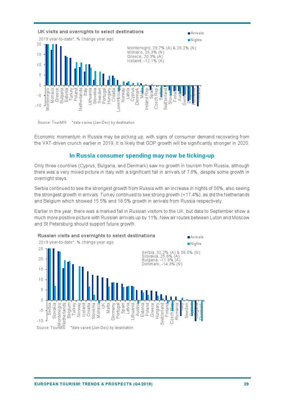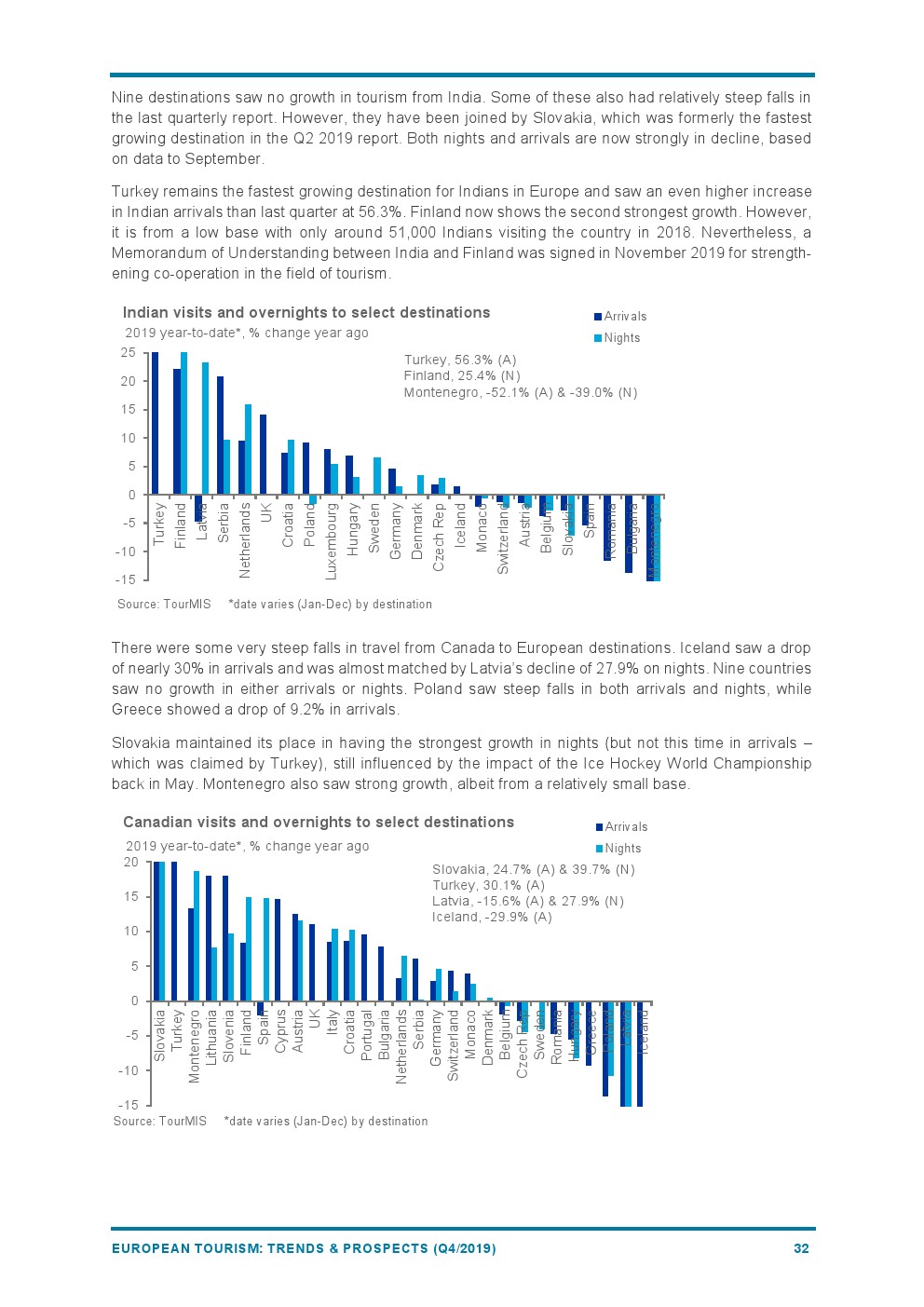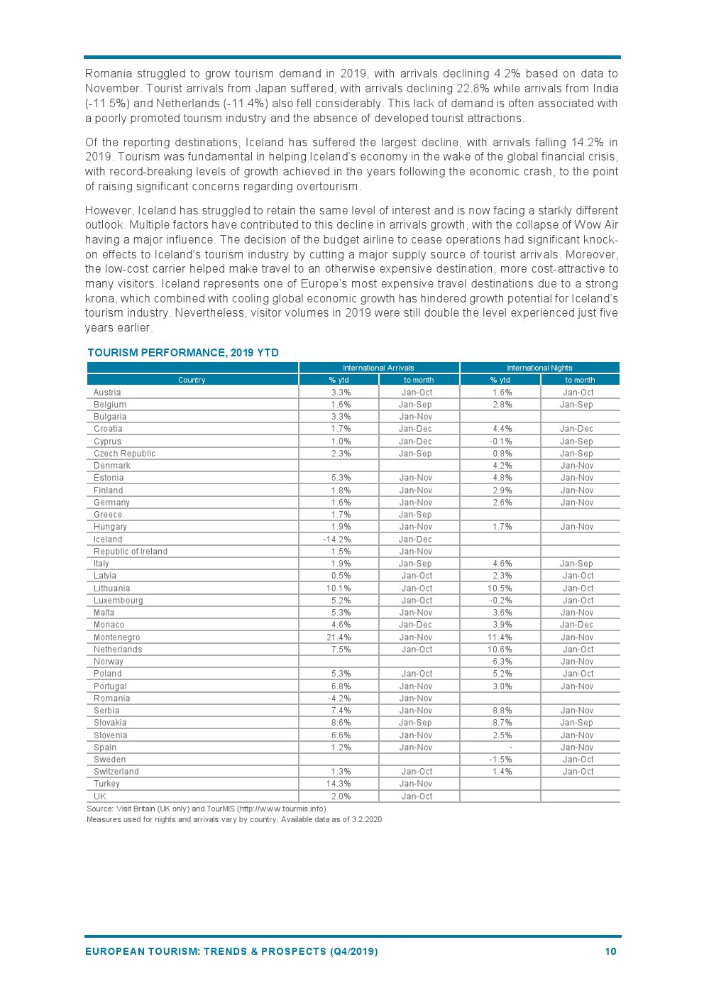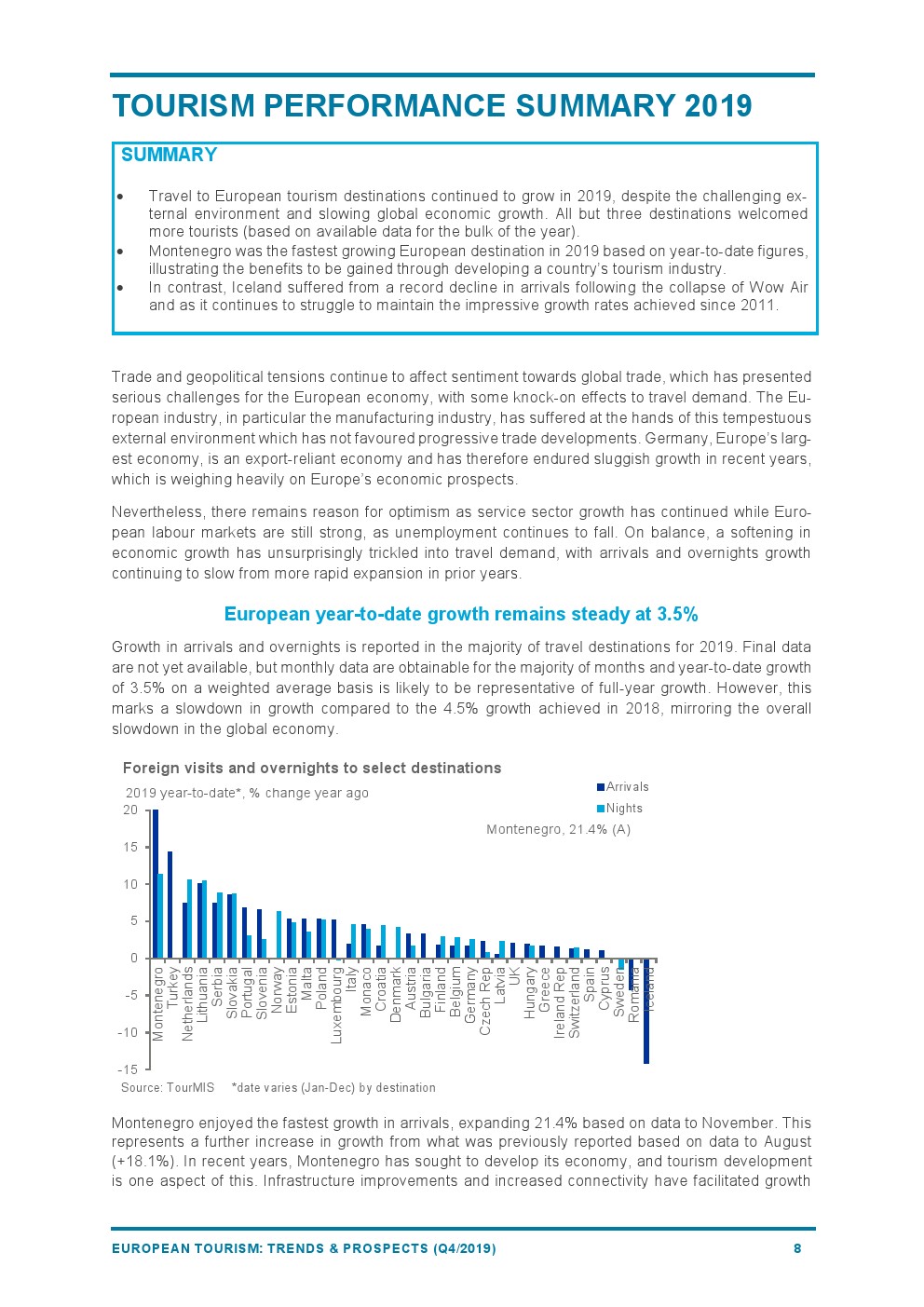 斯洛伐克(+9%)和荷兰(+8%)的表现也好于平均水平。塞尔维亚(+7%)得益于免签证政策和支持性的双边政治和经济关系,享受着来自中国市场的强劲增长。葡萄牙(+7%)成为第一个被授予“2019年无障碍旅游目的地”的国家。罗马尼亚(-4%)由于基础设施等挑战阻碍了旅游增长。抵达冰岛的游客急剧下降(-14%),是所有目的地中降幅最大的。