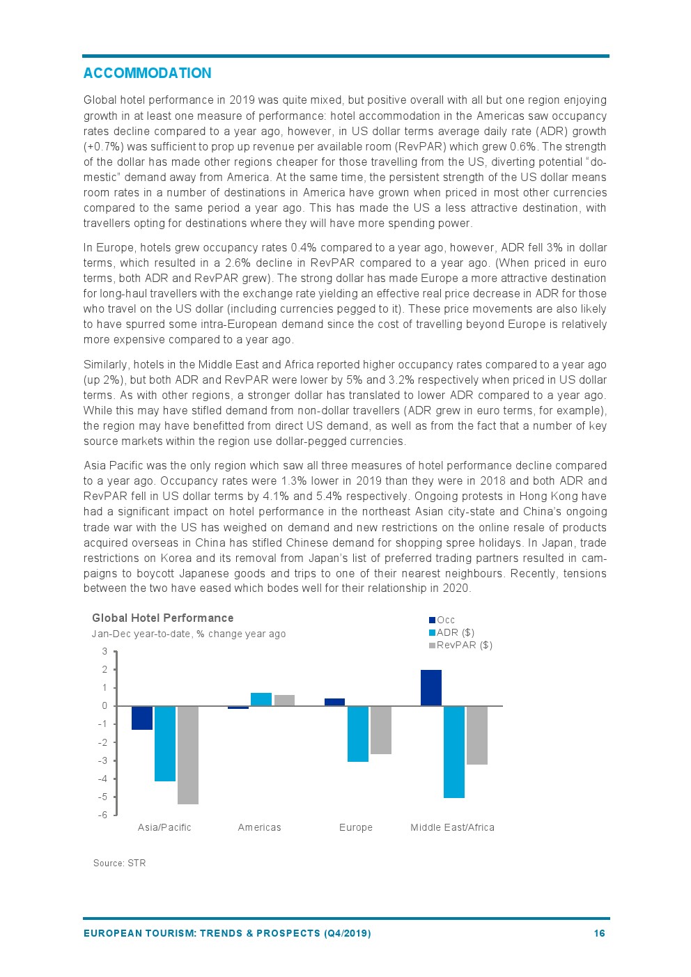 另一方面,与2018年相比,欧洲住宿行业表现积极,入住率上升0.4%,已售客房平均房价(ADR)和每间可售房收入(RevPAR)分别增长2.1%和2.5%。