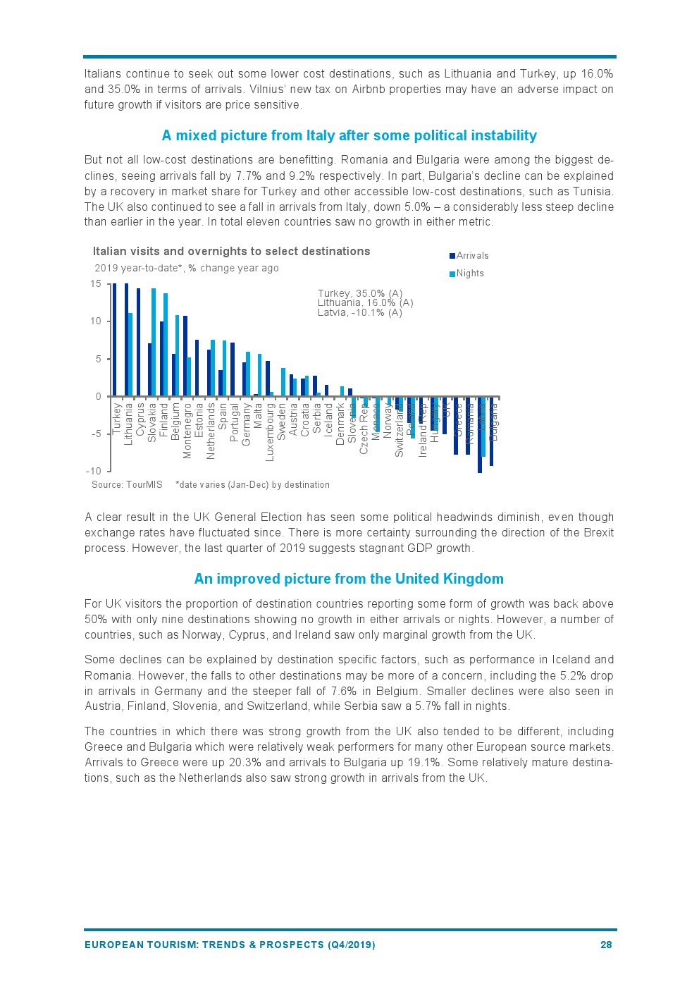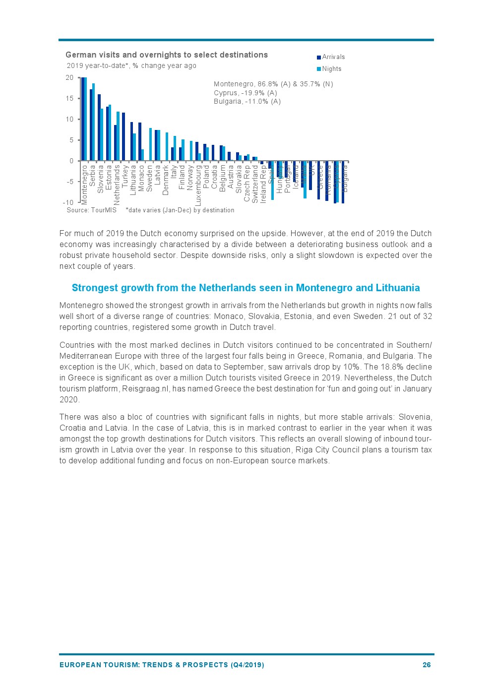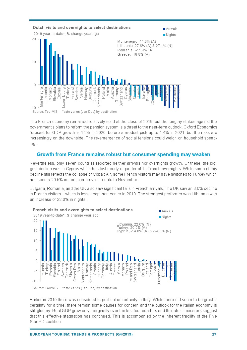 最新数据显示,旅游胜地的抵港人数或过夜人数都在增长,尽管增长速度低于前几年。只有三个目的地的增长率超过10%:黑山(+21%)享受着强劲的增长势头;土耳其(+14%)将在2020年投入巨资推广旅游多样化;立陶宛的强劲表现(+10%)是由连通性推动的。