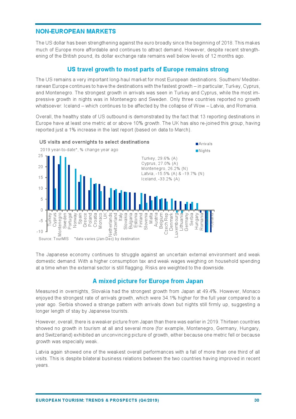 截至2019年底,绝大多数欧洲国家的美国游客人数都有所增加,其中增长最快的是土耳其(+30%)、塞浦路斯(+27%)和黑山(+26%)。