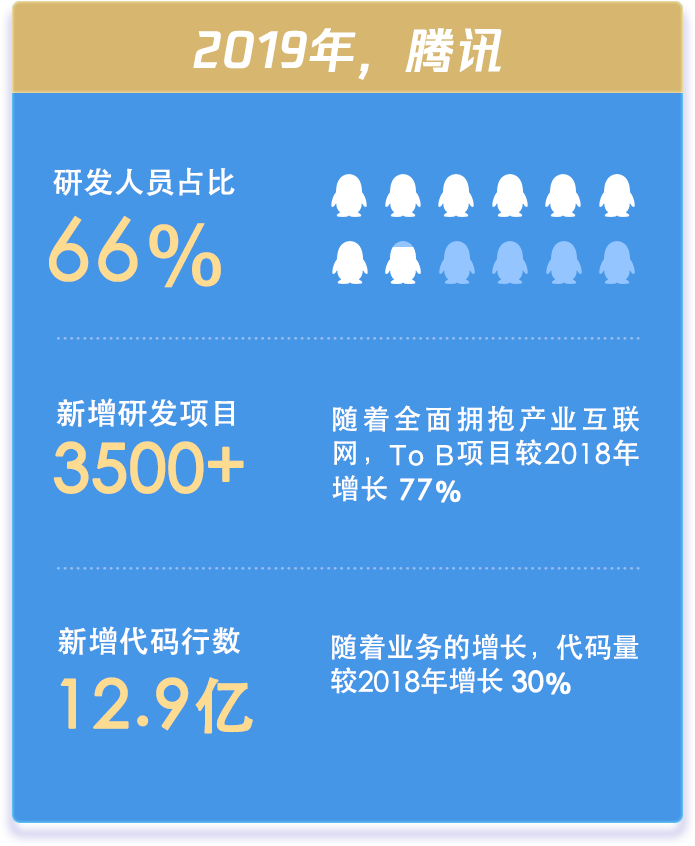 腾讯研发大数据报告 报告显示: 2019年,腾讯研发人员占比达66%; 随着全面拥抱产业互联网,腾讯的To B项目较2018年增长77%; 腾讯新增代码 12.9 亿行,相比 2018 年增长30%; 腾讯每天完成需求近4000个,46%的Bug能在1天内解决。 更多阅读:中国电信:2017年度全网通终端大数据报告好租:2018联合办公发展大数据报告联通:2019年春节大数据报告国庆假期微信大数据报告2016年5月酷云大数据报告2016美国白宫大数据报告:算法系统、机会与公民权利腾讯:2025年研发数据报告显示AI编程助手使用率超90%腾讯:2020年度腾讯研发大数据报告中国旅游研究院:2019上半年中国游客赴欧洲旅游大数据报告天天拍车:2018年度个人卖车大数据报告勾正数据:2019年4月智能电视大数据报告货拉拉:2018搬家大数据报告时代正燃 | 全民健身运动意图大数据报告2016年PornHub大数据报告(附完整版下载)妈妈网:2014年母婴消费行为大数据报告