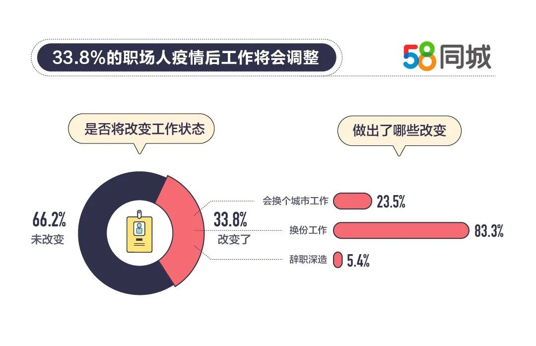 据58同城《2020年就业趋势调研报告》显示,此次疫情结束后,将有33.8%的职场人计划改变工作状态。其中,83.3%选择在当地城市换工作,23.5%选择去其他城市换工作,还有5.4%选择辞职学习深造。