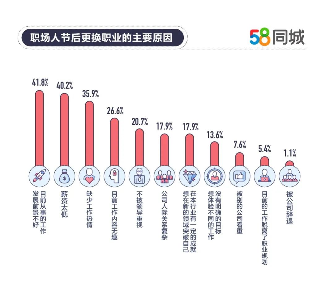58同城《2020年就业趋势调研报告》显示,想要挑战自己和寻找更多机会是影响职场人选择改变工作状态的首要原因。疫情后调整工作状态的职场人中,41.8%是因为从事的工作发展前景不好,40.2%是因为薪资太低,35.9%是因为缺少工作热情。