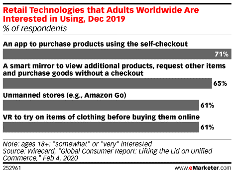 虽然还不是主流,但这种“直接走出去”的体验是许多购物者都感兴趣的。Wirecard在2019年12月对全球成年人进行了调查,询问他们有兴趣使用哪些零售技术。大多数受访者选择了自助结账体验。超过70%的受访者对使用即扫即走应用感兴趣,61%的受访者至少对无人商店的想法有一定的兴趣。