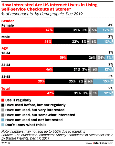 许多成年人已经尝试过这个选项。在Bizrate Insights 2019年12月的一项调查中,近一半的受访者(47%)经常使用自助结账;31%的受访者以前使用过,尽管频率没有那么高。只有2%的受访者不知道什么是自助结账。千禧一代比年长的人群更有可能经常使用自助结账,尽管相当数量的X世代(46%)和婴儿潮一代(39%)也如此。