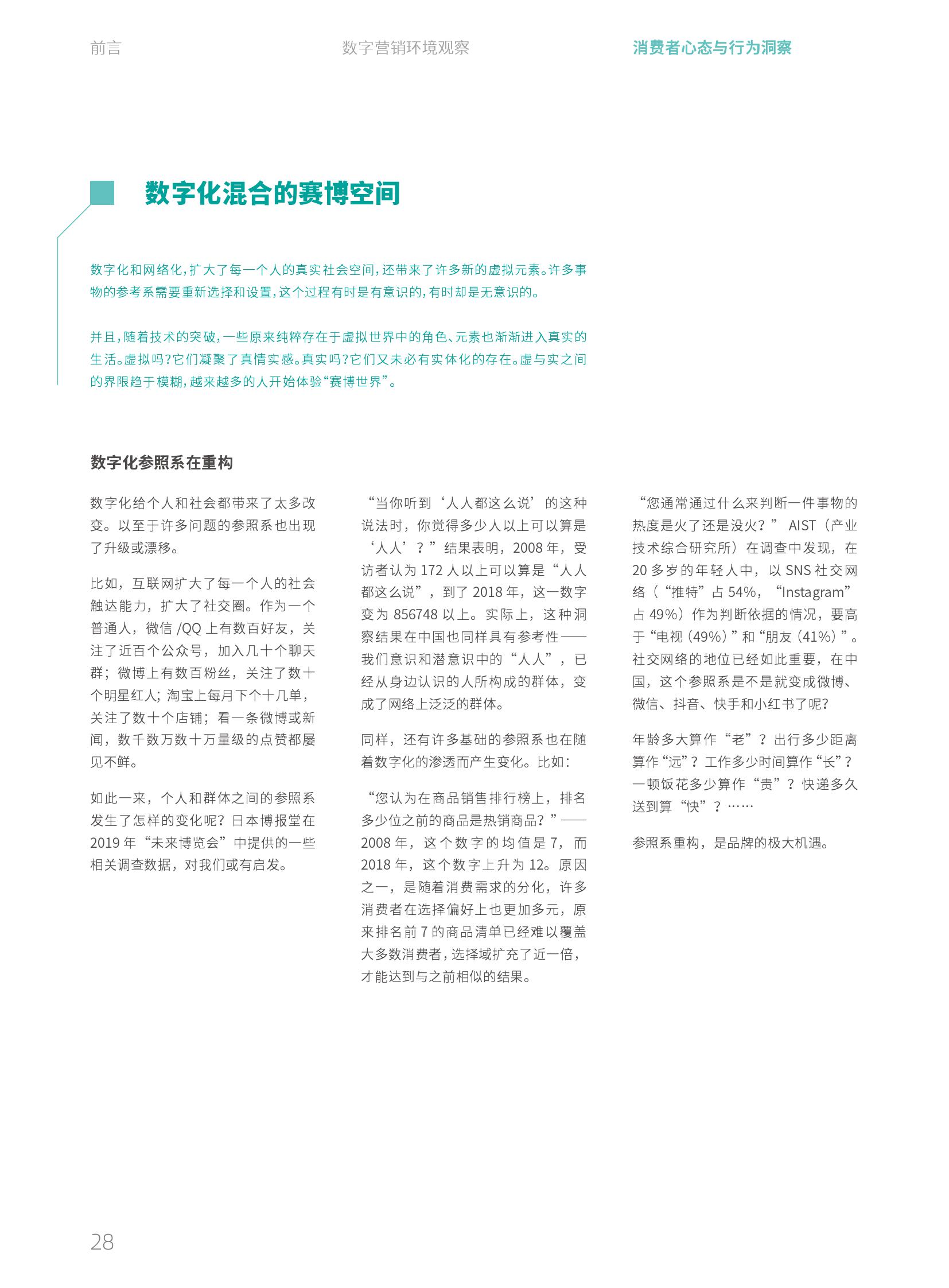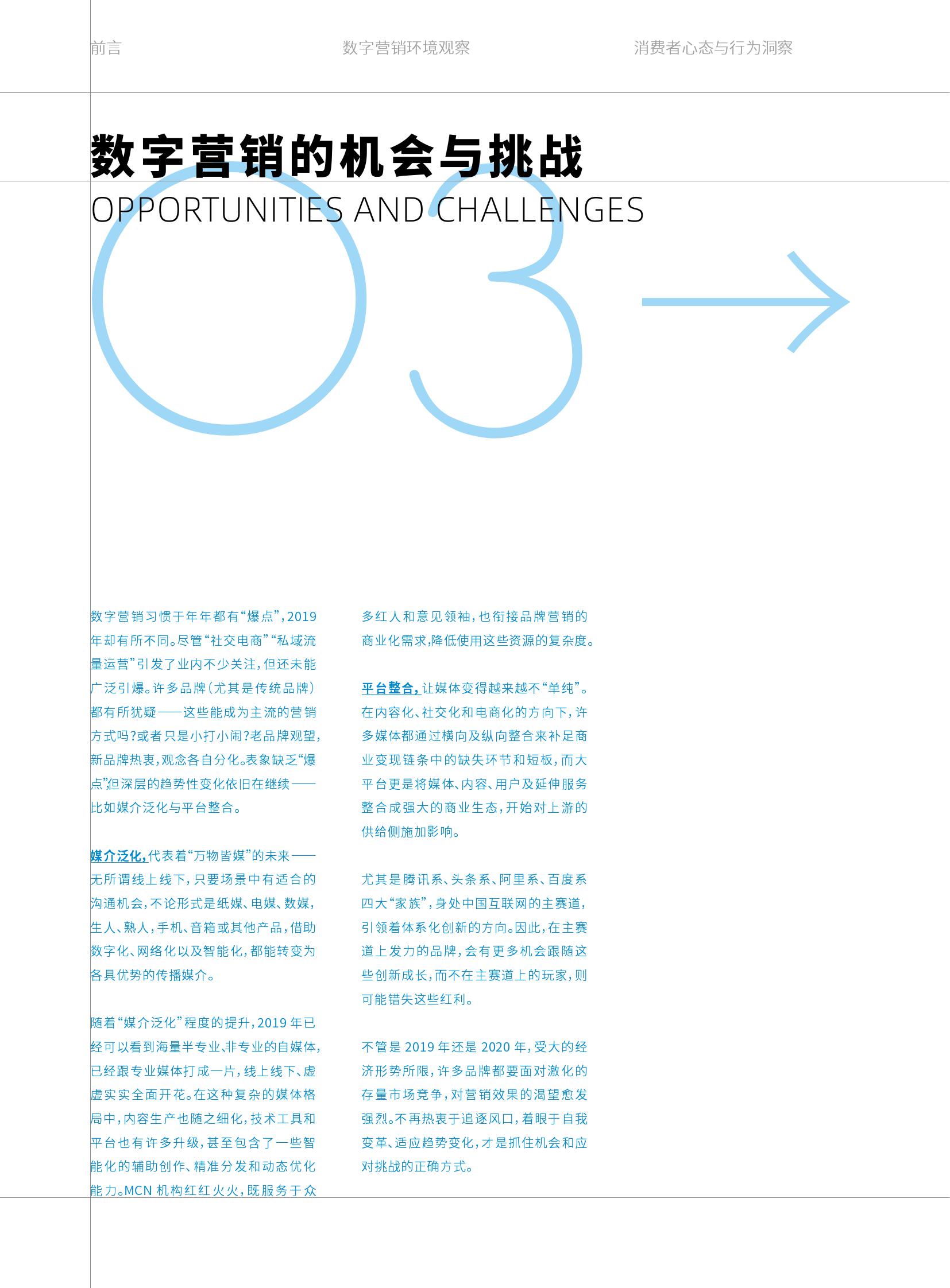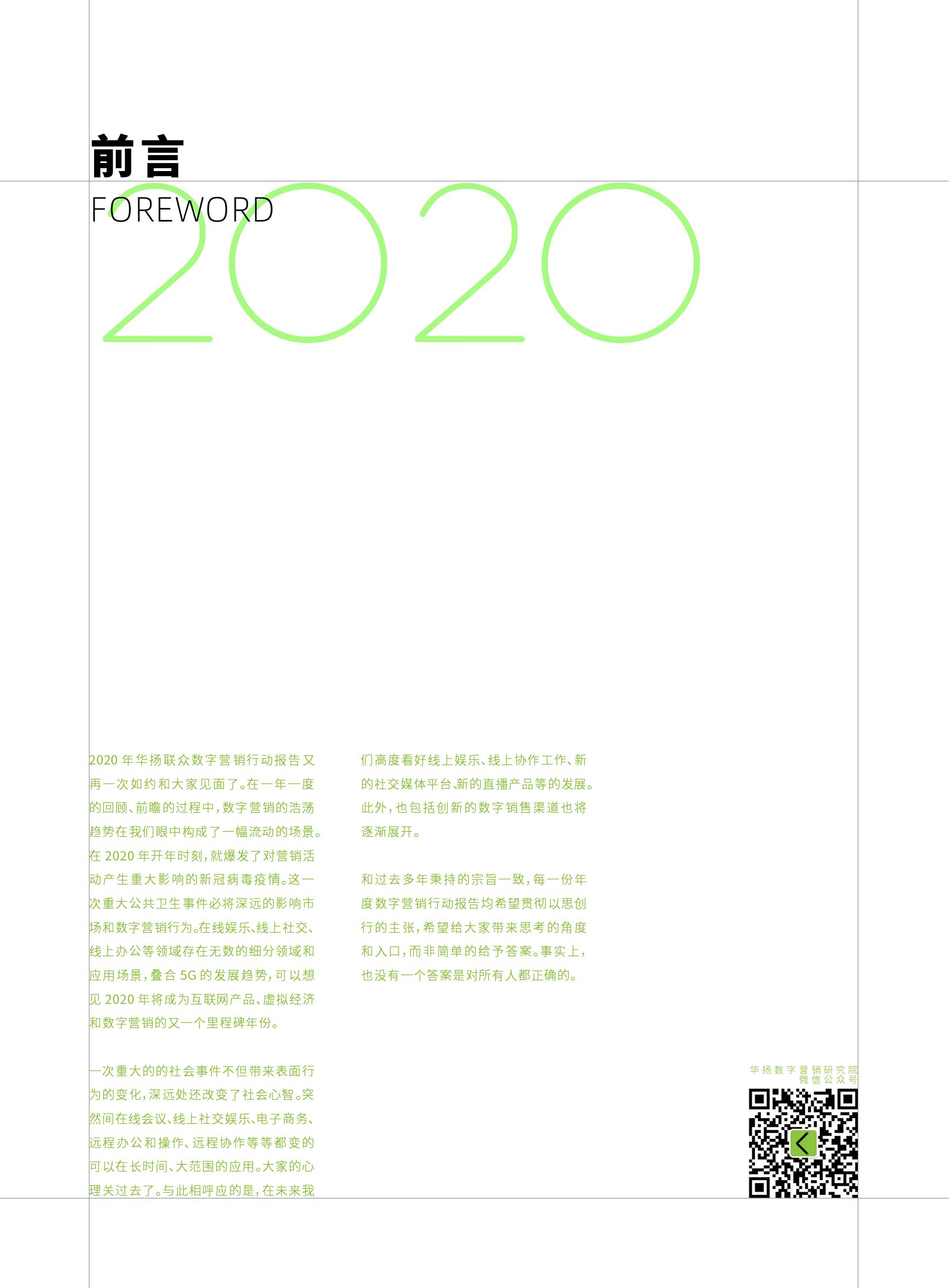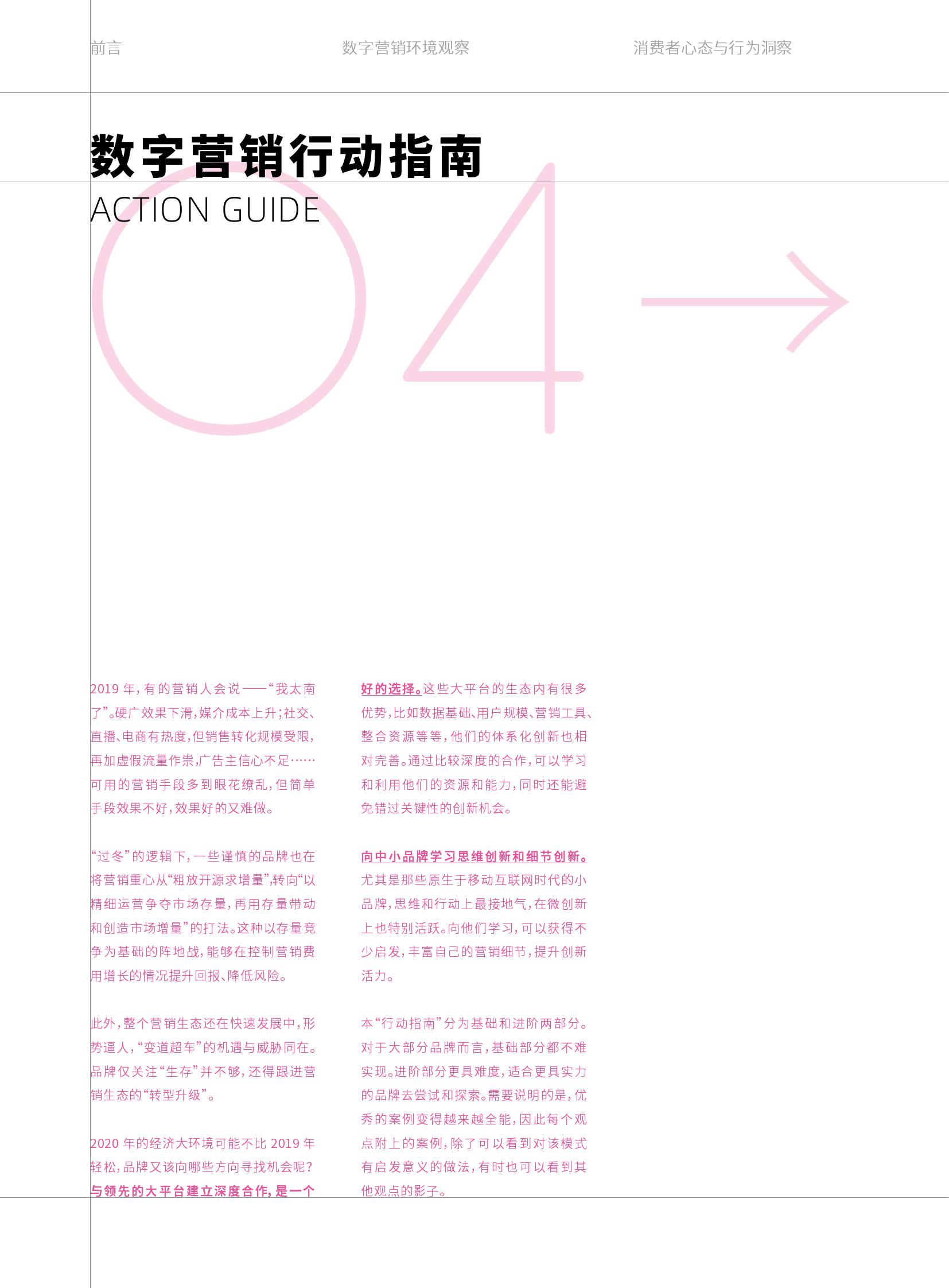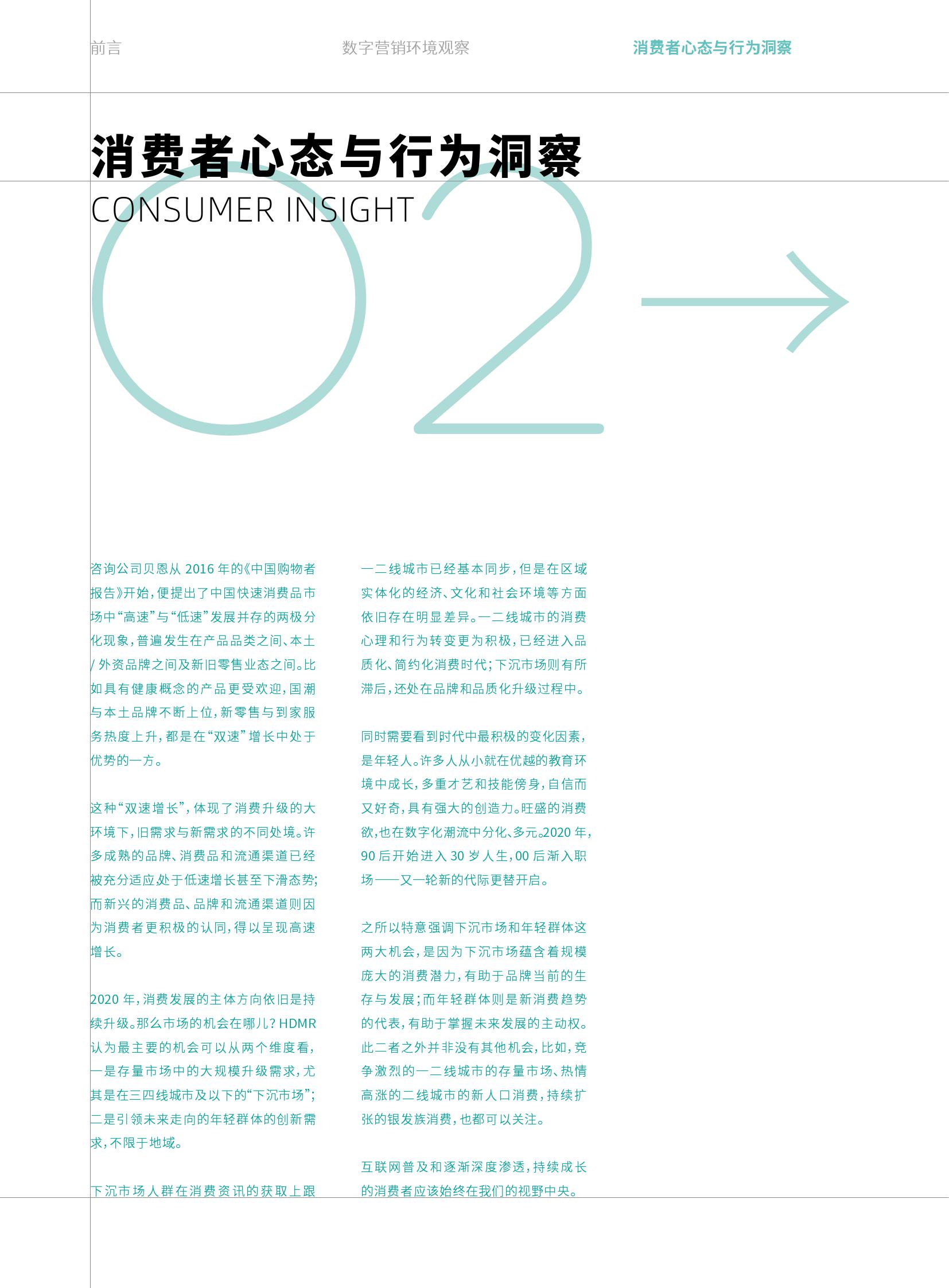 HDMR:2020中国数字营销行动报告 2020年消费发展的主体方向依旧是持续升级。 市场的主要机会,一是存量市场中的大规模升级需求,尤其是被称为香饽饽的“下沉市场”;二是引领未来走向的年轻群体的创新需求。2020年,90后步入30岁,00后初登舞台,新的年轻人正在改演现实。 2020年,我们提倡回归数字营销本身——消费者、媒介、平台等基础因素,深度思考它们所面对的变化和影响,然后形成眼前的对策。 PDF版本将分享到199IT交流群,支持我们发展可加入! 更多阅读:华扬数字:2018中国数字营销行动报告华扬联众:2015年中国数字营销行动报告华扬联众:2014年中国数字营销行动报告消费者品牌报告:寻找真相德勤咨询:2020中国与全球企业人工智能应用现状调研中国旅游研究院:2020中国冰雪旅游发展Falcon:2021年数字营销趋势报告Altimeter:2020年数字营销状况报告Salesforce:2021年营销报告CMO和C级高管报告:伙伴关系的基因Ascend2:2021年意图数据报告HCR:数字营销创新应用及趋势研究报告数字营销之战: 首席营销官(CMO)Vs.首席信息官(CIO)Razorfish:2015年全球数字营销报告Adobe:2014亚太区数字营销业绩报告
