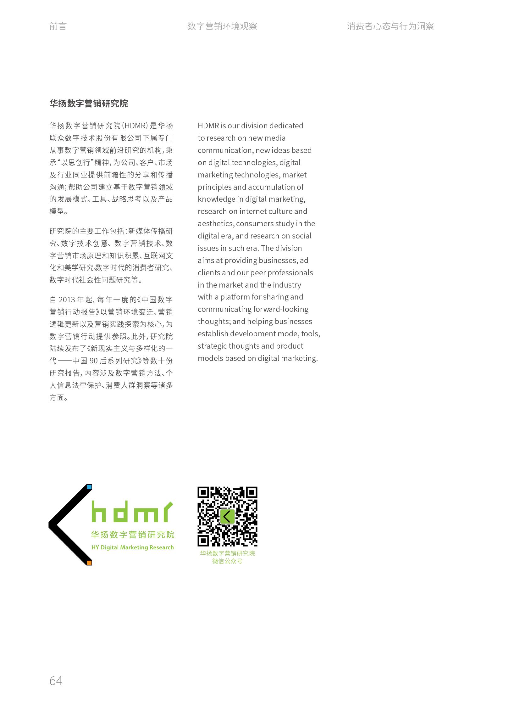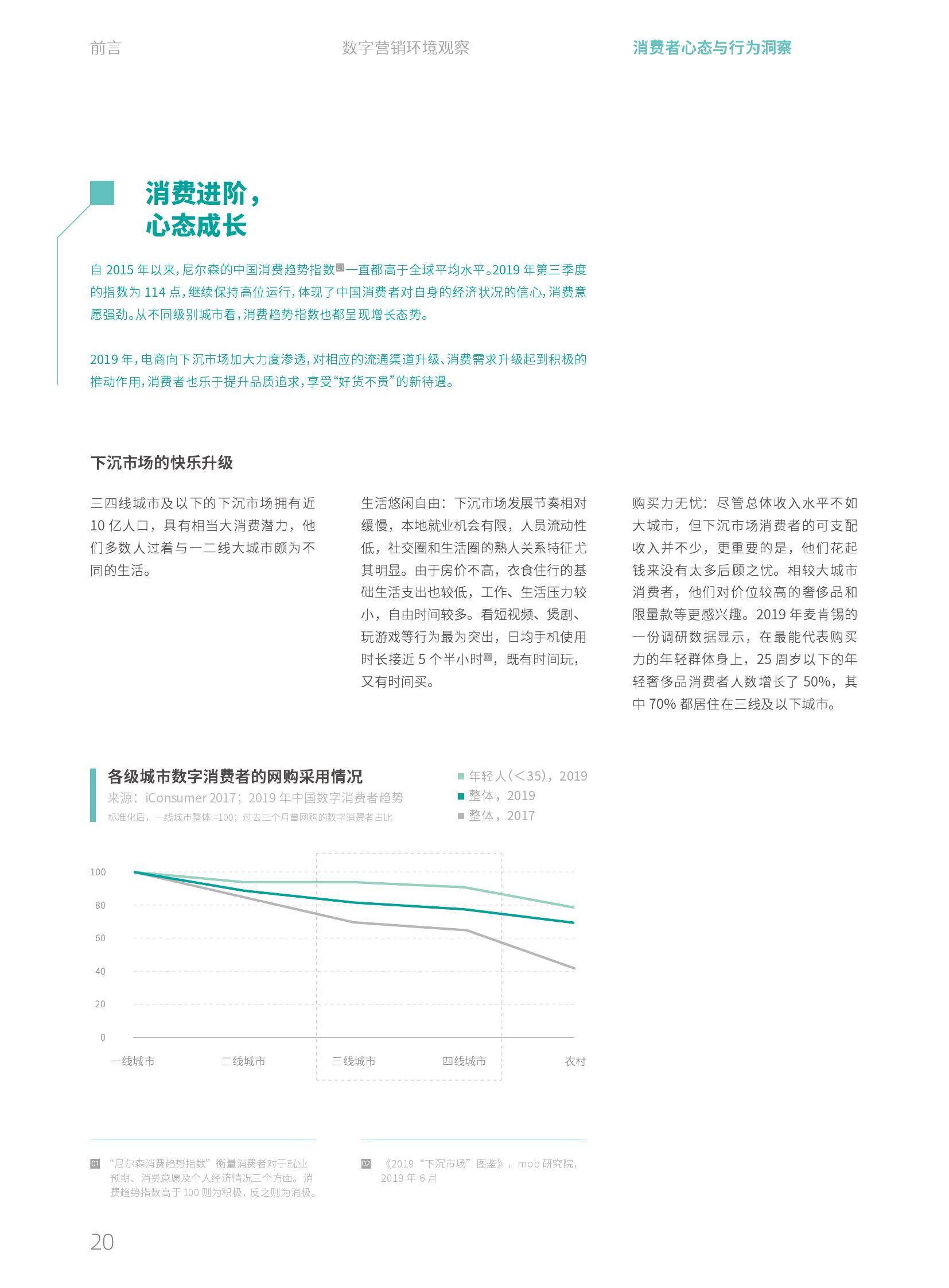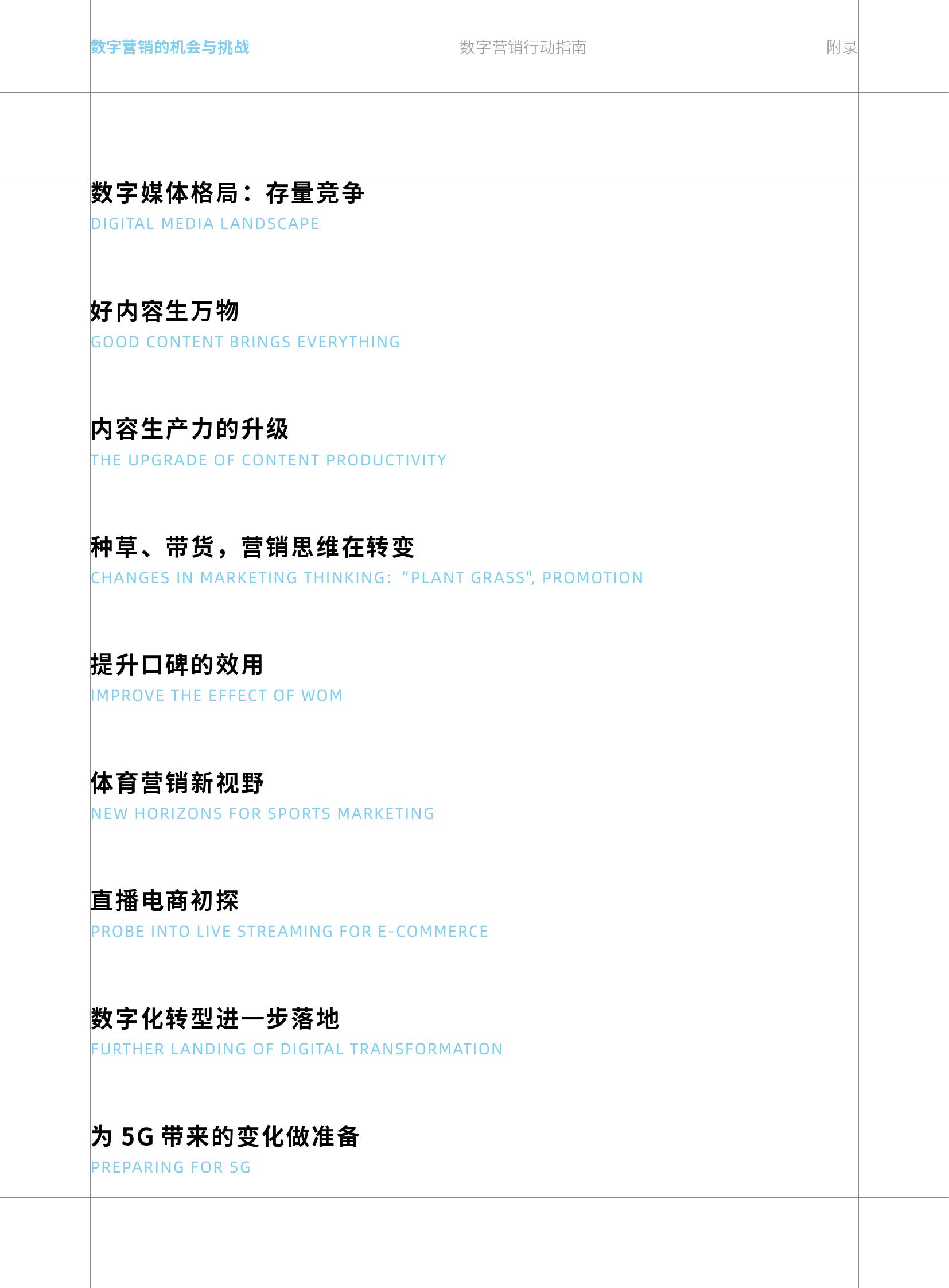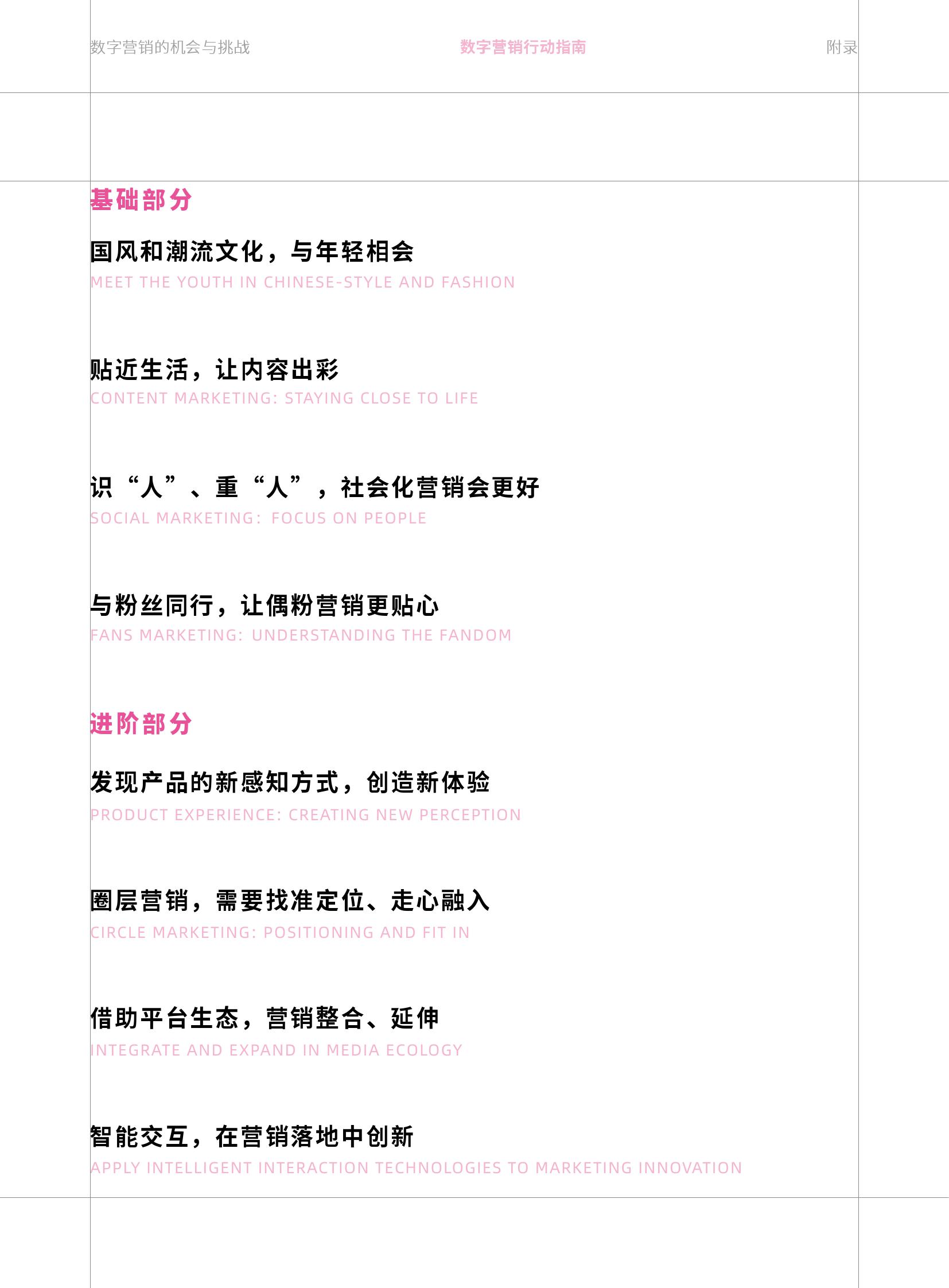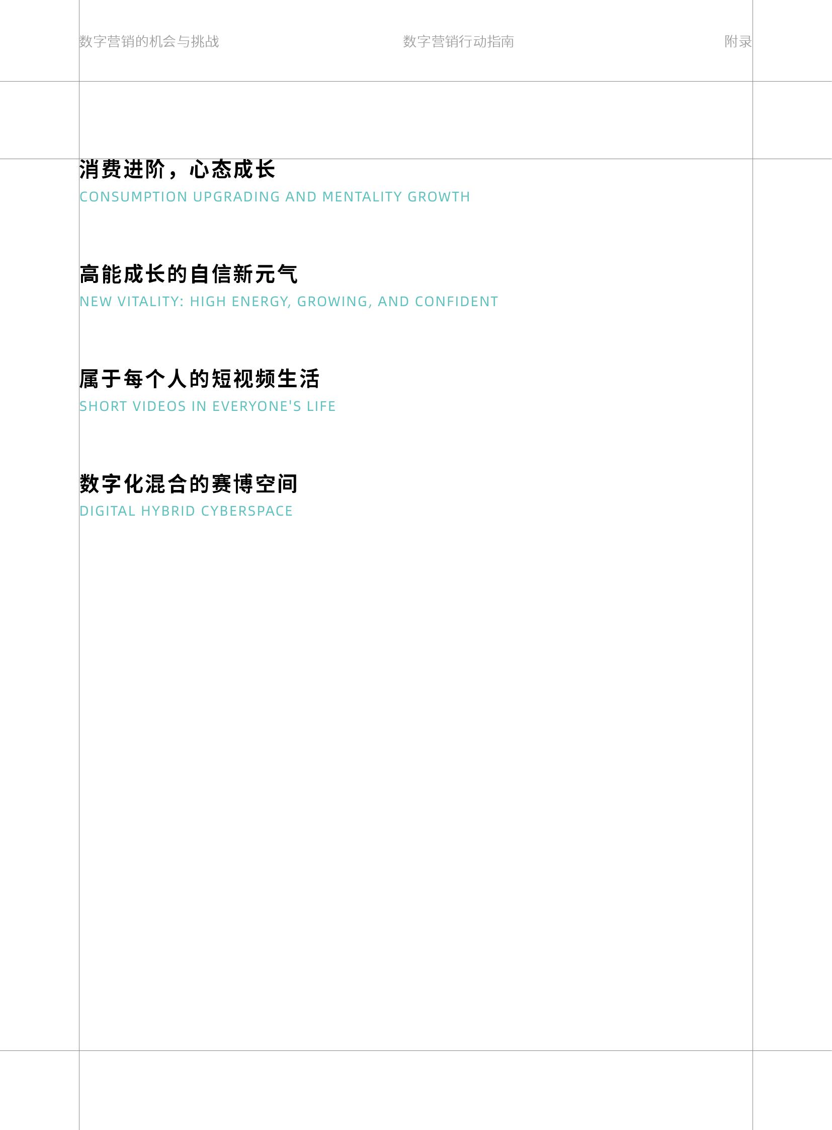 HDMR:2020中国数字营销行动报告 2020年消费发展的主体方向依旧是持续升级。 市场的主要机会,一是存量市场中的大规模升级需求,尤其是被称为香饽饽的“下沉市场”;二是引领未来走向的年轻群体的创新需求。2020年,90后步入30岁,00后初登舞台,新的年轻人正在改演现实。 2020年,我们提倡回归数字营销本身——消费者、媒介、平台等基础因素,深度思考它们所面对的变化和影响,然后形成眼前的对策。 PDF版本将分享到199IT交流群,支持我们发展可加入! 更多阅读:华扬数字:2018中国数字营销行动报告华扬联众:2015年中国数字营销行动报告华扬联众:2014年中国数字营销行动报告消费者品牌报告:寻找真相德勤咨询:2020中国与全球企业人工智能应用现状调研中国旅游研究院:2020中国冰雪旅游发展Falcon:2021年数字营销趋势报告Altimeter:2020年数字营销状况报告Salesforce:2021年营销报告CMO和C级高管报告:伙伴关系的基因Ascend2:2021年意图数据报告HCR:数字营销创新应用及趋势研究报告数字营销之战: 首席营销官(CMO)Vs.首席信息官(CIO)Razorfish:2015年全球数字营销报告Adobe:2014亚太区数字营销业绩报告