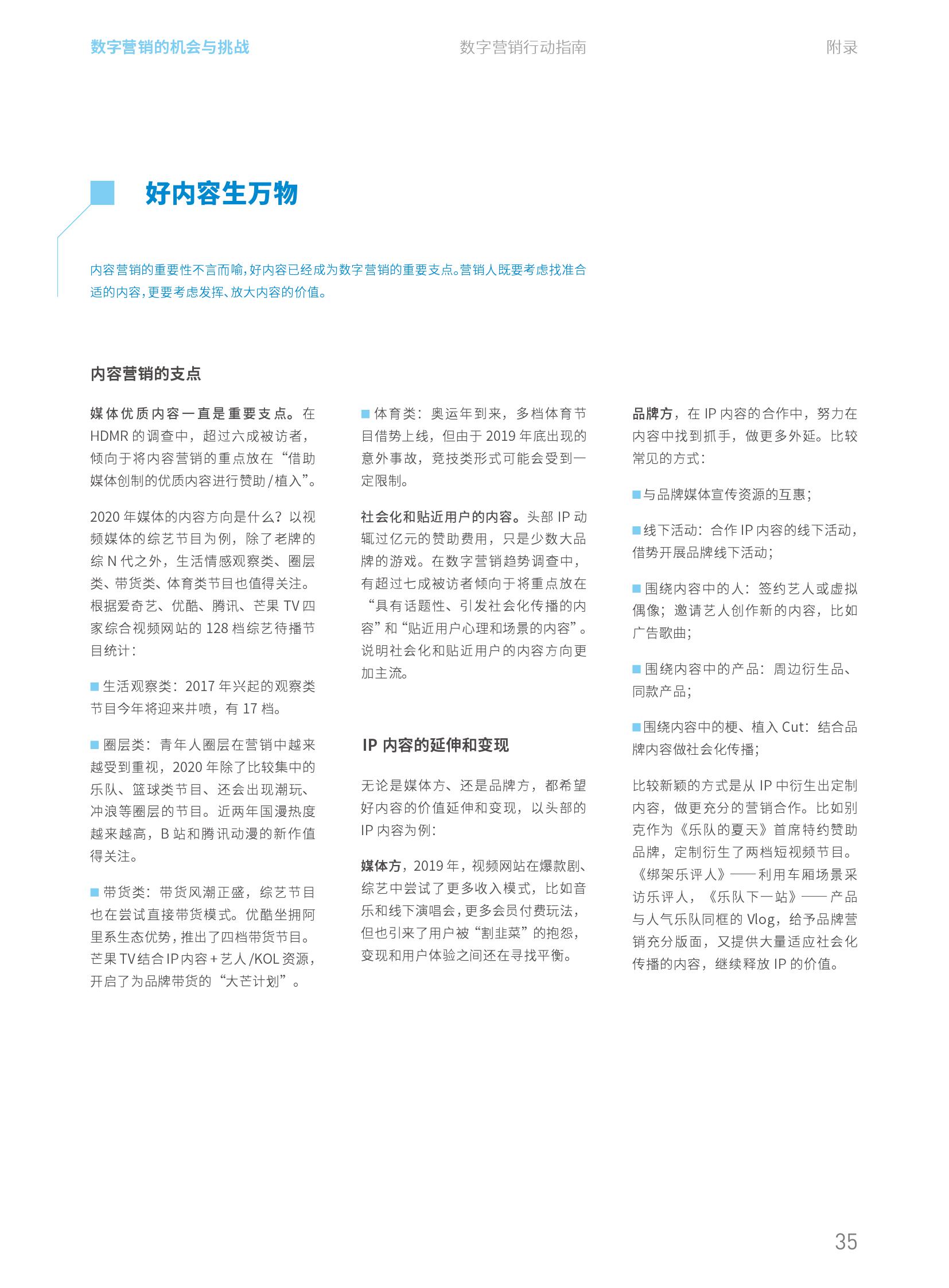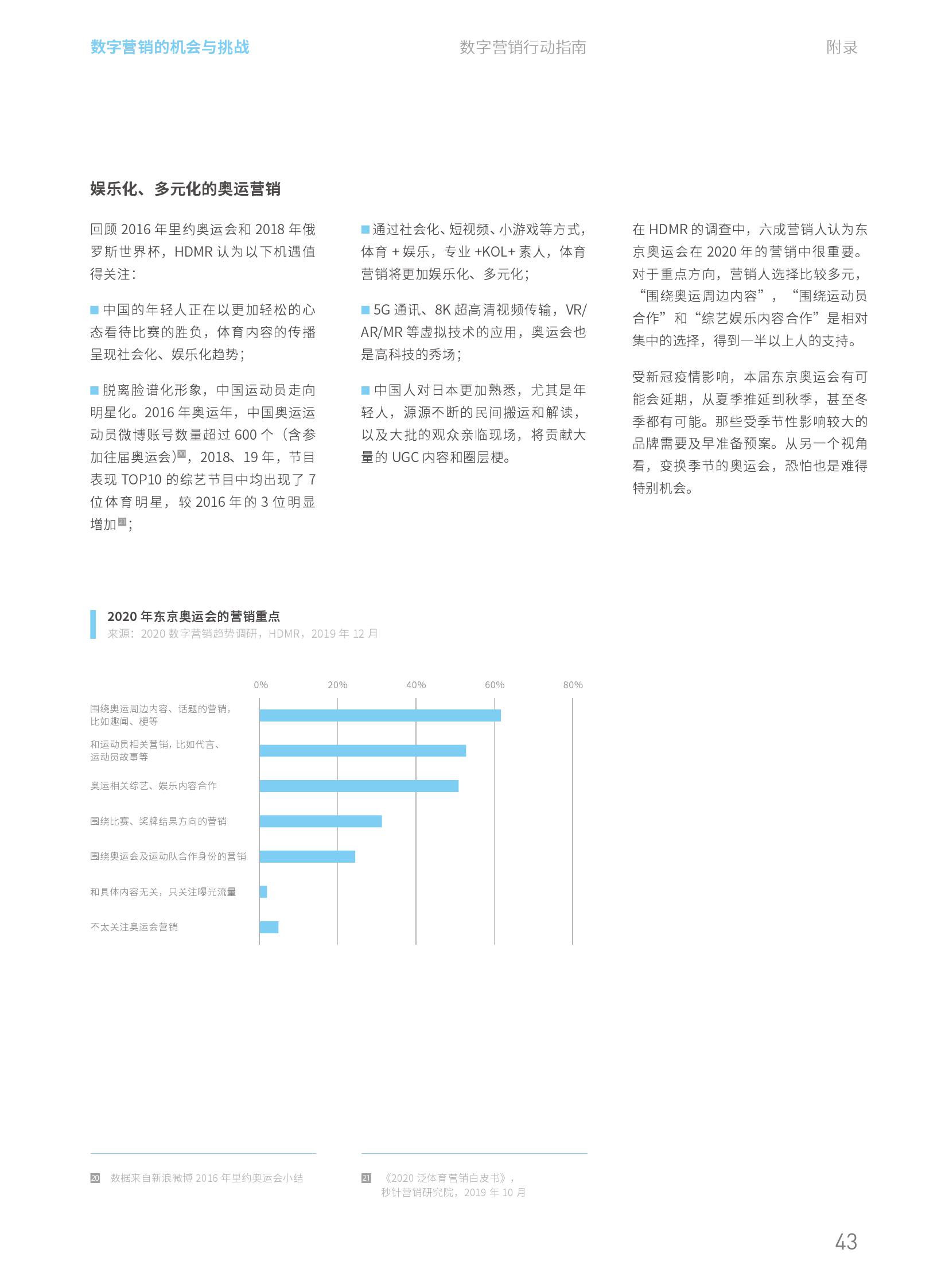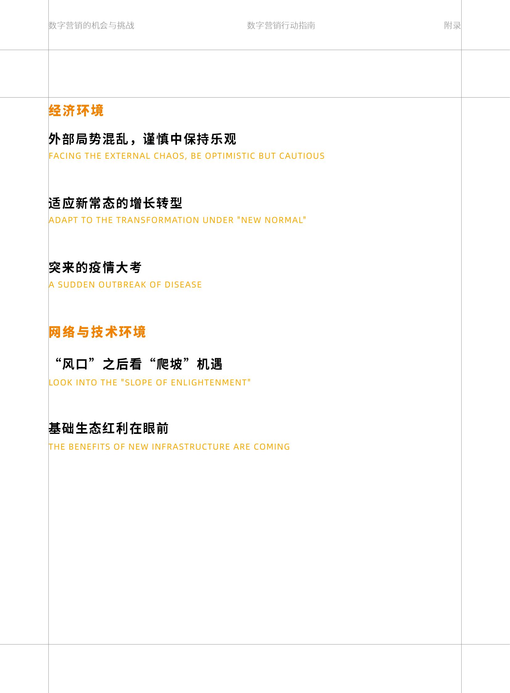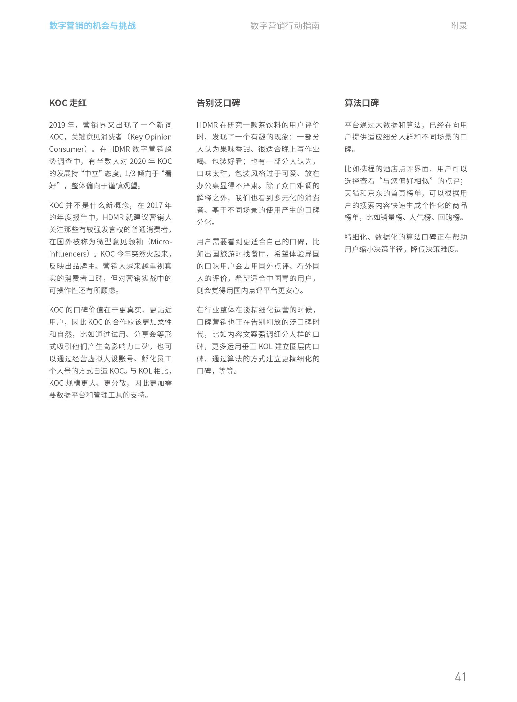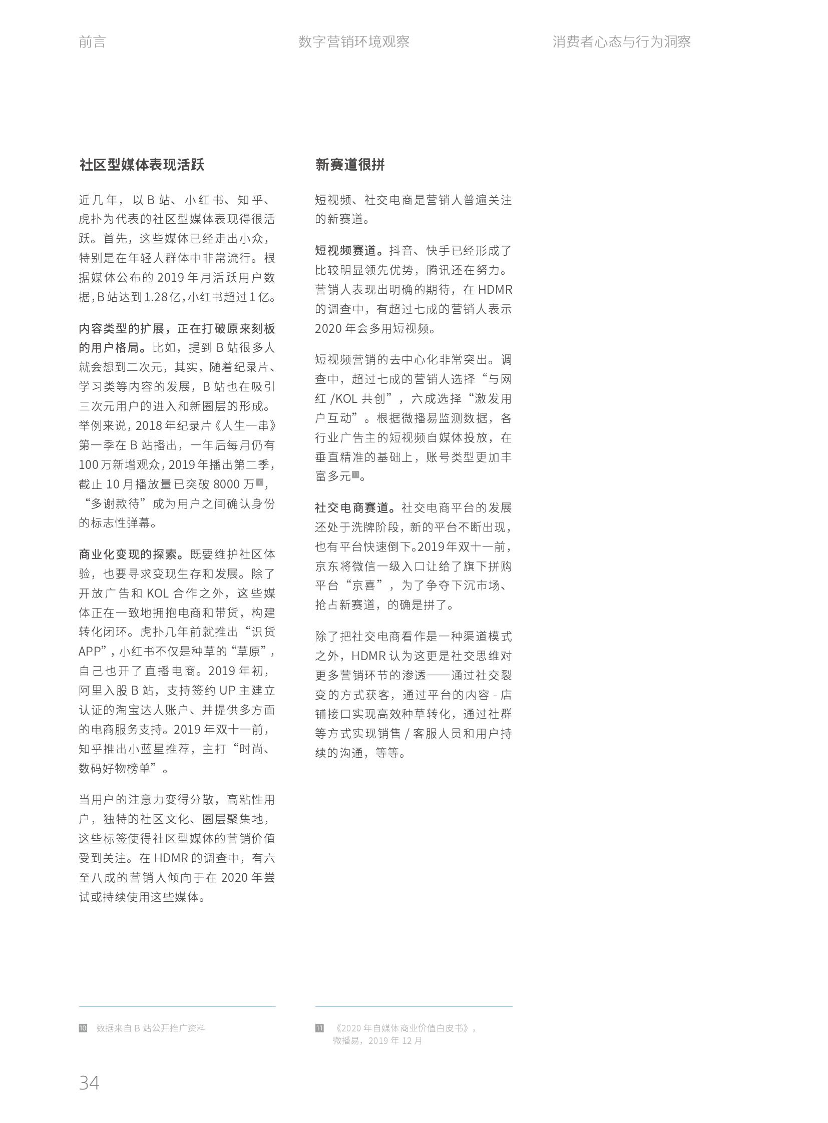 HDMR:2020中国数字营销行动报告 2020年消费发展的主体方向依旧是持续升级。 市场的主要机会,一是存量市场中的大规模升级需求,尤其是被称为香饽饽的“下沉市场”;二是引领未来走向的年轻群体的创新需求。2020年,90后步入30岁,00后初登舞台,新的年轻人正在改演现实。 2020年,我们提倡回归数字营销本身——消费者、媒介、平台等基础因素,深度思考它们所面对的变化和影响,然后形成眼前的对策。 PDF版本将分享到199IT交流群,支持我们发展可加入! 更多阅读:华扬数字:2018中国数字营销行动报告华扬联众:2015年中国数字营销行动报告华扬联众:2014年中国数字营销行动报告消费者品牌报告:寻找真相德勤咨询:2020中国与全球企业人工智能应用现状调研中国旅游研究院:2020中国冰雪旅游发展Falcon:2021年数字营销趋势报告Altimeter:2020年数字营销状况报告Salesforce:2021年营销报告CMO和C级高管报告:伙伴关系的基因Ascend2:2021年意图数据报告HCR:数字营销创新应用及趋势研究报告数字营销之战: 首席营销官(CMO)Vs.首席信息官(CIO)Razorfish:2015年全球数字营销报告Adobe:2014亚太区数字营销业绩报告