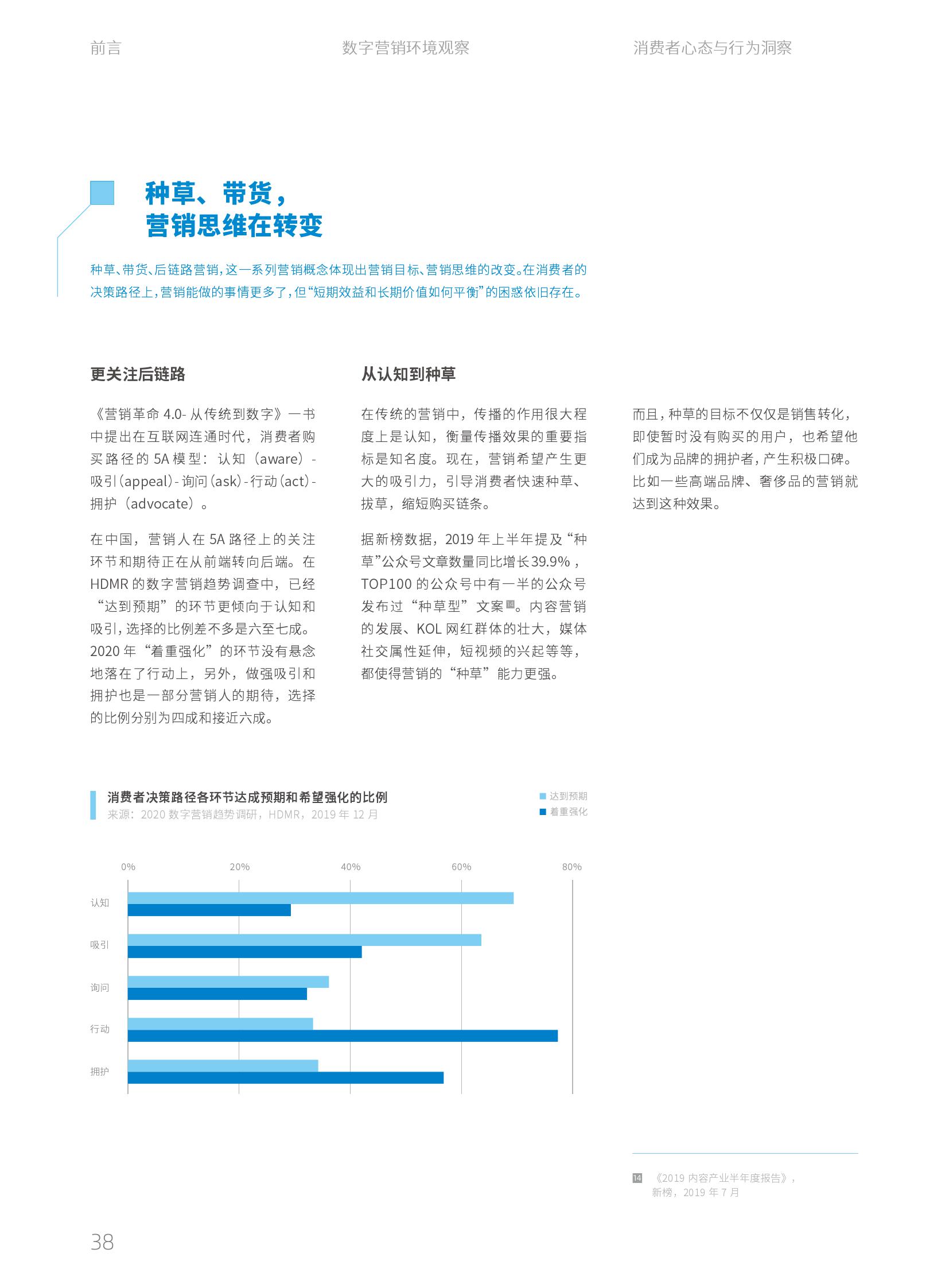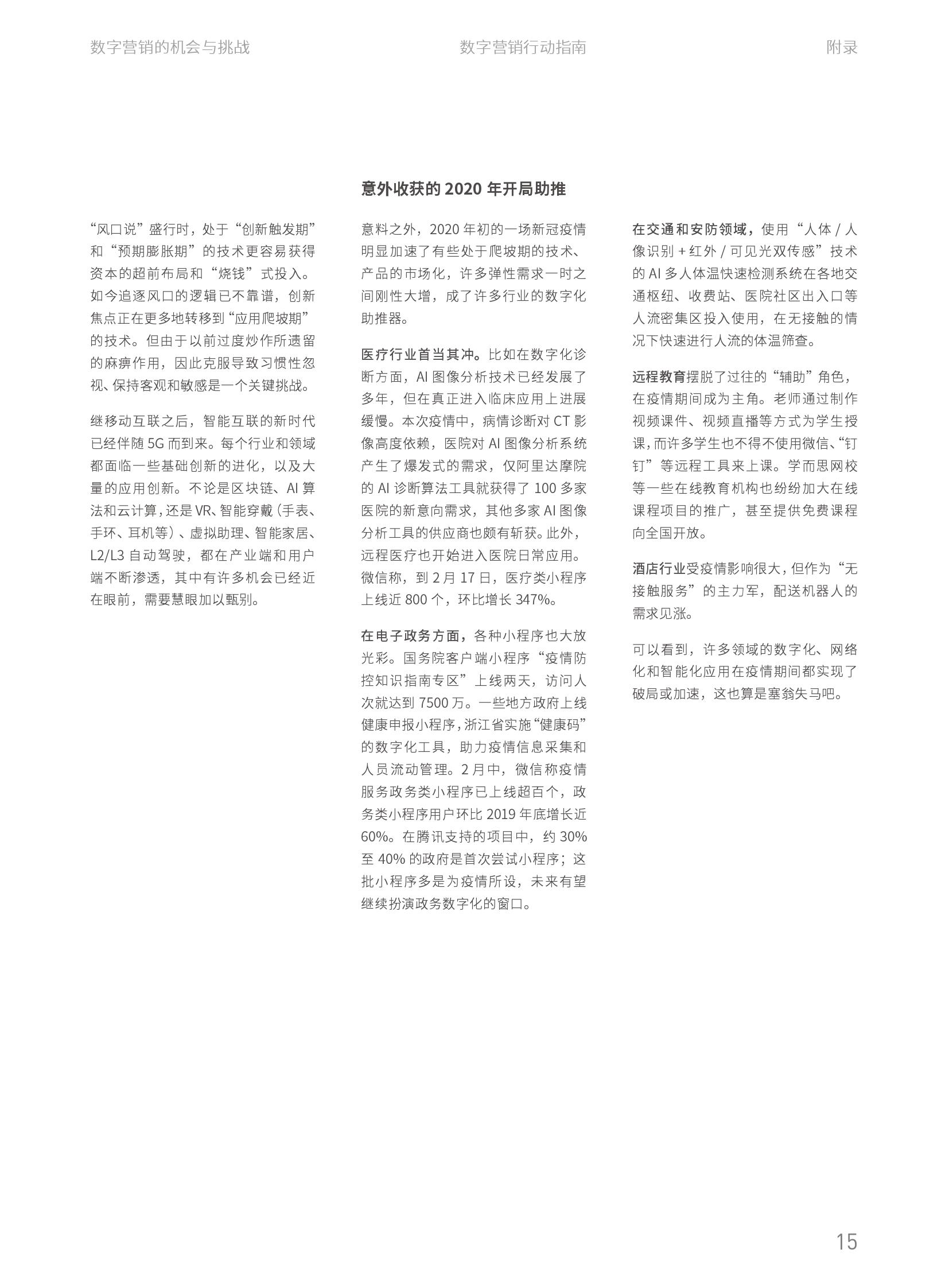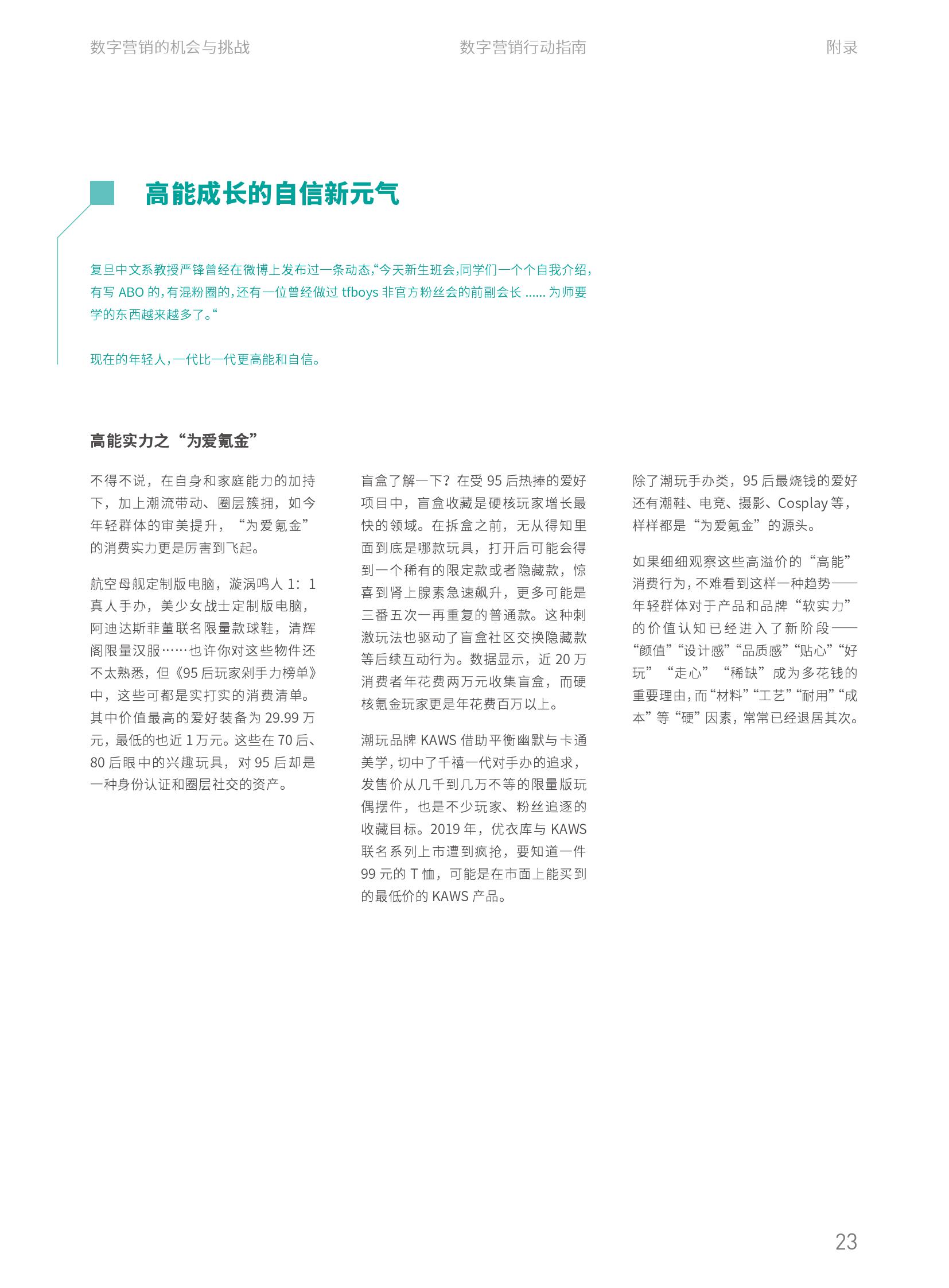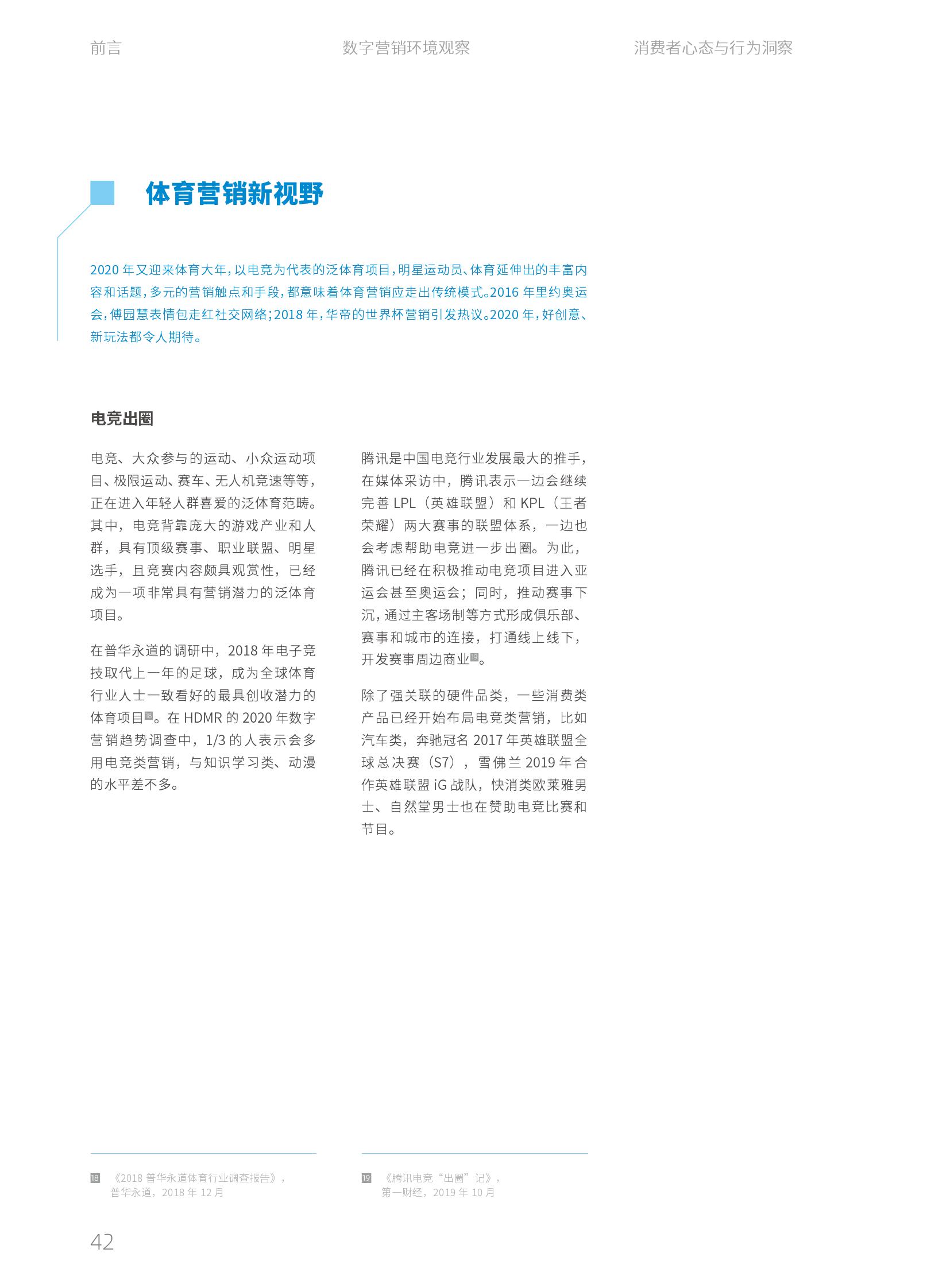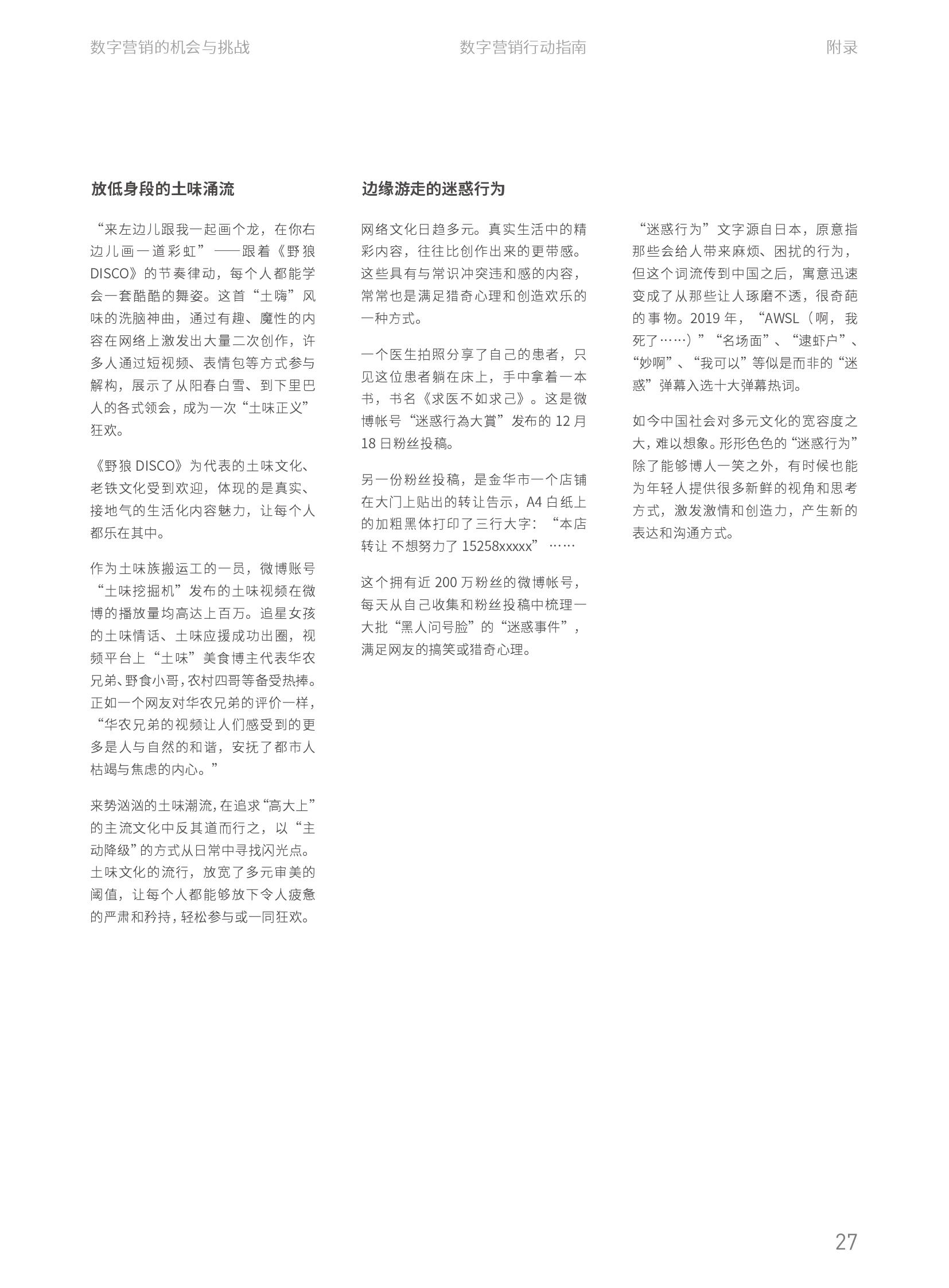 HDMR:2020中国数字营销行动报告 2020年消费发展的主体方向依旧是持续升级。 市场的主要机会,一是存量市场中的大规模升级需求,尤其是被称为香饽饽的“下沉市场”;二是引领未来走向的年轻群体的创新需求。2020年,90后步入30岁,00后初登舞台,新的年轻人正在改演现实。 2020年,我们提倡回归数字营销本身——消费者、媒介、平台等基础因素,深度思考它们所面对的变化和影响,然后形成眼前的对策。 PDF版本将分享到199IT交流群,支持我们发展可加入! 更多阅读:华扬数字:2018中国数字营销行动报告华扬联众:2015年中国数字营销行动报告华扬联众:2014年中国数字营销行动报告消费者品牌报告:寻找真相德勤咨询:2020中国与全球企业人工智能应用现状调研中国旅游研究院:2020中国冰雪旅游发展Falcon:2021年数字营销趋势报告Altimeter:2020年数字营销状况报告Salesforce:2021年营销报告CMO和C级高管报告:伙伴关系的基因Ascend2:2021年意图数据报告HCR:数字营销创新应用及趋势研究报告数字营销之战: 首席营销官(CMO)Vs.首席信息官(CIO)Razorfish:2015年全球数字营销报告Adobe:2014亚太区数字营销业绩报告