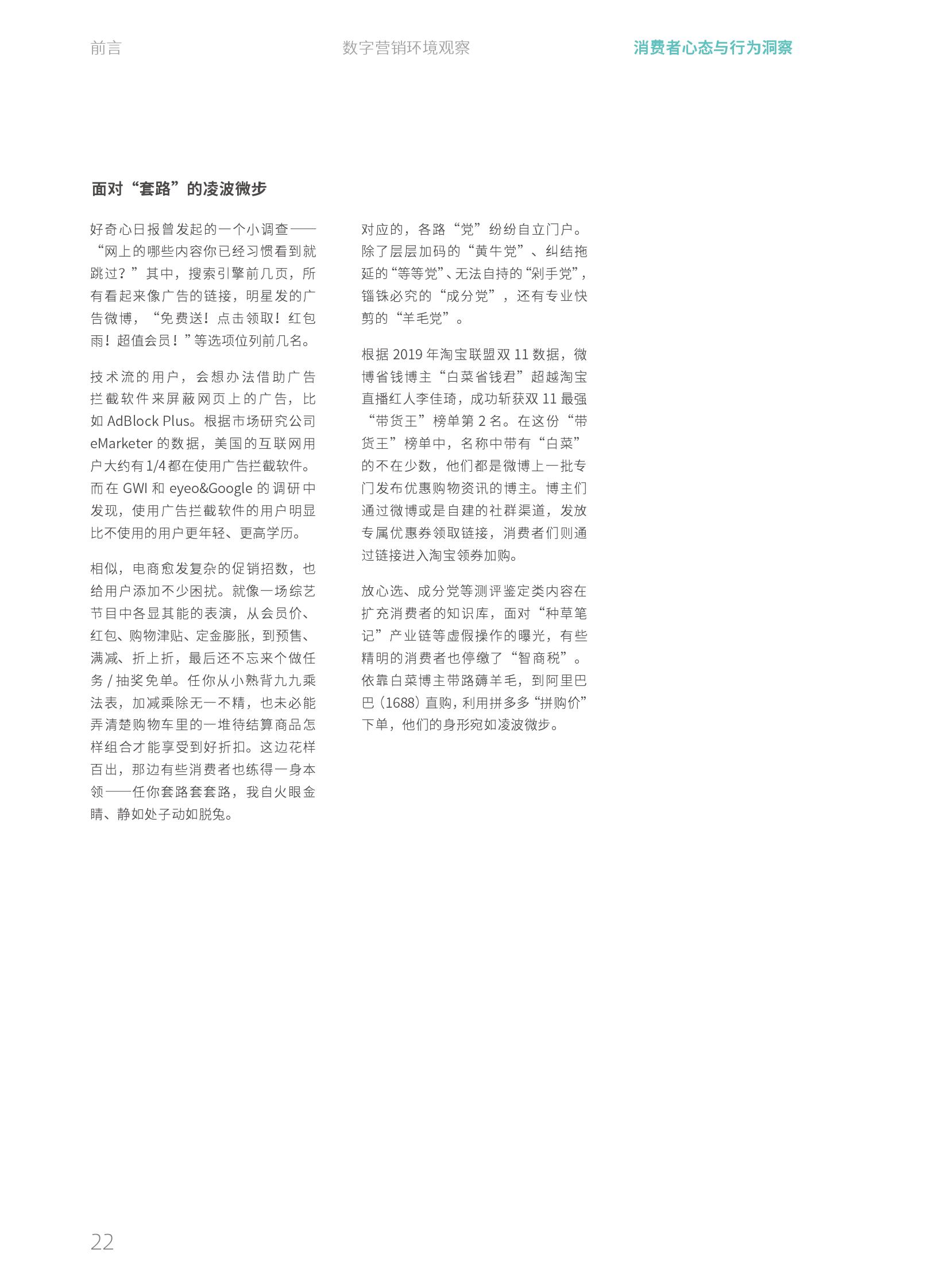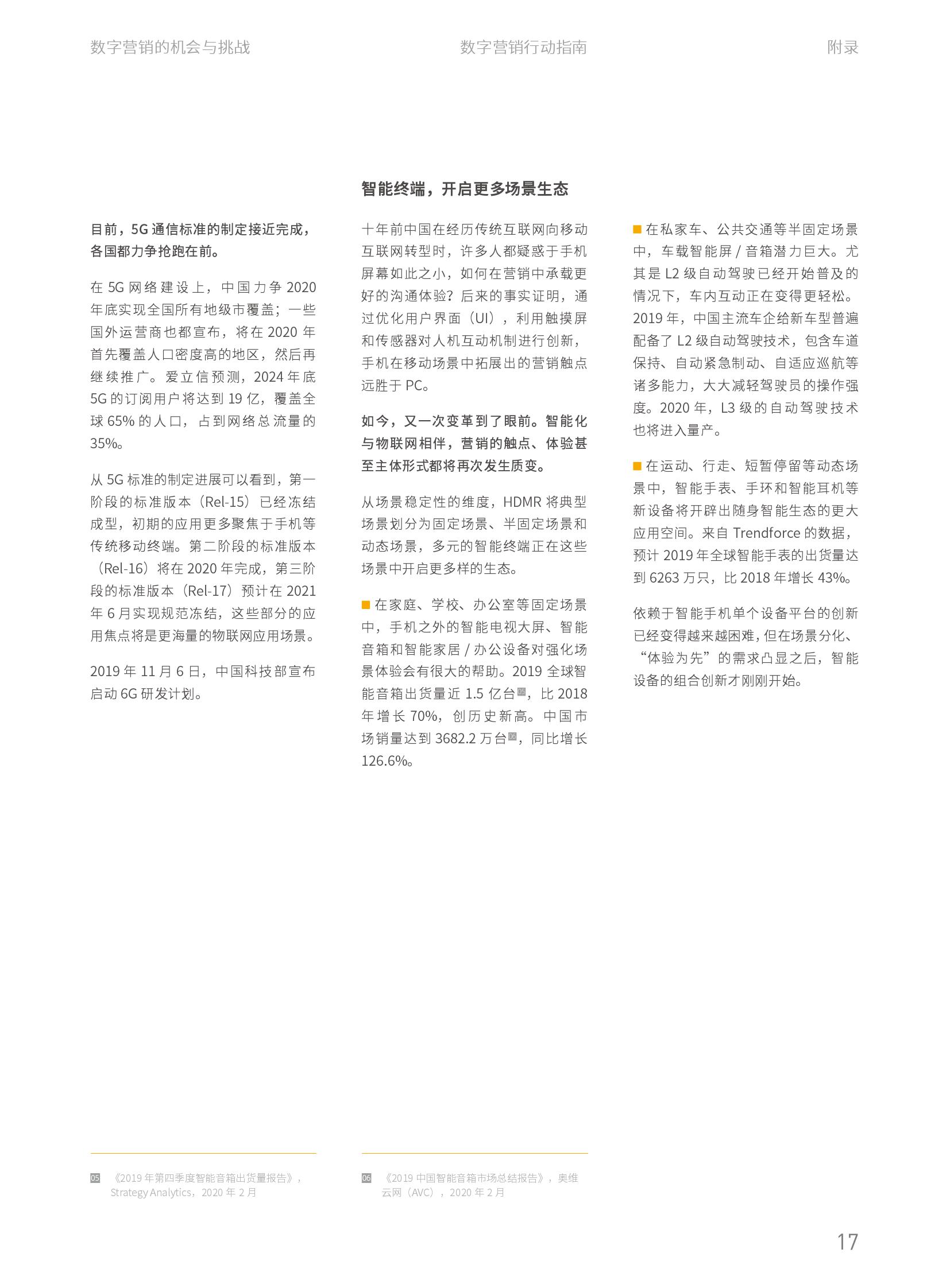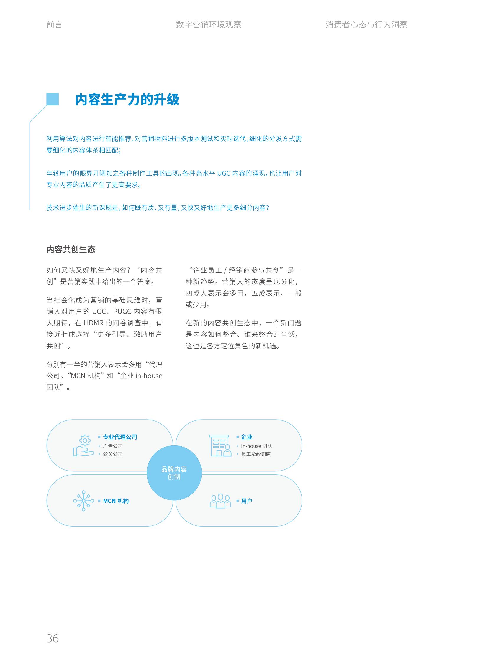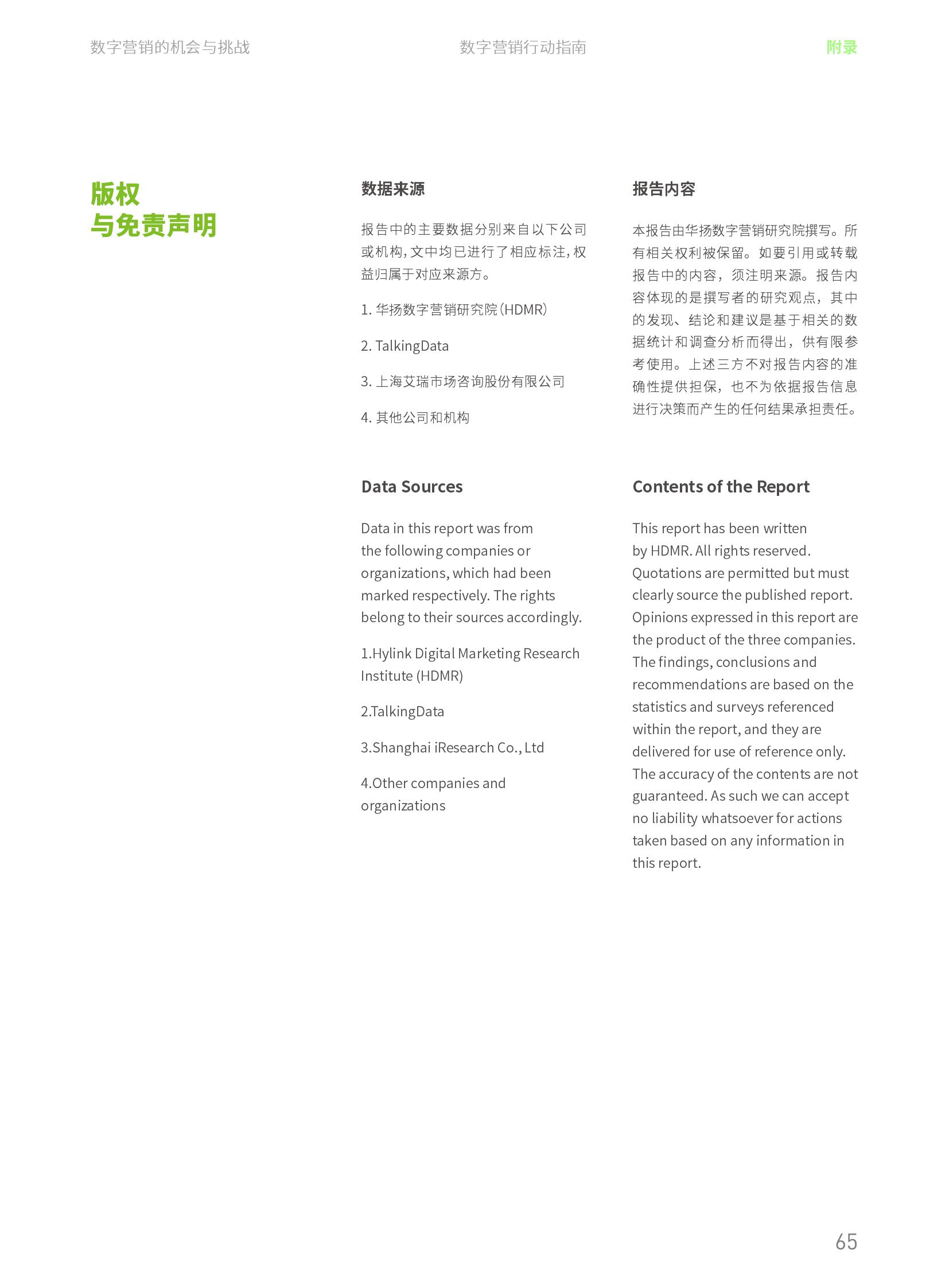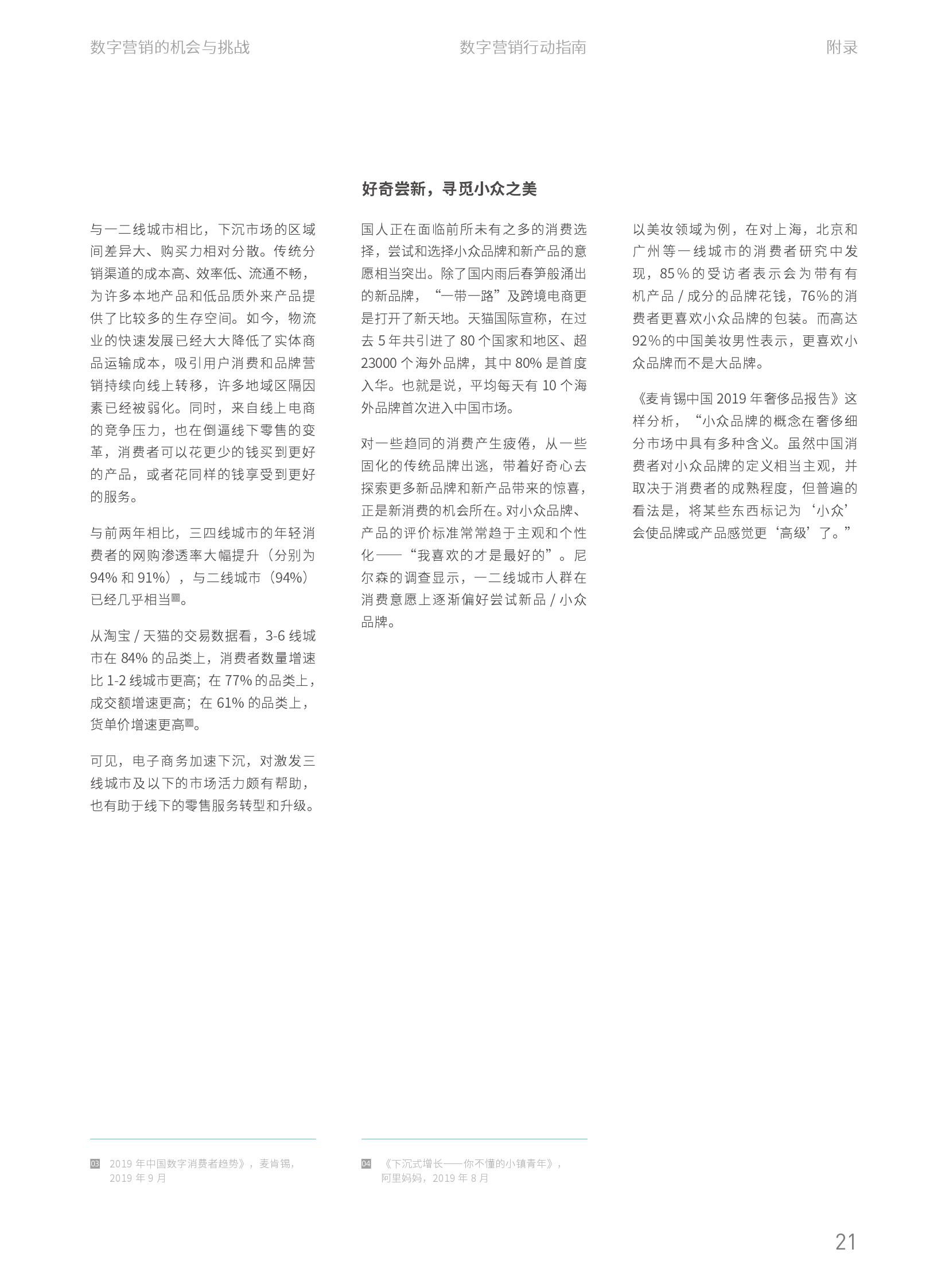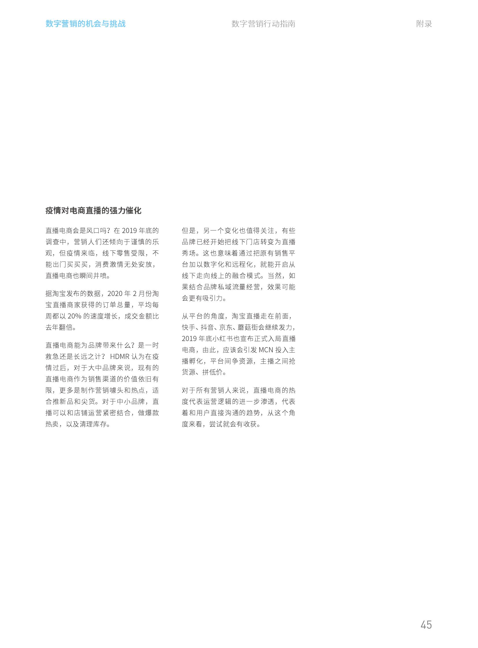 HDMR:2020中国数字营销行动报告 2020年消费发展的主体方向依旧是持续升级。 市场的主要机会,一是存量市场中的大规模升级需求,尤其是被称为香饽饽的“下沉市场”;二是引领未来走向的年轻群体的创新需求。2020年,90后步入30岁,00后初登舞台,新的年轻人正在改演现实。 2020年,我们提倡回归数字营销本身——消费者、媒介、平台等基础因素,深度思考它们所面对的变化和影响,然后形成眼前的对策。 PDF版本将分享到199IT交流群,支持我们发展可加入! 更多阅读:华扬数字:2018中国数字营销行动报告华扬联众:2015年中国数字营销行动报告华扬联众:2014年中国数字营销行动报告消费者品牌报告:寻找真相德勤咨询:2020中国与全球企业人工智能应用现状调研中国旅游研究院:2020中国冰雪旅游发展Falcon:2021年数字营销趋势报告Altimeter:2020年数字营销状况报告Salesforce:2021年营销报告CMO和C级高管报告:伙伴关系的基因Ascend2:2021年意图数据报告HCR:数字营销创新应用及趋势研究报告数字营销之战: 首席营销官(CMO)Vs.首席信息官(CIO)Razorfish:2015年全球数字营销报告Adobe:2014亚太区数字营销业绩报告