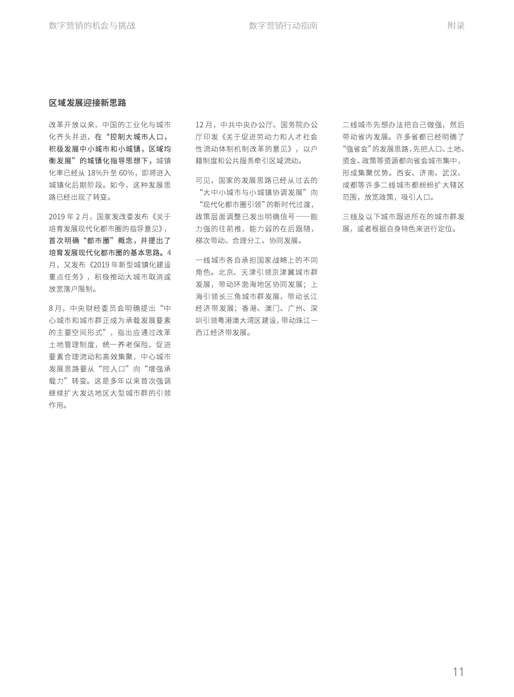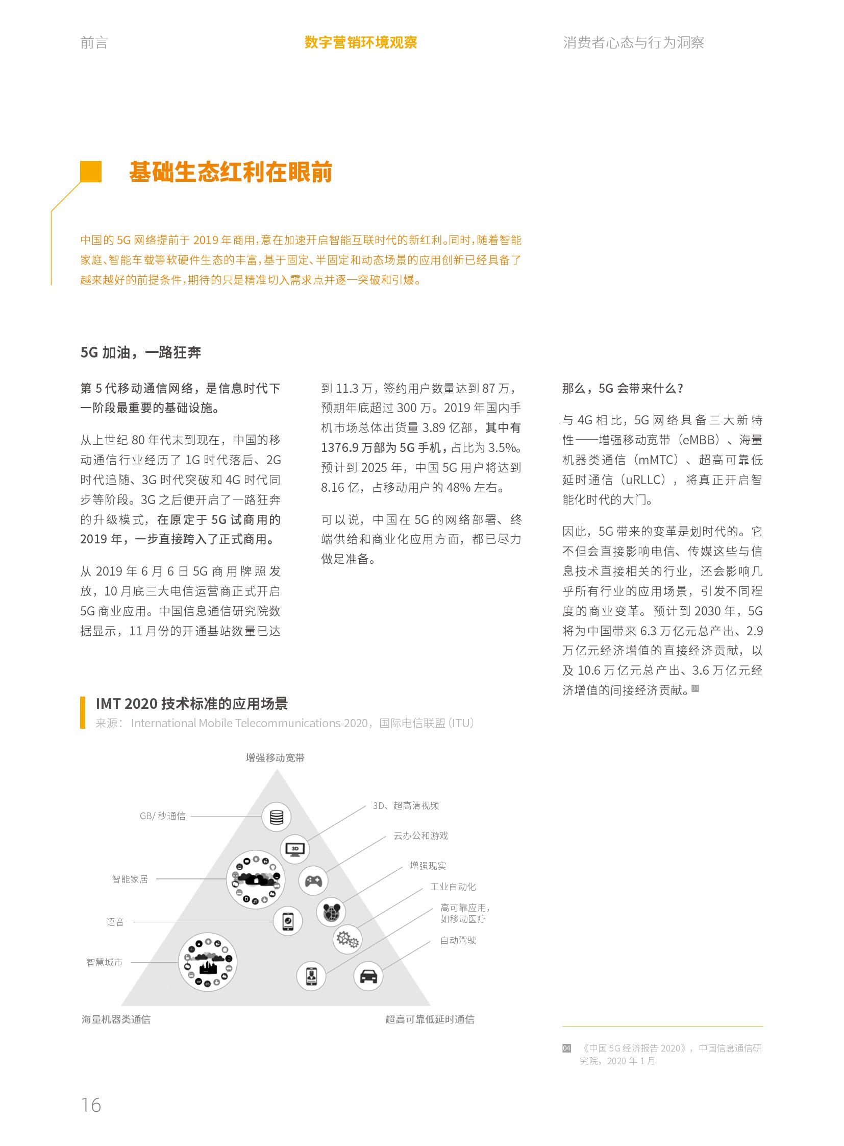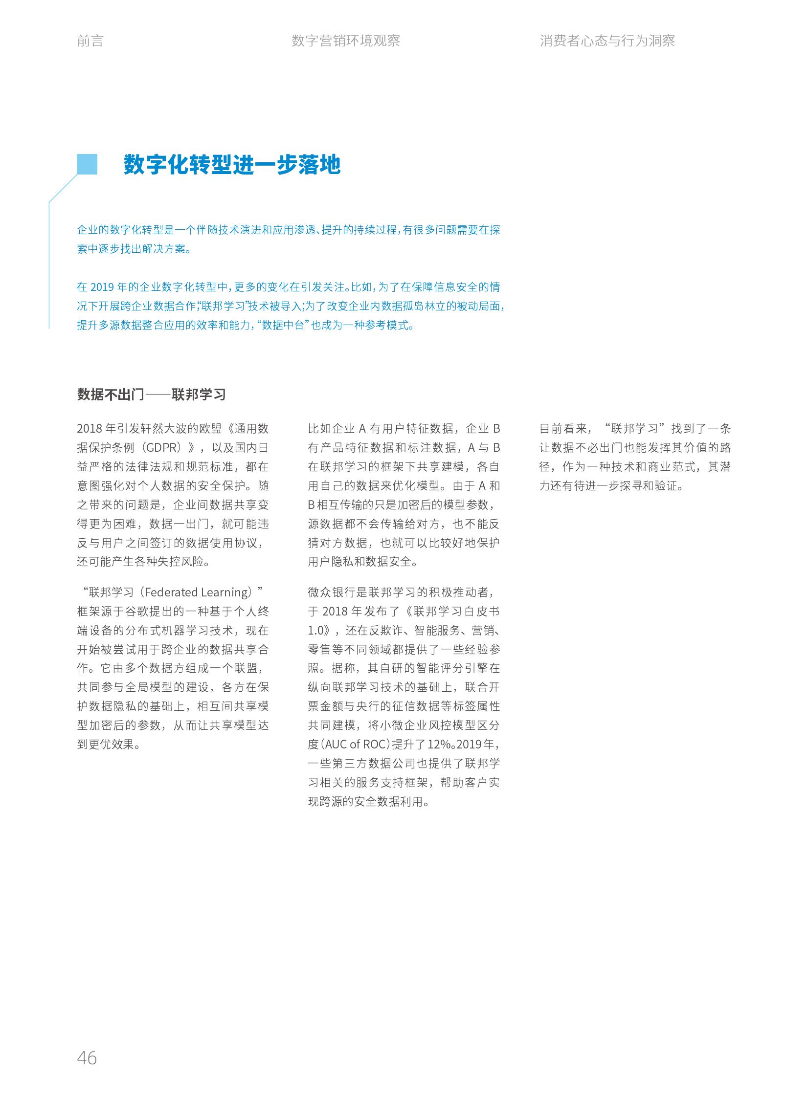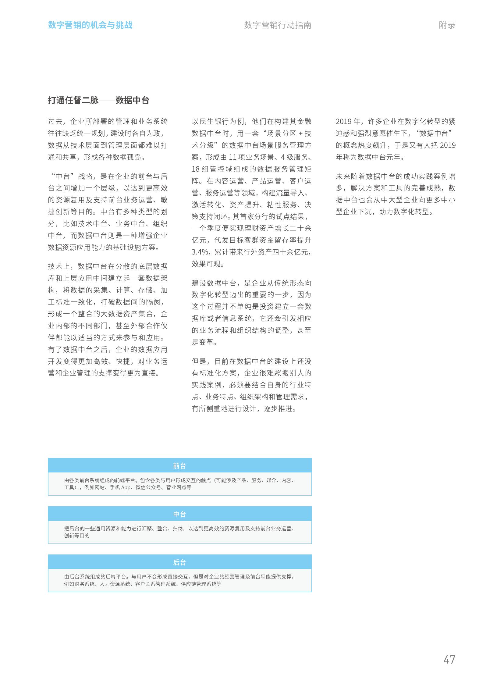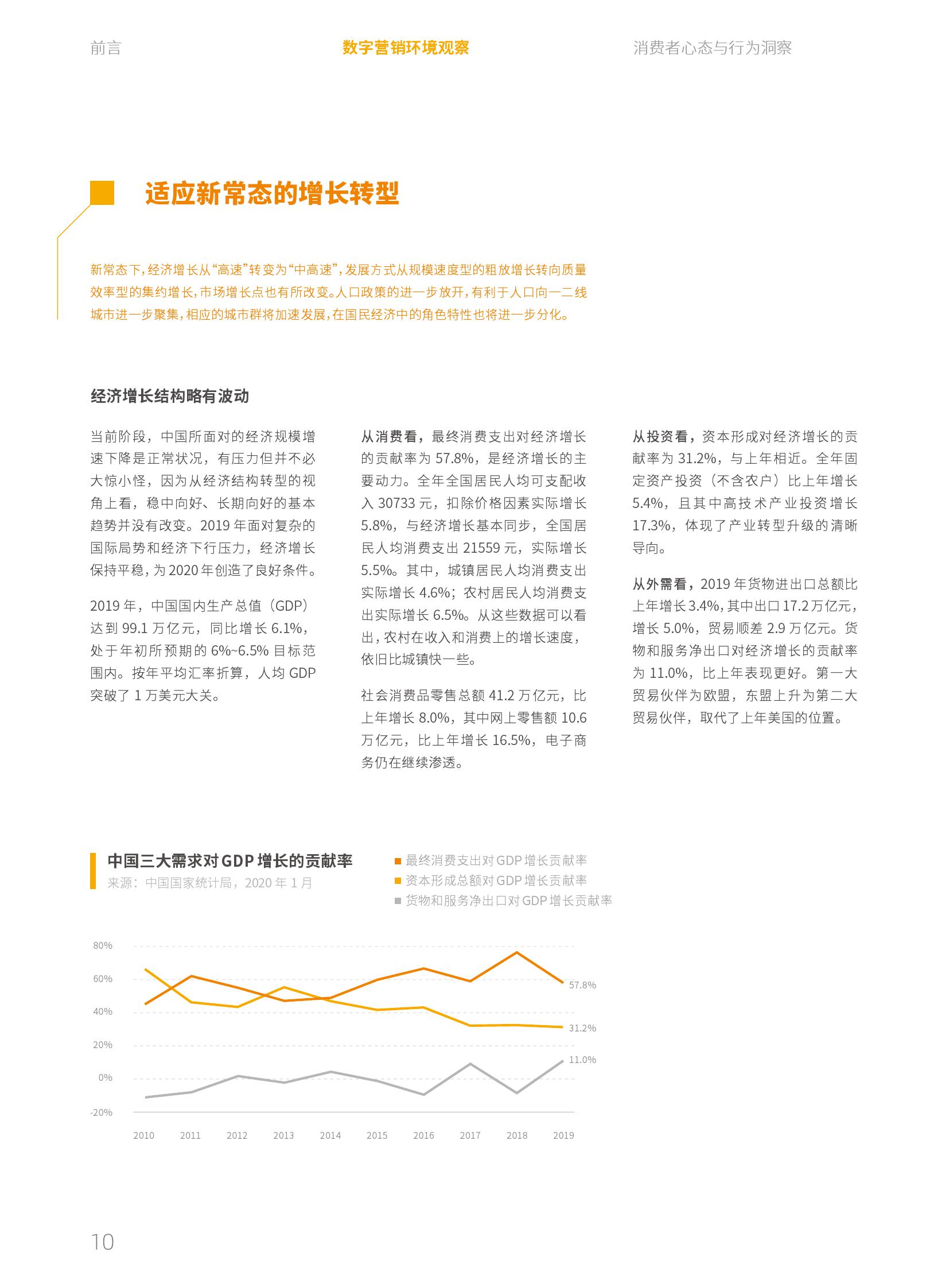 HDMR:2020中国数字营销行动报告 2020年消费发展的主体方向依旧是持续升级。 市场的主要机会,一是存量市场中的大规模升级需求,尤其是被称为香饽饽的“下沉市场”;二是引领未来走向的年轻群体的创新需求。2020年,90后步入30岁,00后初登舞台,新的年轻人正在改演现实。 2020年,我们提倡回归数字营销本身——消费者、媒介、平台等基础因素,深度思考它们所面对的变化和影响,然后形成眼前的对策。 PDF版本将分享到199IT交流群,支持我们发展可加入! 更多阅读:华扬数字:2018中国数字营销行动报告华扬联众:2015年中国数字营销行动报告华扬联众:2014年中国数字营销行动报告消费者品牌报告:寻找真相德勤咨询:2020中国与全球企业人工智能应用现状调研中国旅游研究院:2020中国冰雪旅游发展Falcon:2021年数字营销趋势报告Altimeter:2020年数字营销状况报告Salesforce:2021年营销报告CMO和C级高管报告:伙伴关系的基因Ascend2:2021年意图数据报告HCR:数字营销创新应用及趋势研究报告数字营销之战: 首席营销官(CMO)Vs.首席信息官(CIO)Razorfish:2015年全球数字营销报告Adobe:2014亚太区数字营销业绩报告