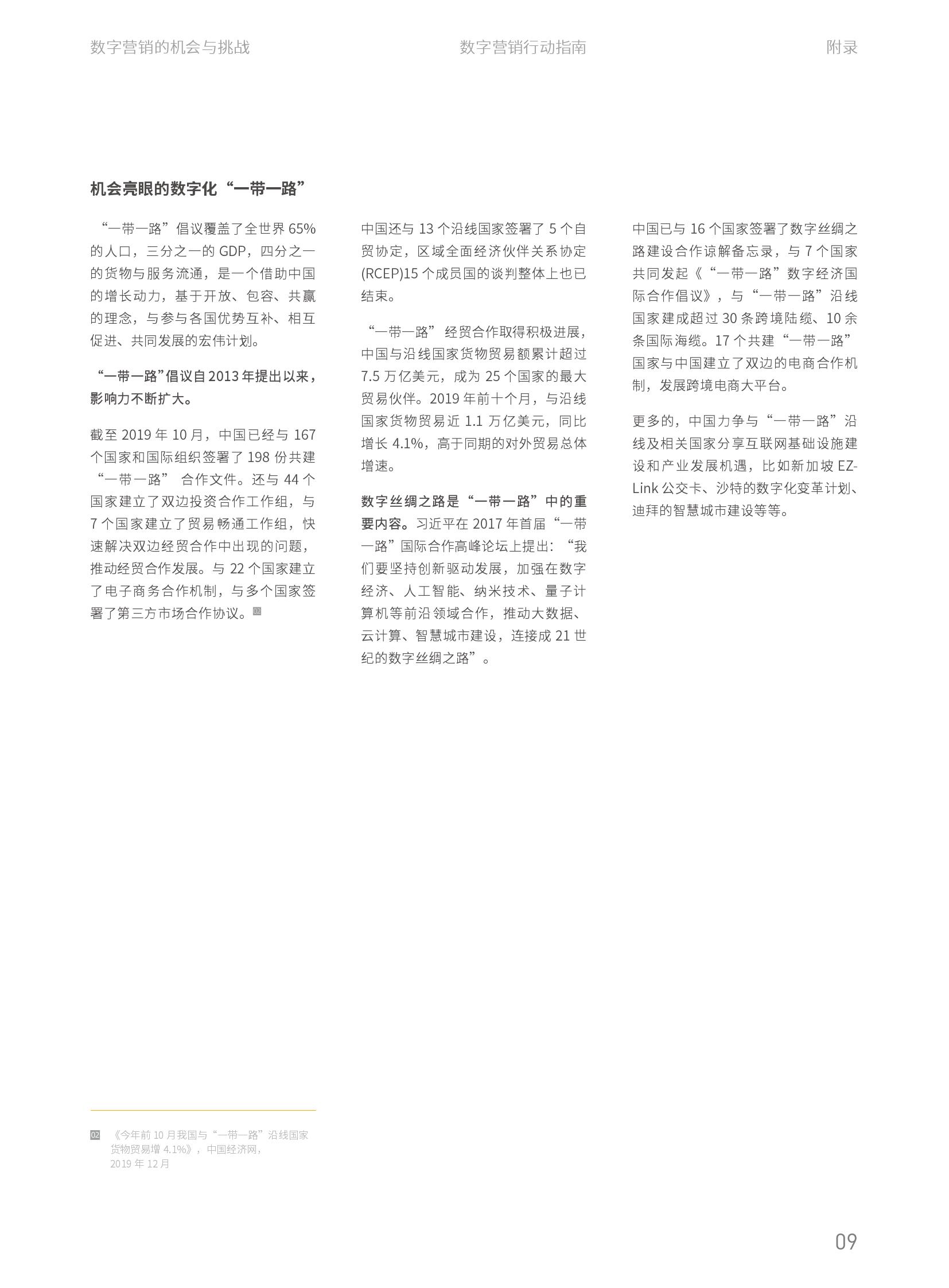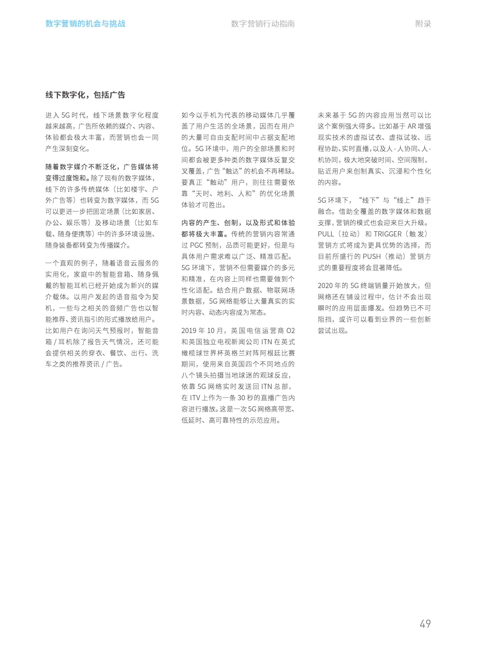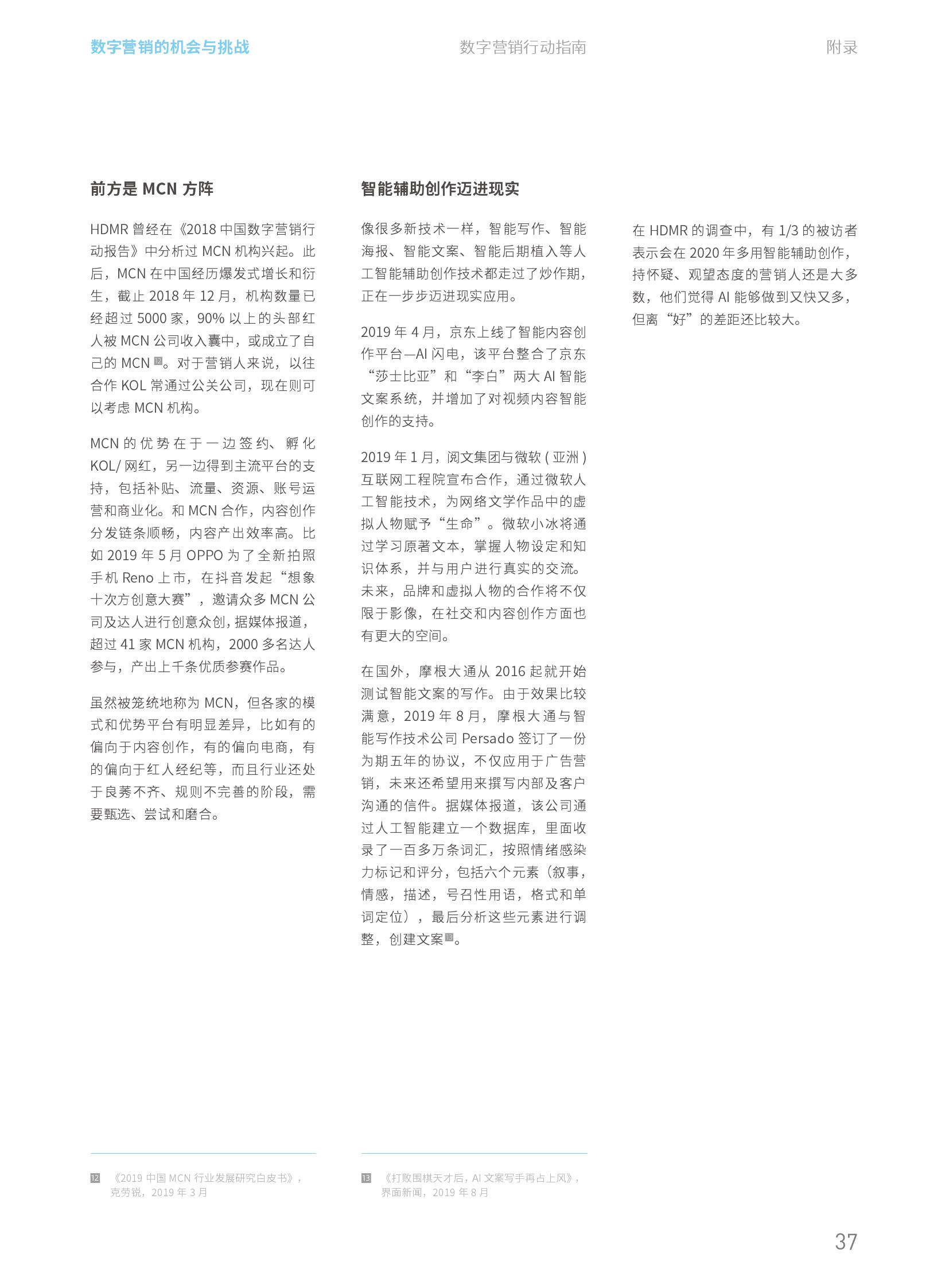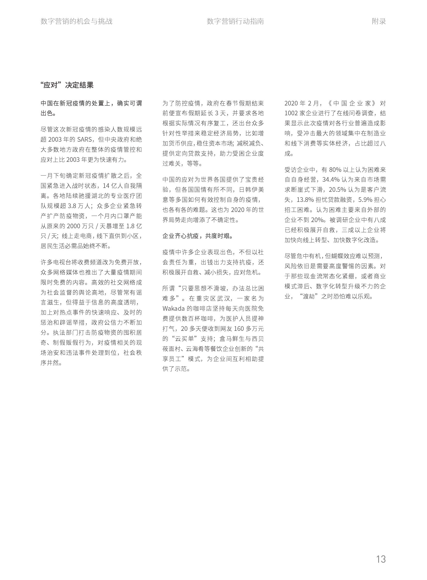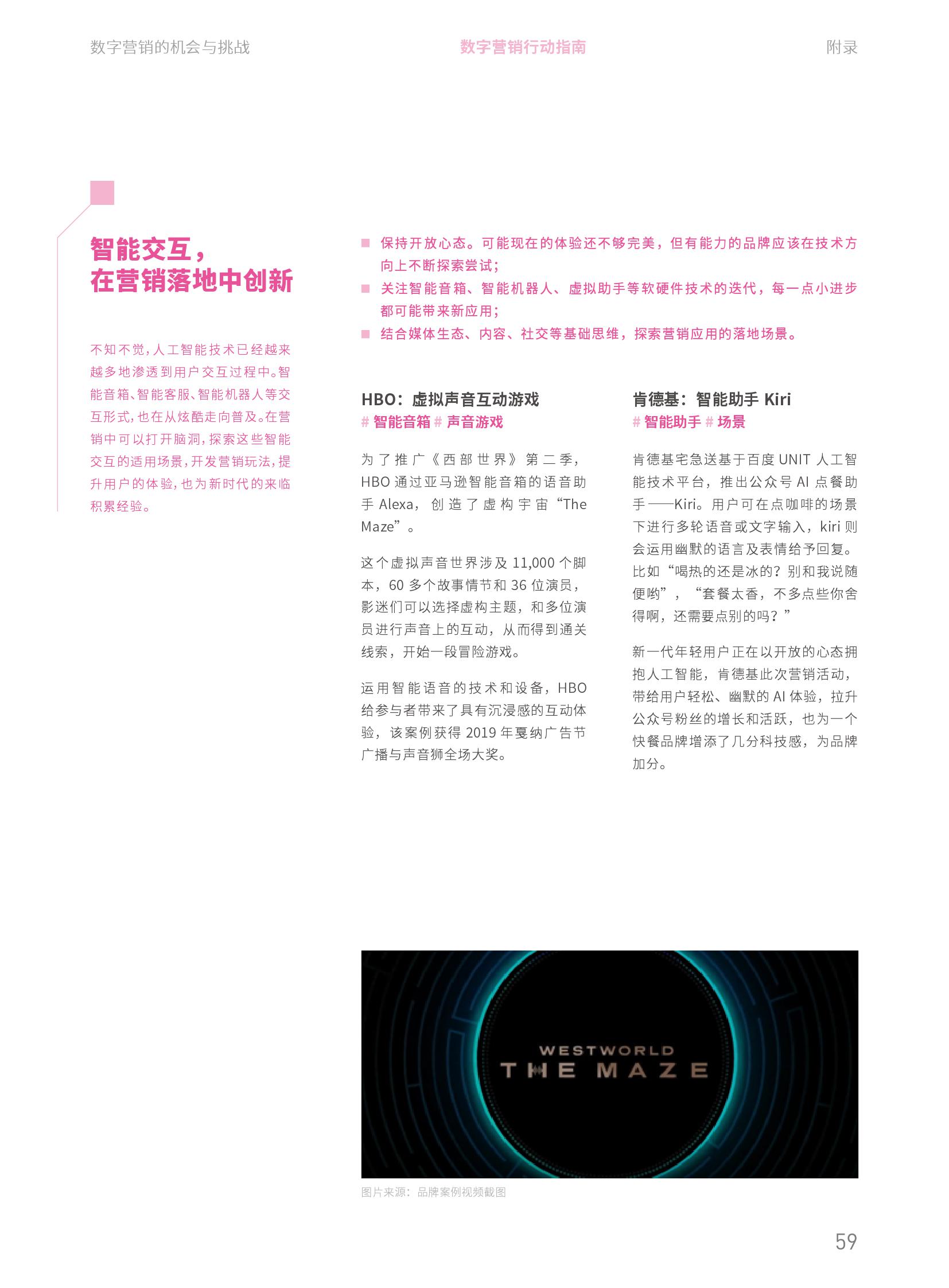 HDMR:2020中国数字营销行动报告 2020年消费发展的主体方向依旧是持续升级。 市场的主要机会,一是存量市场中的大规模升级需求,尤其是被称为香饽饽的“下沉市场”;二是引领未来走向的年轻群体的创新需求。2020年,90后步入30岁,00后初登舞台,新的年轻人正在改演现实。 2020年,我们提倡回归数字营销本身——消费者、媒介、平台等基础因素,深度思考它们所面对的变化和影响,然后形成眼前的对策。 PDF版本将分享到199IT交流群,支持我们发展可加入! 更多阅读:华扬数字:2018中国数字营销行动报告华扬联众:2015年中国数字营销行动报告华扬联众:2014年中国数字营销行动报告消费者品牌报告:寻找真相德勤咨询:2020中国与全球企业人工智能应用现状调研中国旅游研究院:2020中国冰雪旅游发展Falcon:2021年数字营销趋势报告Altimeter:2020年数字营销状况报告Salesforce:2021年营销报告CMO和C级高管报告:伙伴关系的基因Ascend2:2021年意图数据报告HCR:数字营销创新应用及趋势研究报告数字营销之战: 首席营销官(CMO)Vs.首席信息官(CIO)Razorfish:2015年全球数字营销报告Adobe:2014亚太区数字营销业绩报告