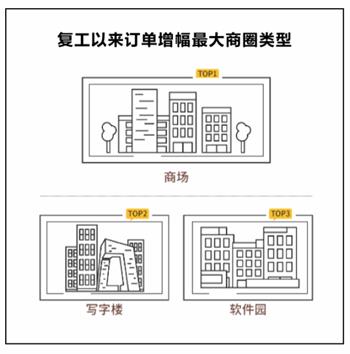 《报告》显示,各主要城市订单量增速最快的前三商圈类型为商场、写字楼和软件园,城市中的商业楼宇逐渐热闹,正加速复苏。全国订单量TOP5城市中增长最快商圈分别是:北京——望京、上海——陆家嘴、广州——珠江新城、深圳——福田CBD、成都——金融城。近两周以来,无论是“互联网+”的程序员,还是金融精英,一线城市的白领一族都是最早、最快投入到工作中的人群。