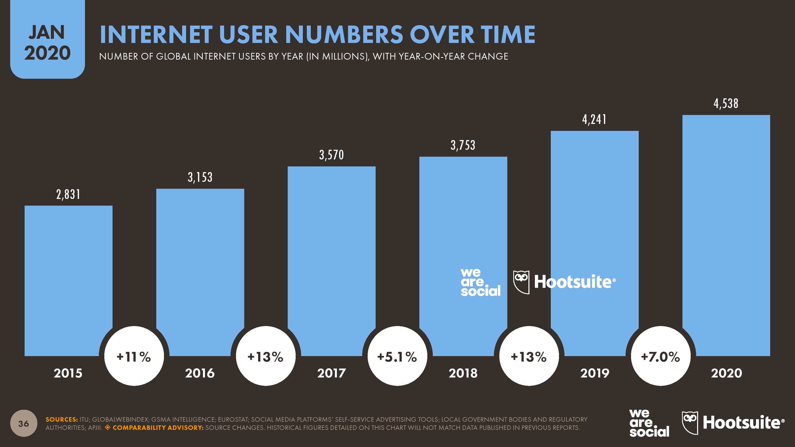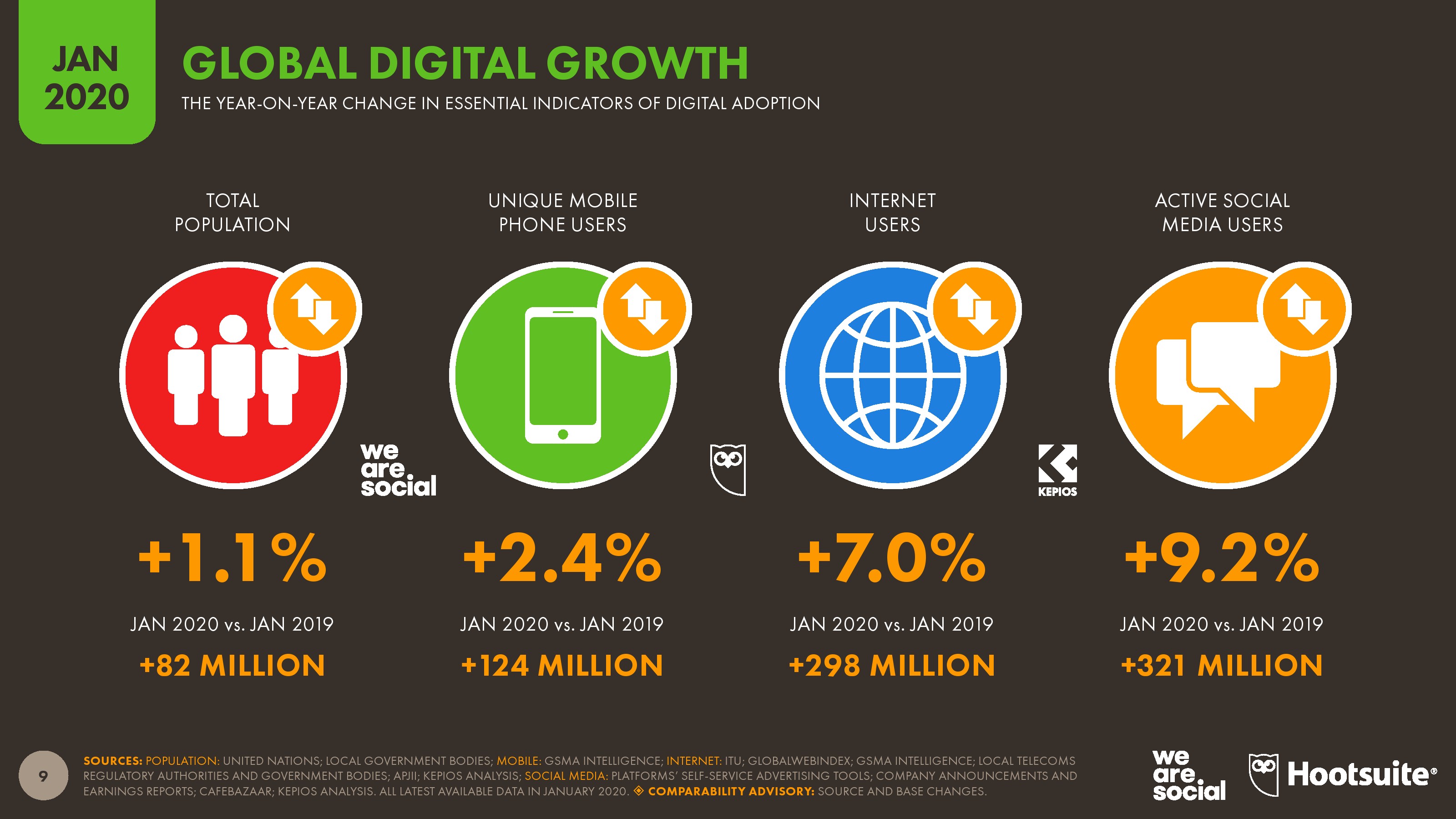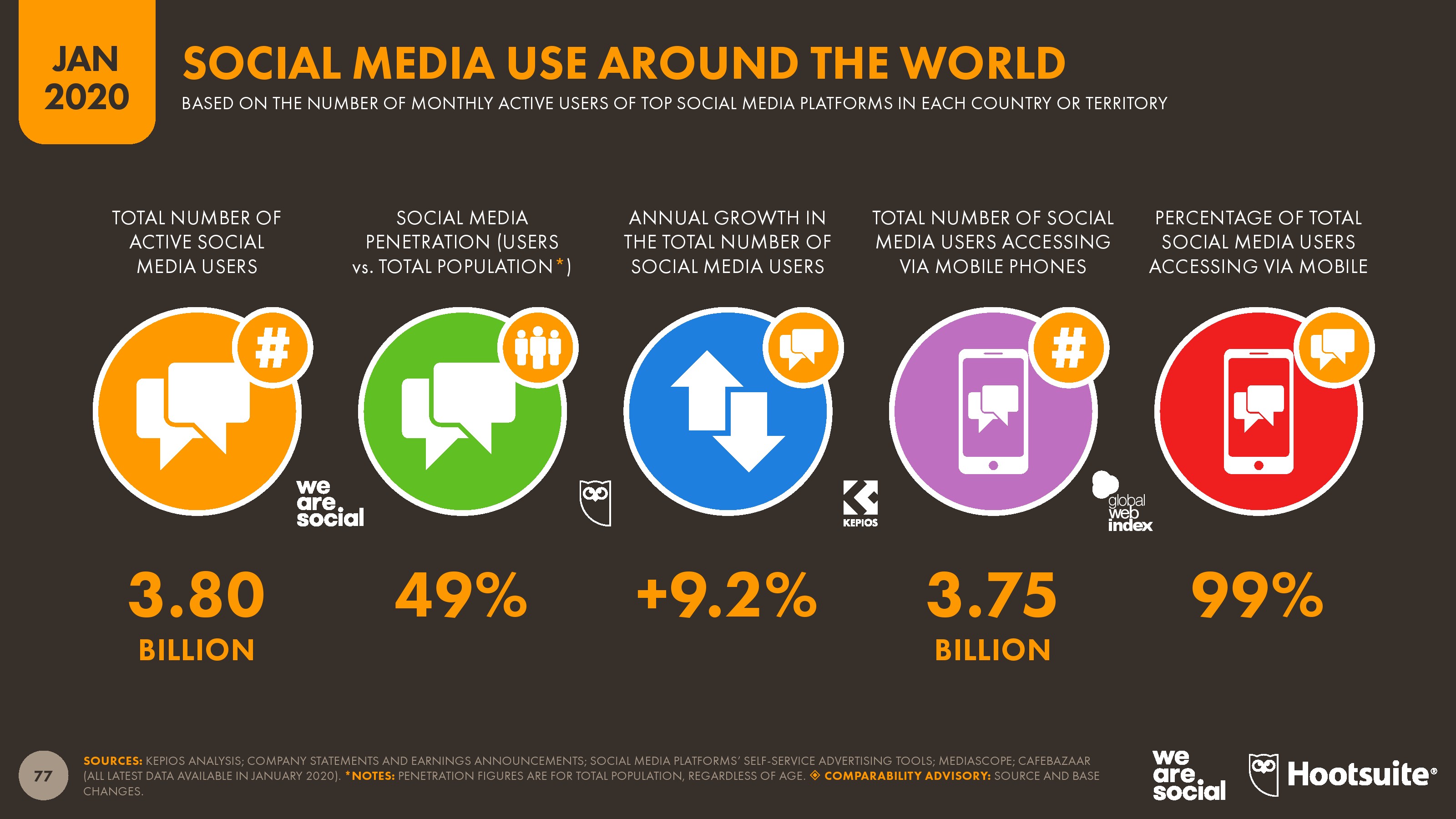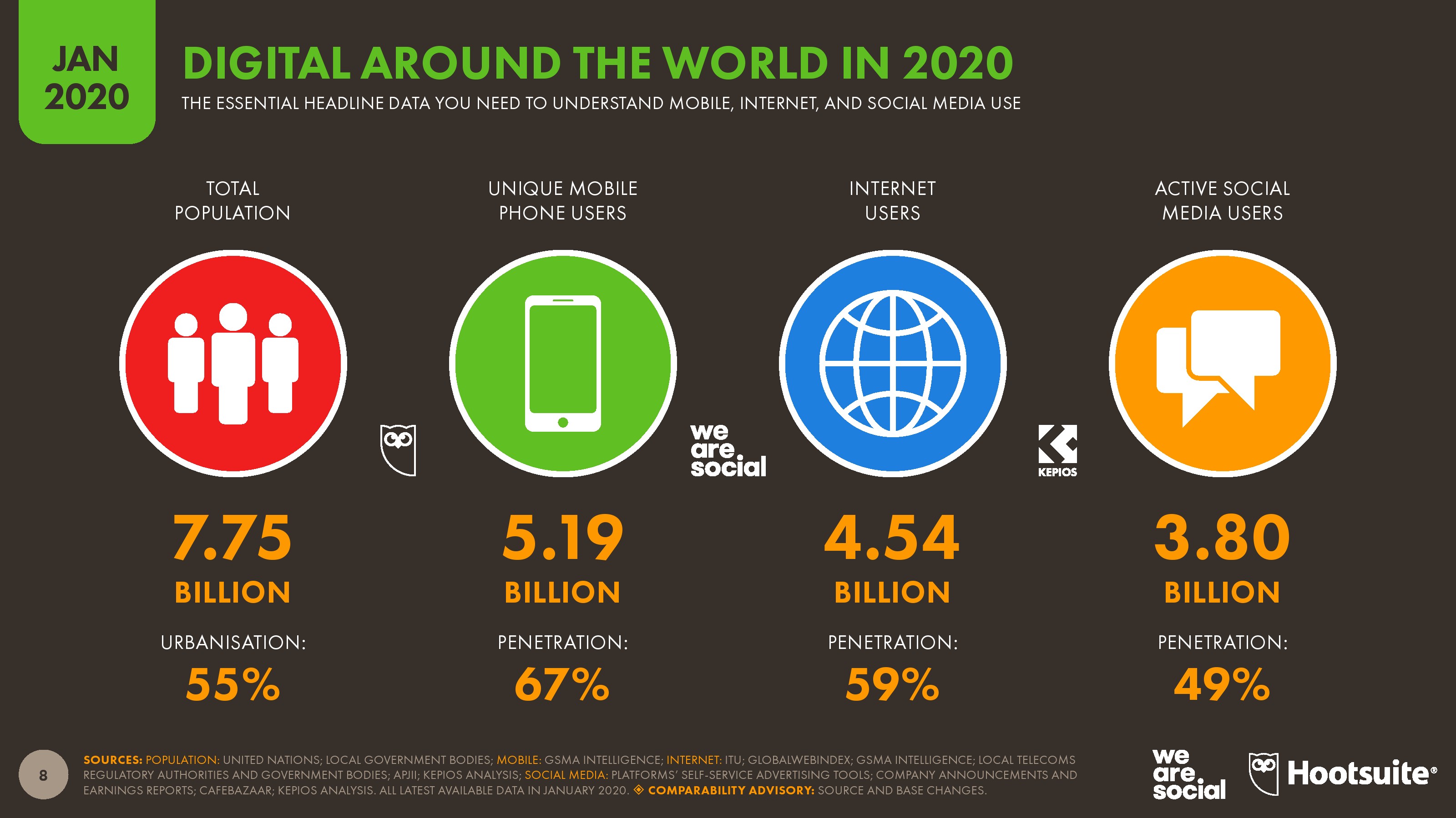 We Are Social携手Hootsuite发布了新报告“2020年全球网络概览”。新十年的开启,越来越清楚的是网络、移动和社交媒体已经成为世界各地人们日常生活中不可或缺的一部分。全球目前有超过45亿人使用互联网,而社交媒体用户已超过38亿大关。