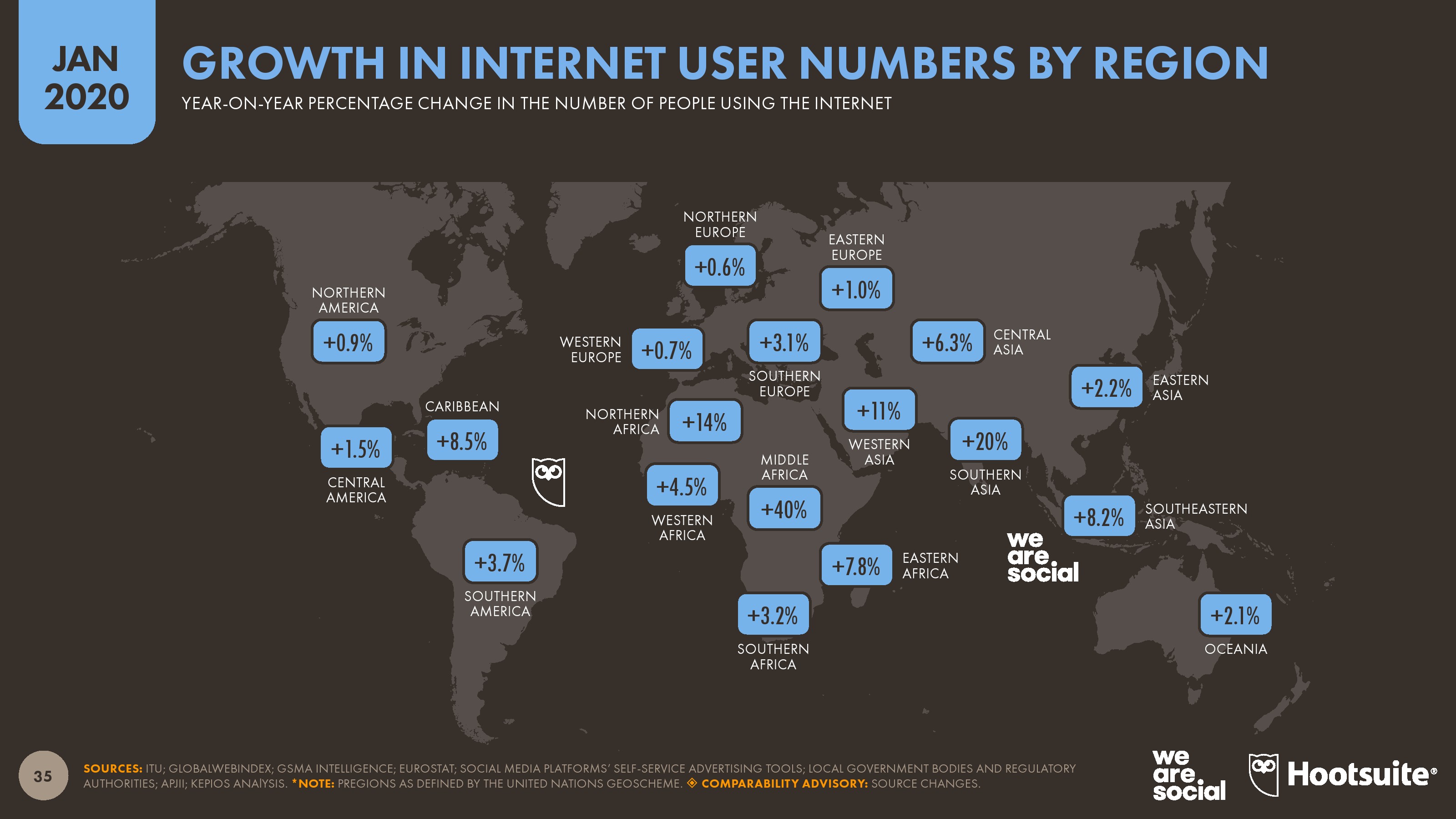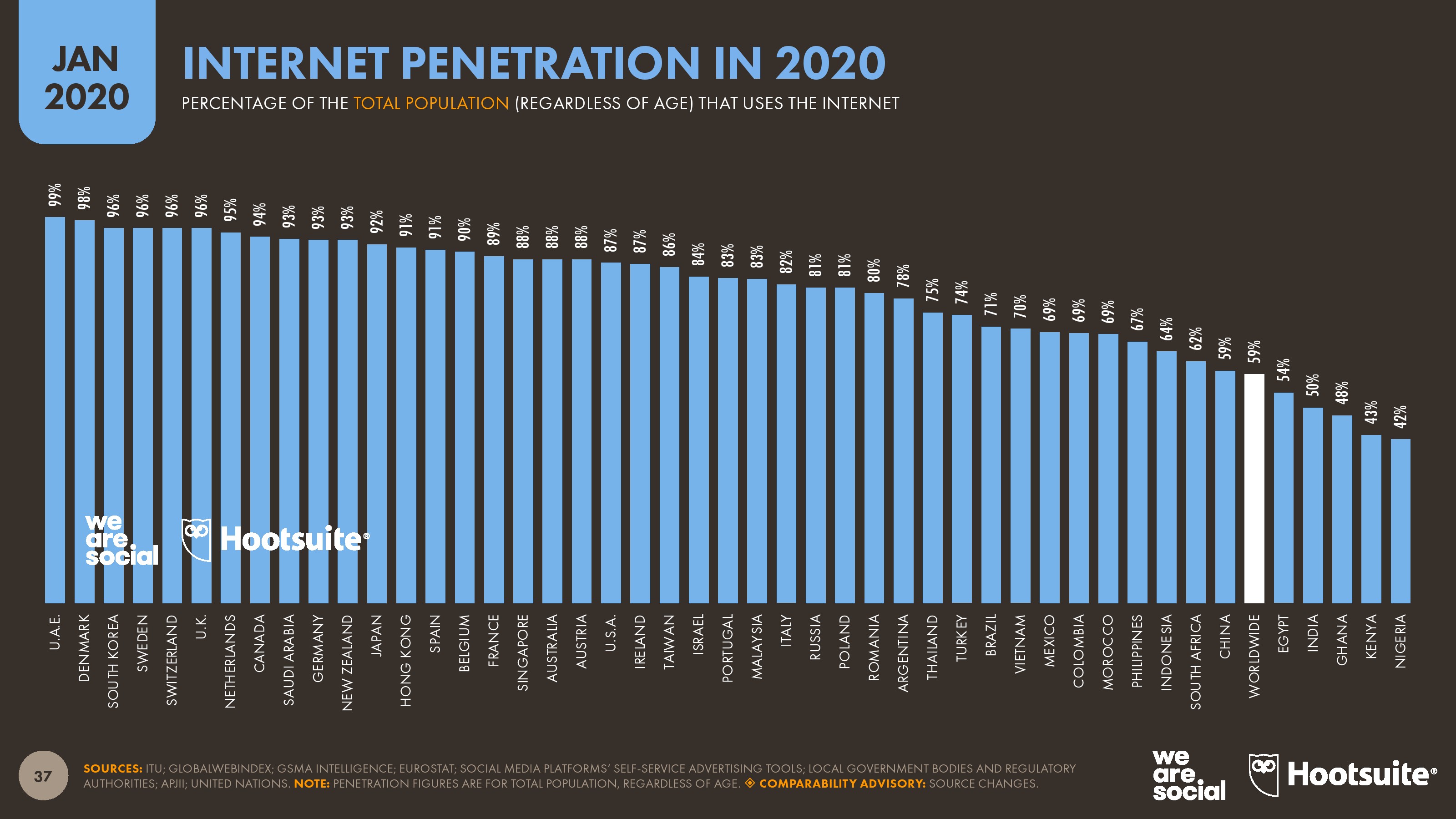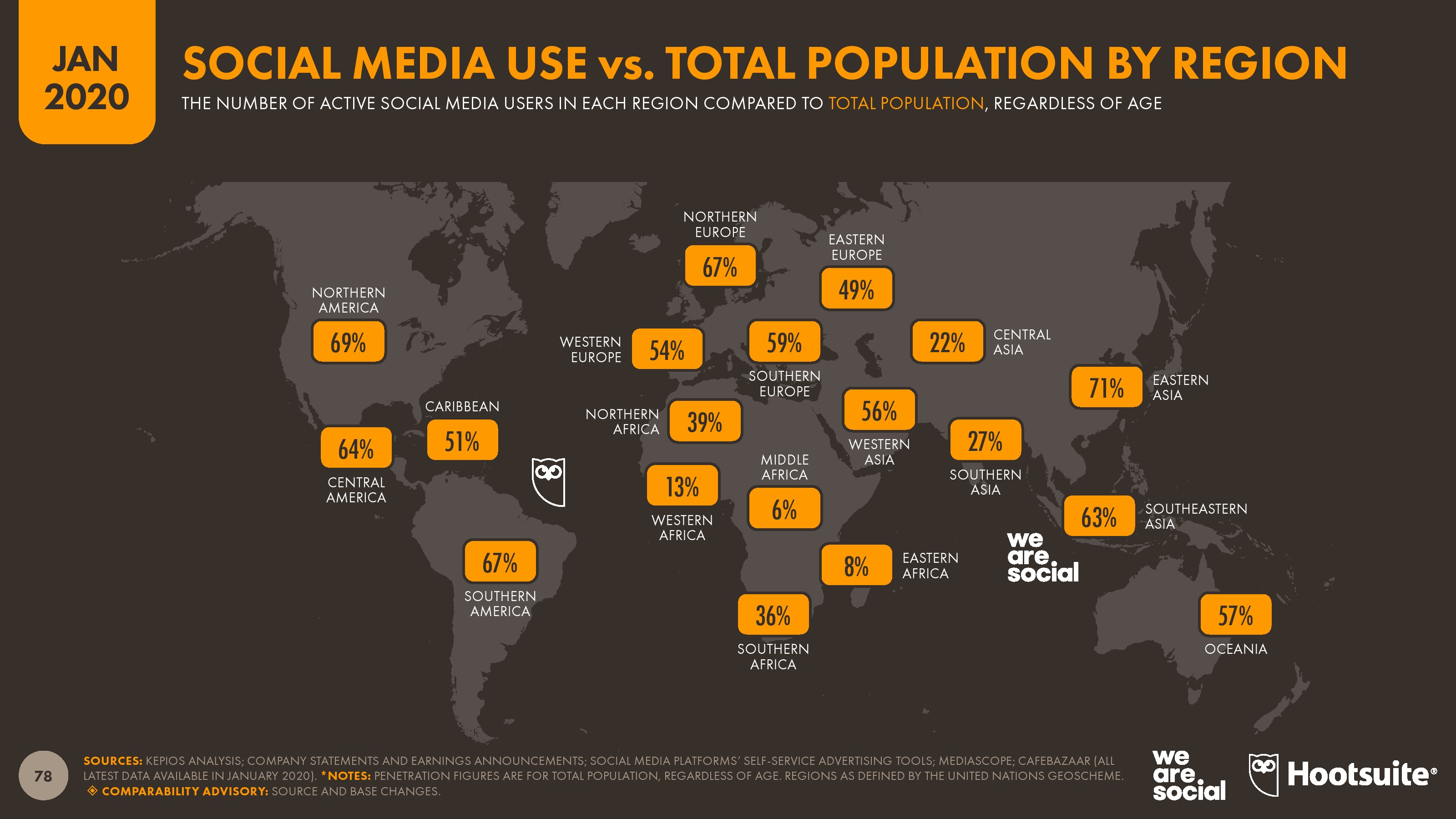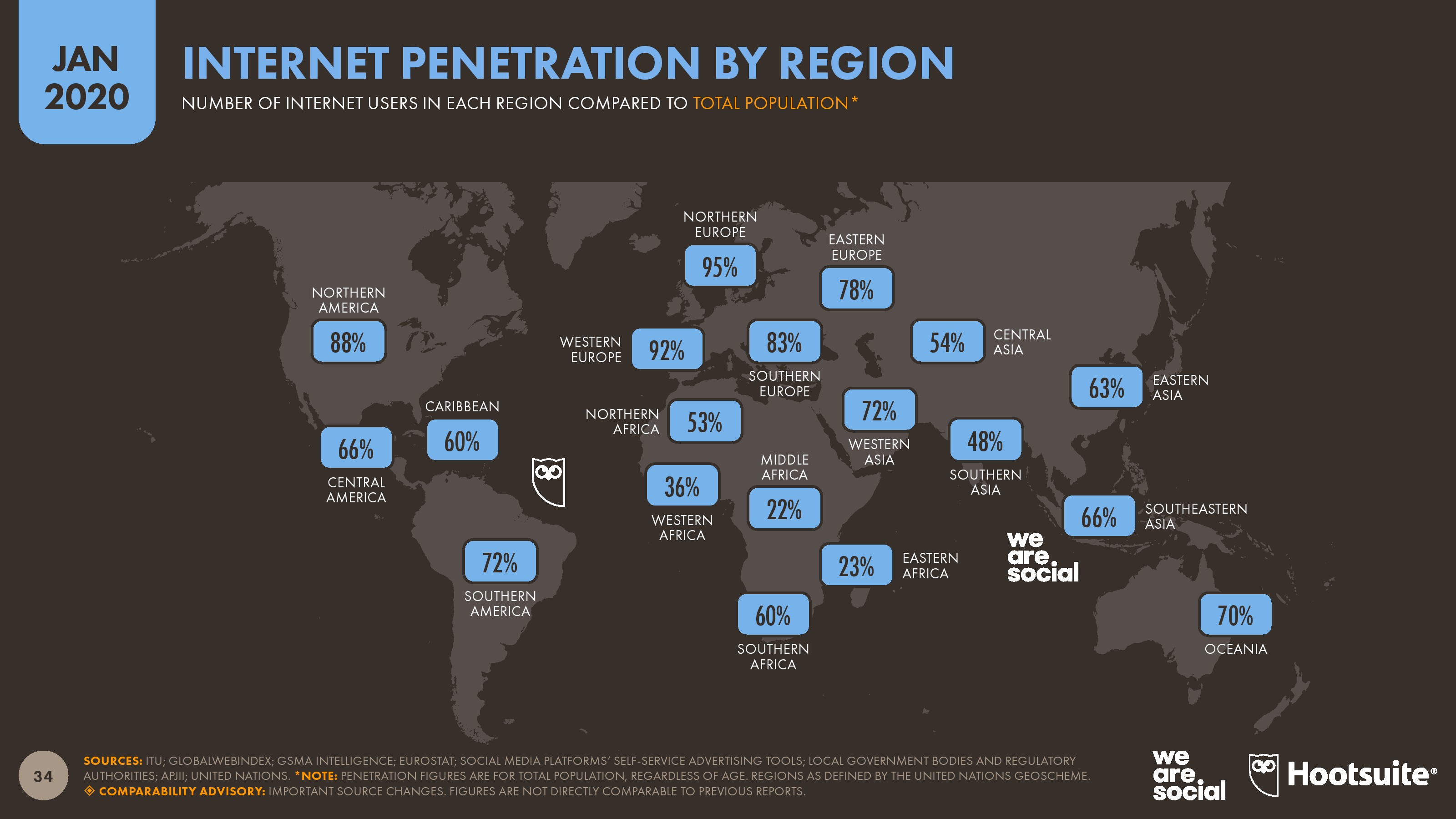 近60%的世界人口已经上网,到今年年中,世界总人口的一半以上将使用社交媒体。