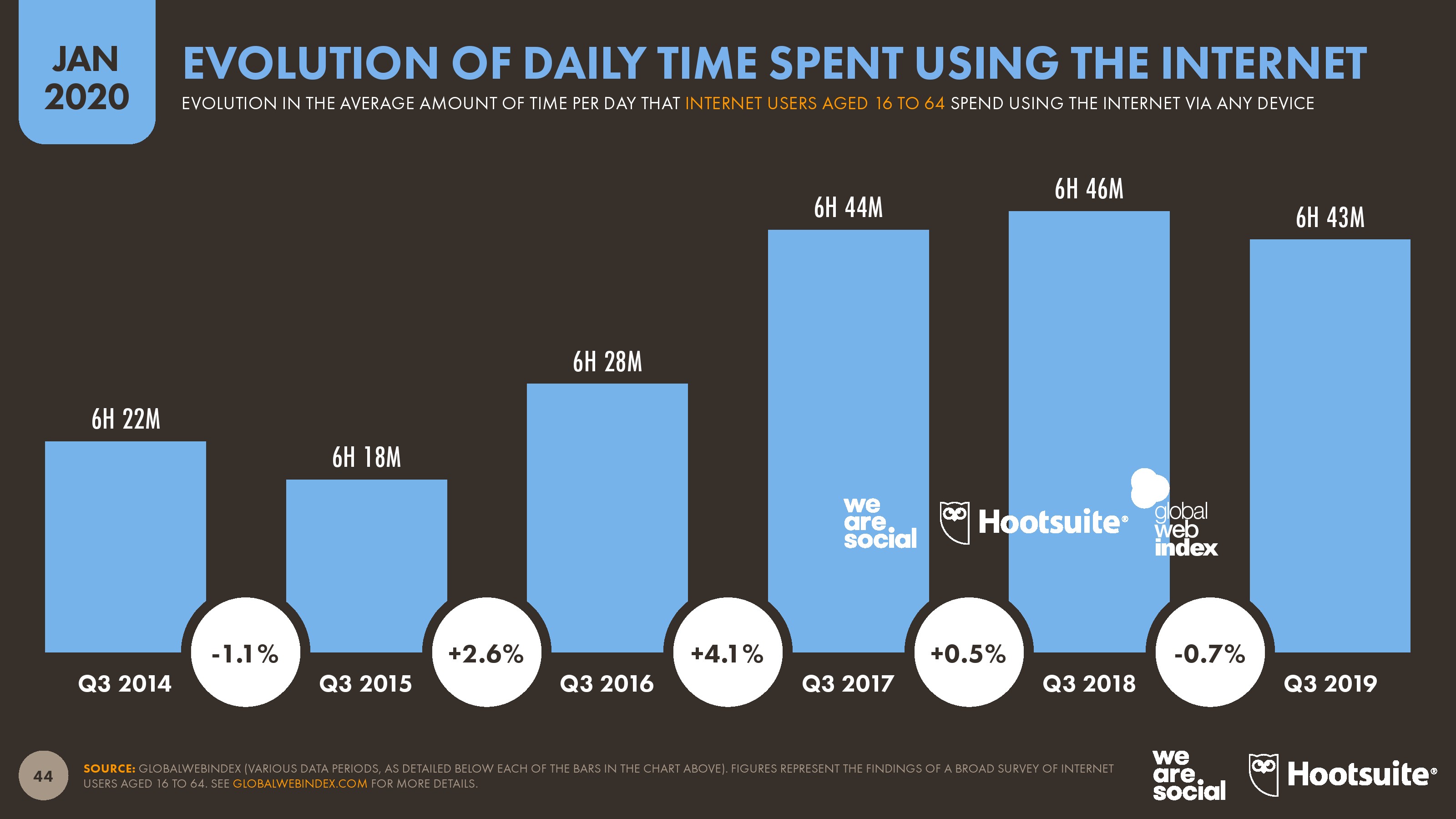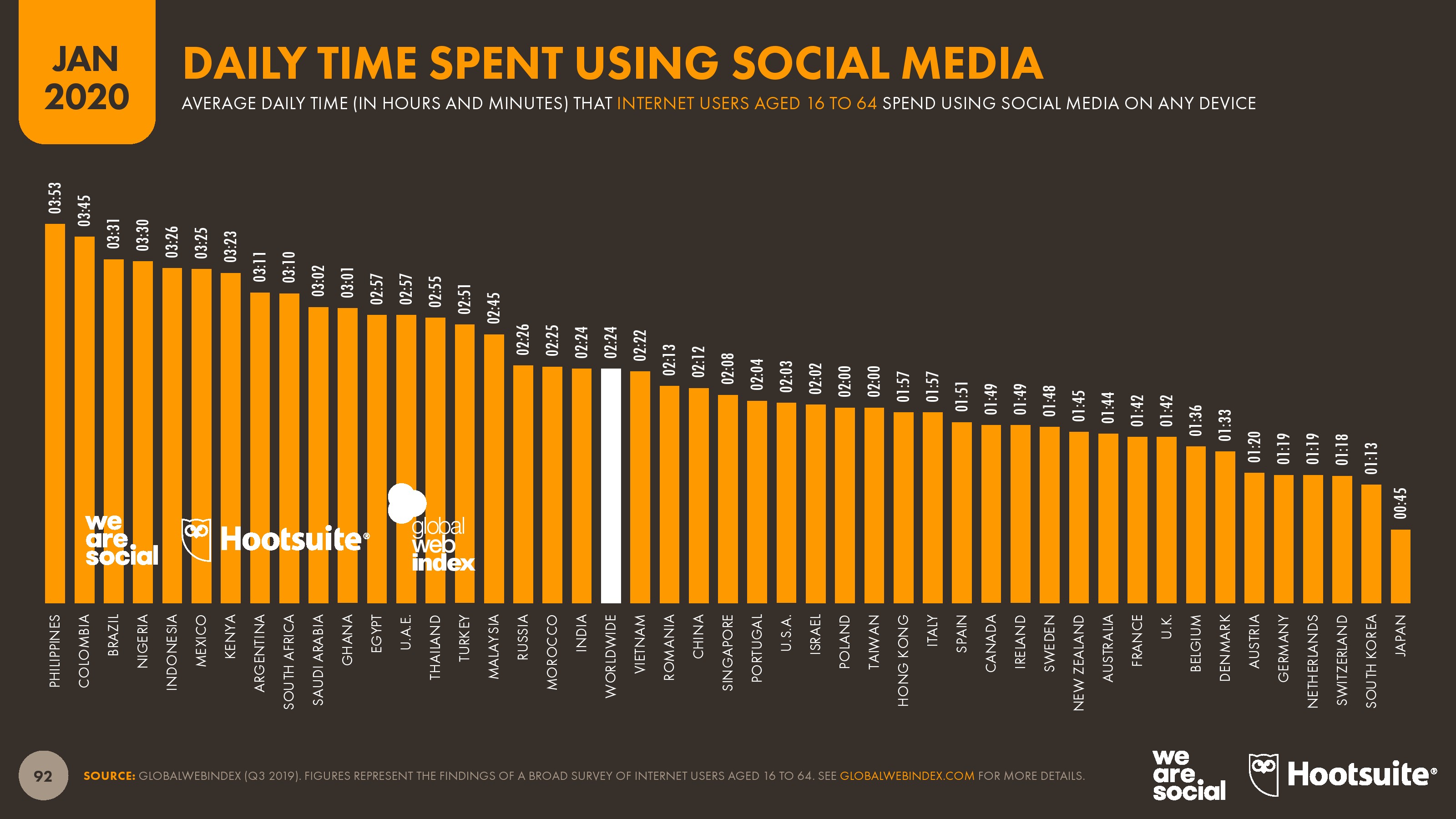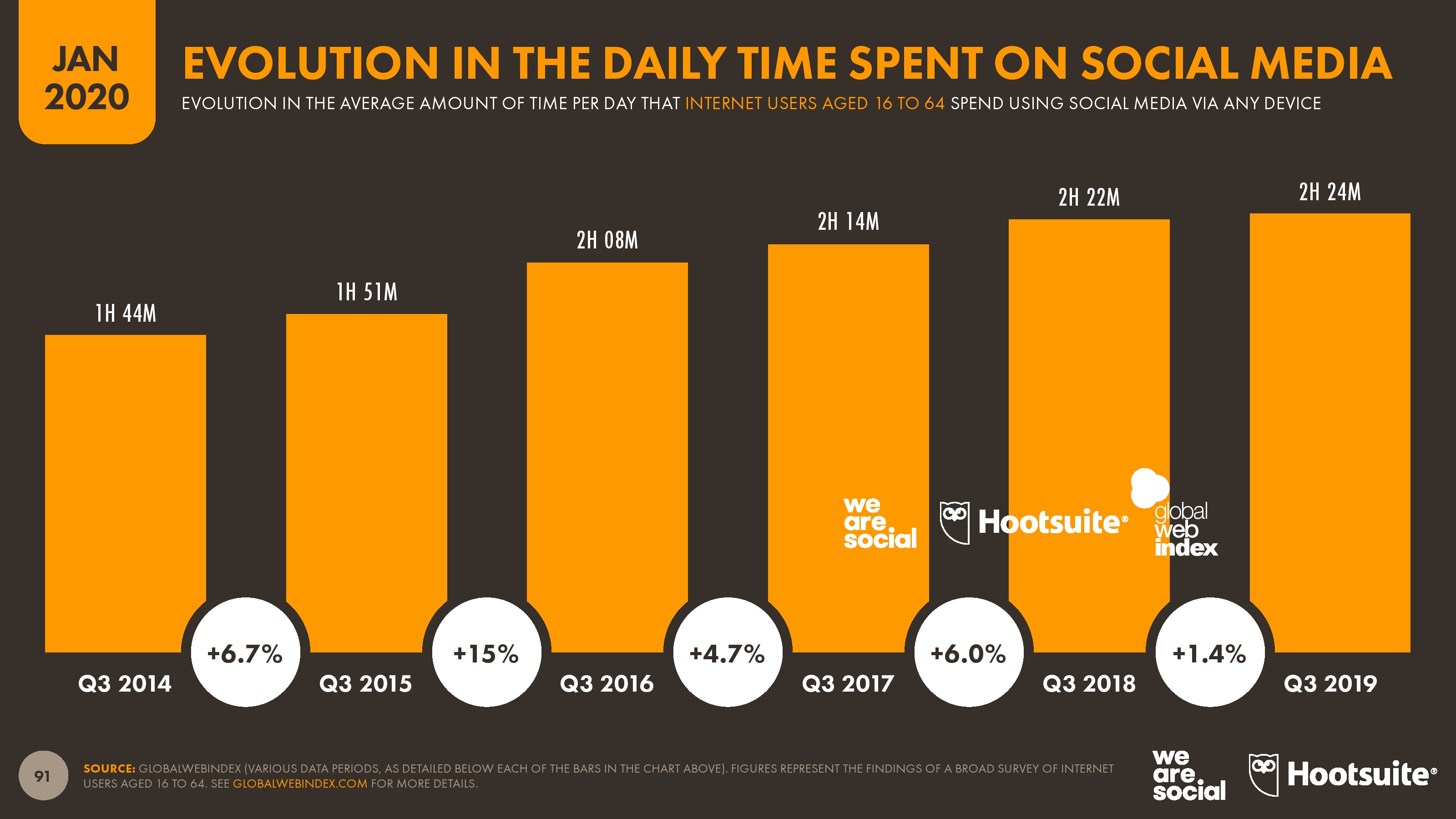 全球网民平均每天在所有设备上使用社交媒体的时间为2小时24分钟,占互联网访问时间的1/3以上。
