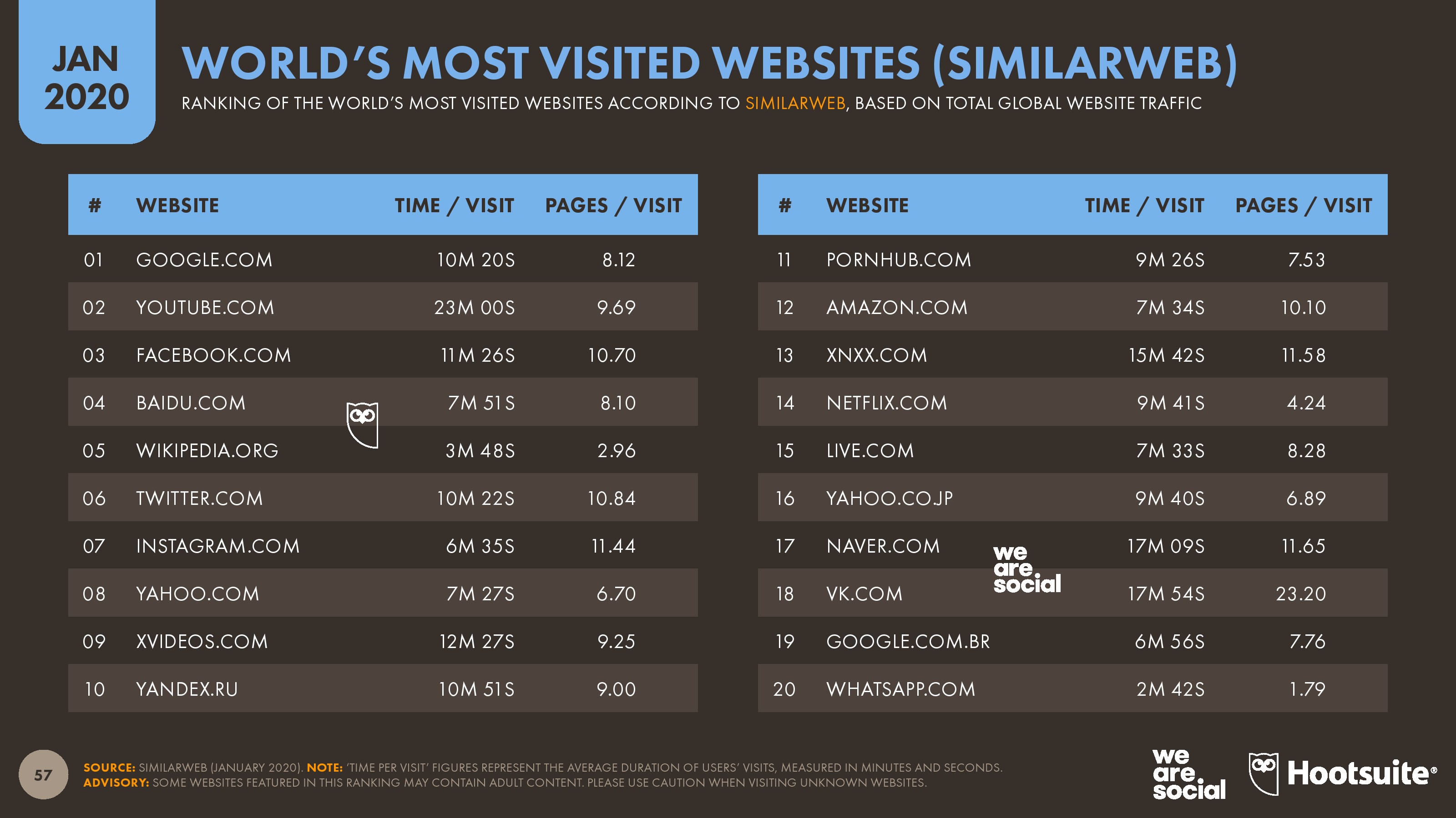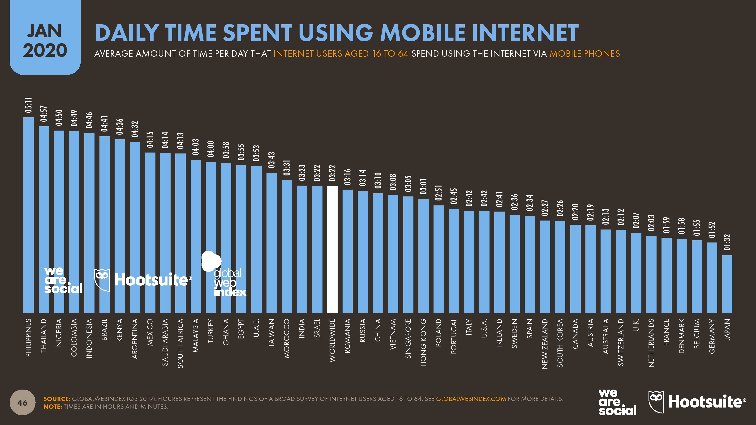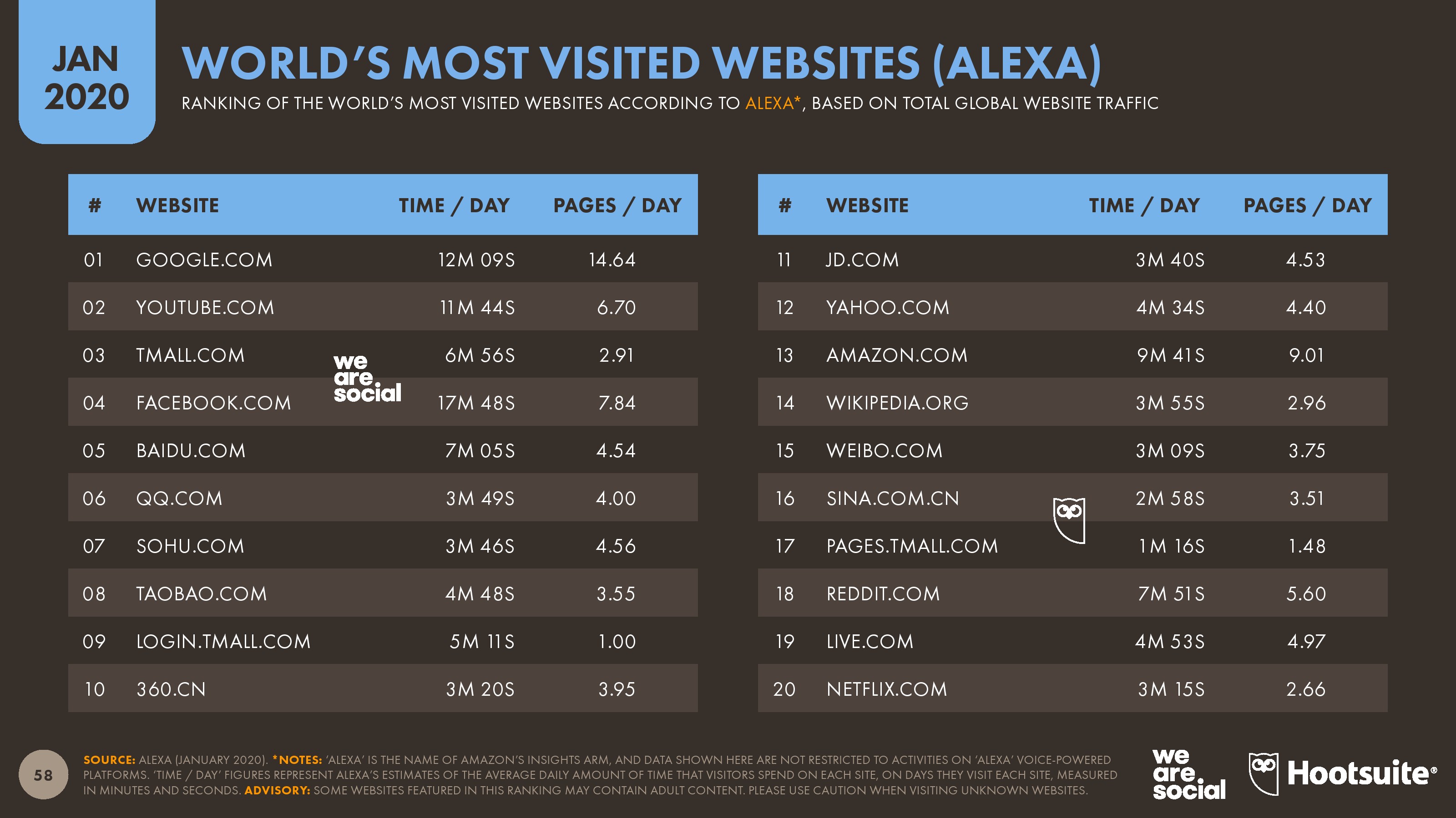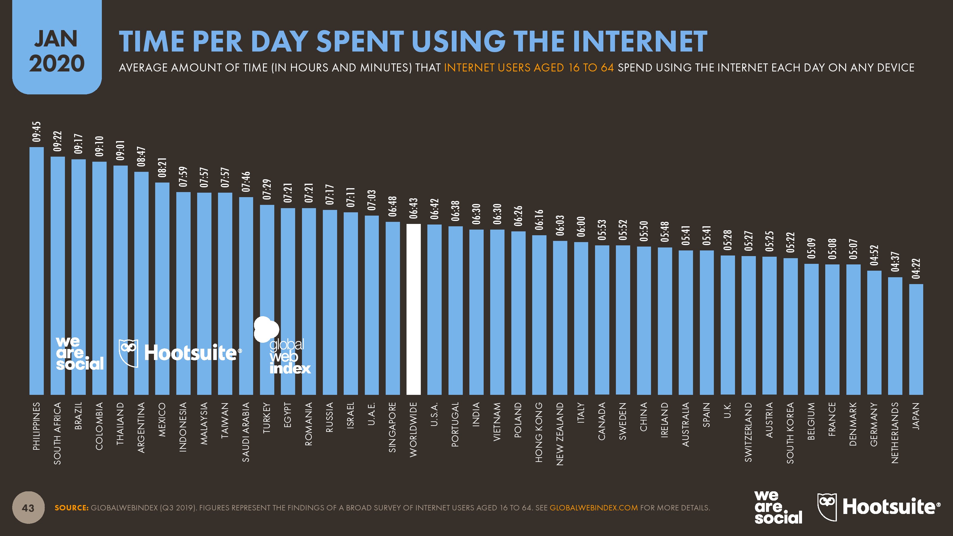 全球网民平均每天在所有设备上使用社交媒体的时间为2小时24分钟,占互联网访问时间的1/3以上。