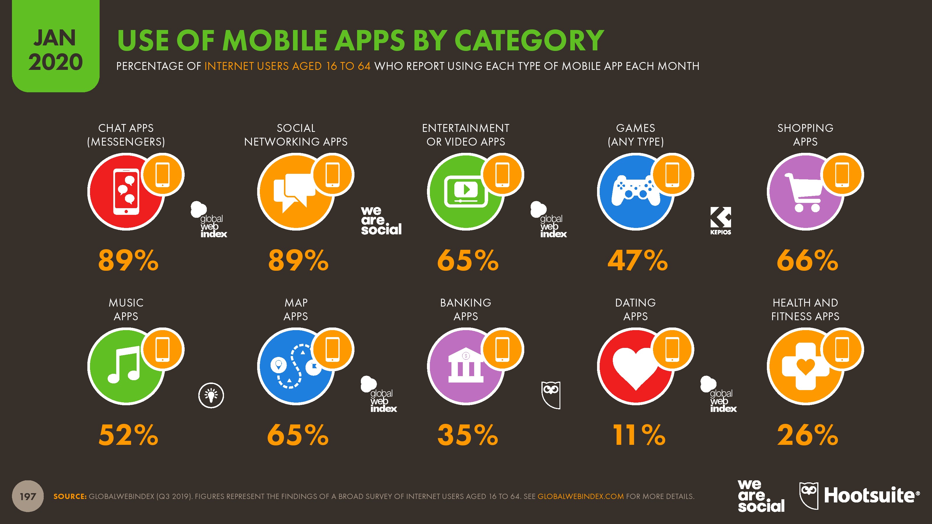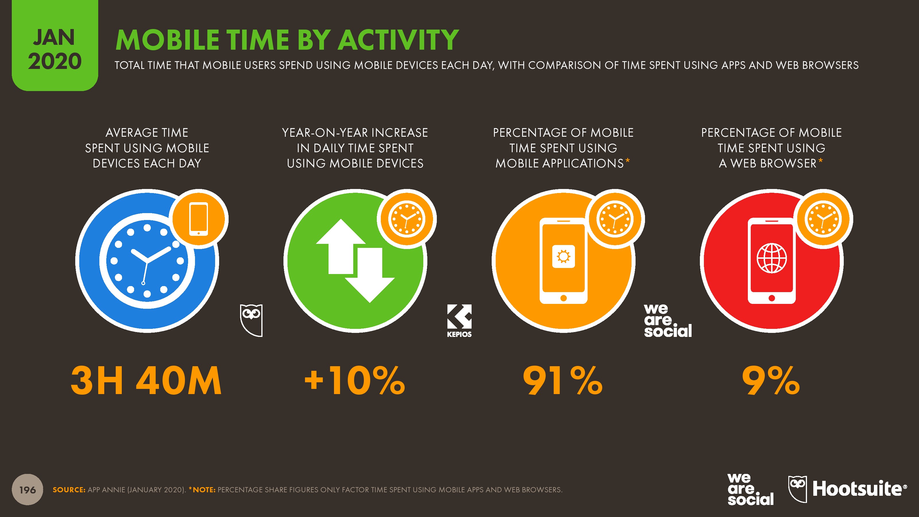 当谈到移动活动时,应用现在占移动设备使用时间的90%以上。数据还显示,我们在越来越多的日常活动中使用应用,但社交媒体仍然占移动设备使用时间的一半。