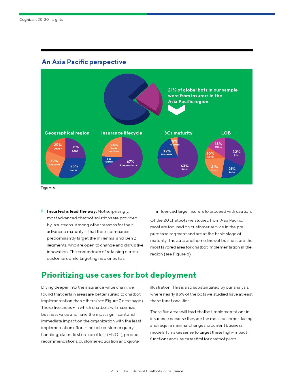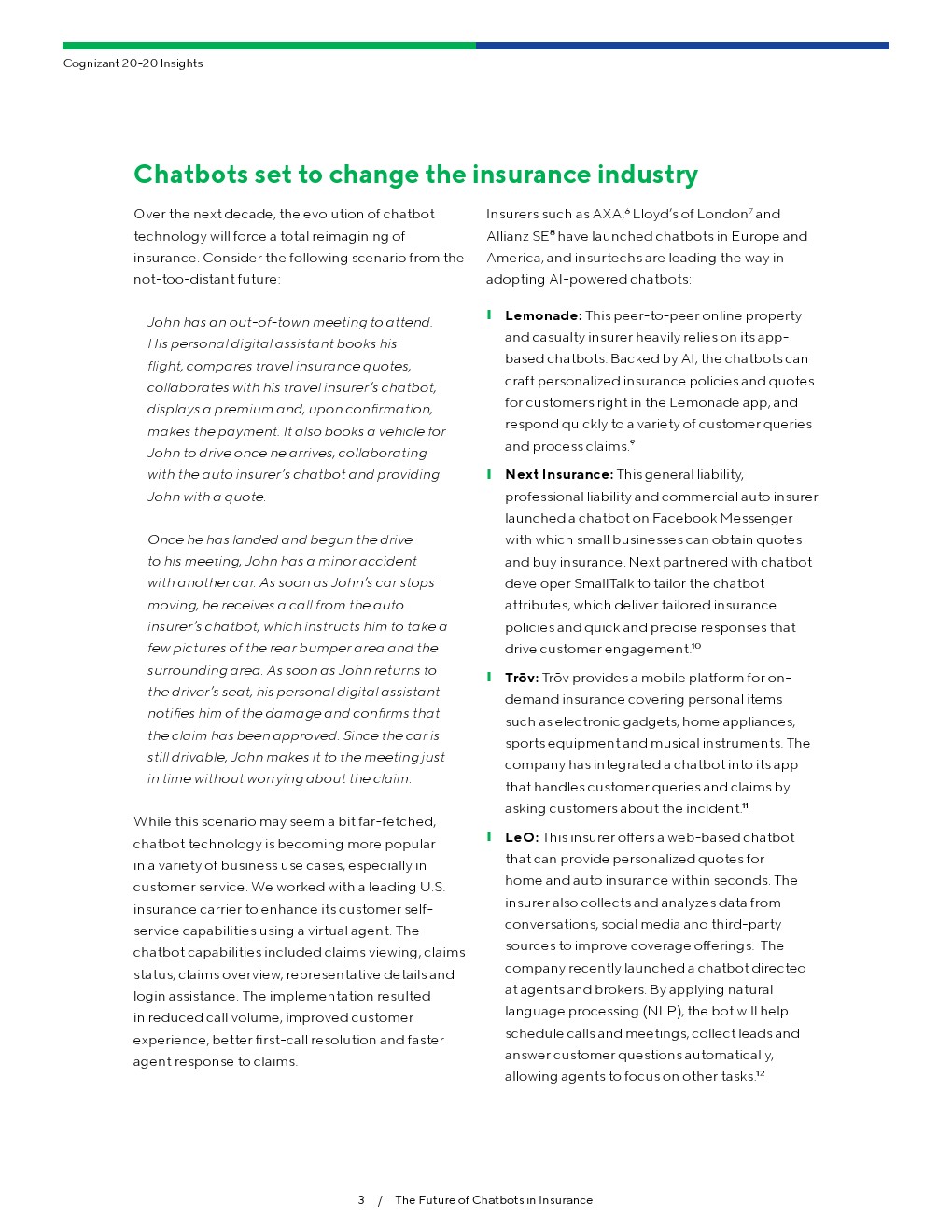 在保险流程中有许多可服务的领域,聊天机器人将在保险价值链上发挥重要作用,包括预购、购买、客户服务和后端运营。这样做可以减轻保险交易的复杂性。传统保险交易的特点是手工填写表格、复杂的问卷、耗时的背景调查、人员短缺和繁琐的客户服务。通过拥抱人工智能为创新提供可能性,保险公司可以赢得客户的心、头脑和钱包。