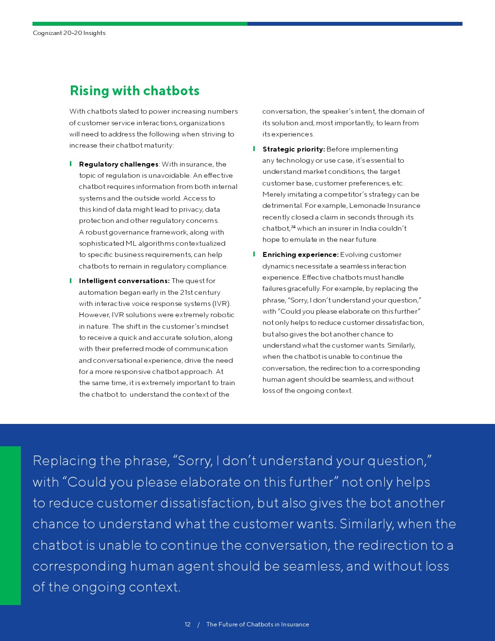 Cognizant将聊天机器人分为三个等级:基础、中间,和先进的聊天机器人。要想成为最高等级的聊天机器人,它必须不断地从经验中学习。