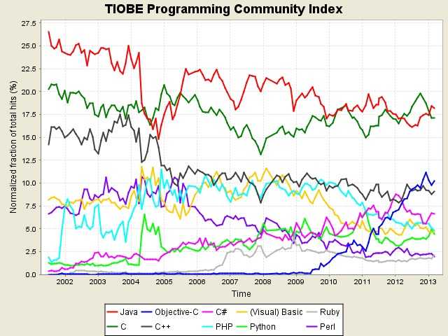 Tiobe公布了新一期编程语言排行榜。Java依旧是占据第一的位置,C语言紧随其后。值得注意的Objective-C持续发力,已经占到了第三的位置。咋一看榜单,前5条中C#下滑最快,从第3名下降到第五名。而其他语言都与之前没有变化。