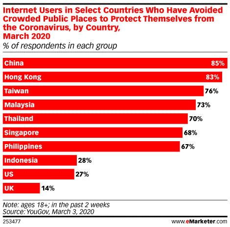 新的研究表明,人们对待COVID-19的程度取决于每个国家爆发的严重程度。根据YouGov 2020年3月的一项调查,85%的中国大陆网民和83%的中国香港网民在过去两周里避免去拥挤的公共场所。超过1/4的美国人(27%)和14%的英国人也这么做了。
