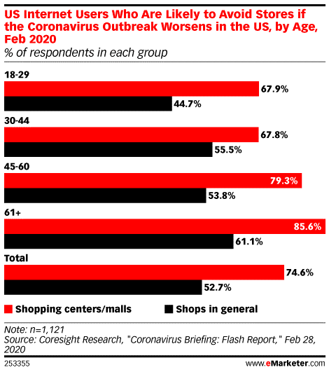 CoreSight Research 2020年2月的一项调查显示,27.5%的美国网民正在避免去公共场所,这与YouGov的调查结果不相上下。但它也表示,如果冠状病毒在美国恶化,58.0%的美国人会这样做。购物中心/商场预计将是人们最需要回避的地方,但超过一半的受访者也会避开商店。