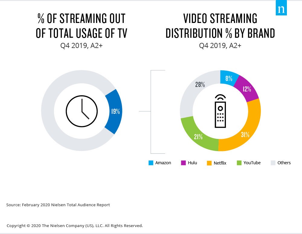 根据尼尔森的报告,有OTT的家庭中,看电视的时间中近1/5(19%)用于收看流媒体内容,无论是通过广告支持的模式还是付费订阅模式。这是一个绝佳的机会,可以使用熟悉且舒适的界面轻松地接触数字时代的消费者。