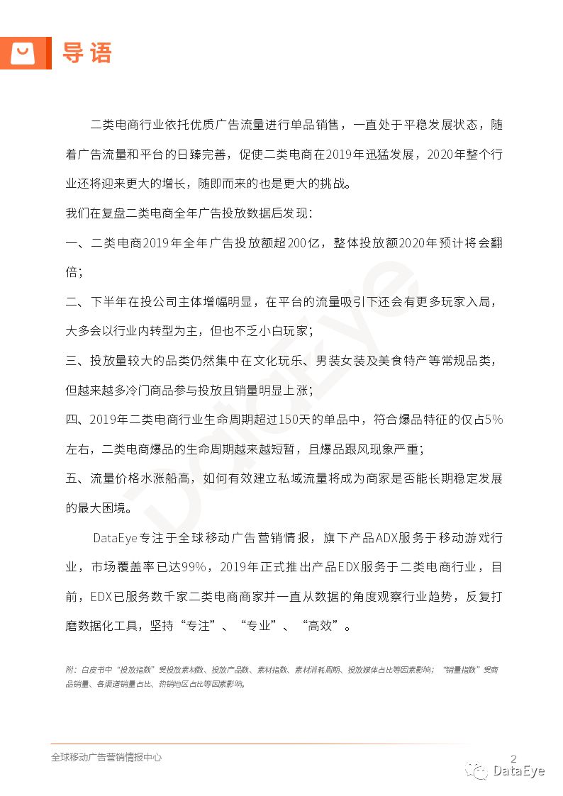 DataEye:2019二类电商广告投放白皮书 更多阅读:DataEye:2020半年度二类电商广告投放白皮书DataEye:2020移动游戏全年买量白皮书DataEye:2020年移动游戏半年度买量白皮书DataEye:2019移动游戏全年买量白皮书DataEye:2015年泛娱乐白皮书DataEye:2015年Q3 HTML5游戏数据报告DataEye:2020年10月份手游买量报告DataEye:2019移动游戏半年度买量白皮书DataEye:2015年Q3手机游戏数据报告DataEye:2015年Q2 HTML5游戏数据报告DataEye:2016年1月中国手机游戏新品洞察报告DataEye:泛娱乐开启游戏行业新时代DataEye:2015年Q4 手游新品洞察报告DataEye:2015年中国手游市场新品洞察报告DataEye:2015年9月国内手游市场新品洞察月度报告