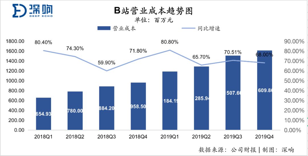 财务数据方面,据财报数据显示,2019财年B站总营收为67.8亿元,同比增长64%,其中第四季度营收达到20.1亿元,同比增长73.8%,增速为年内最高,同时这也是连续第七个季度超市场预期。