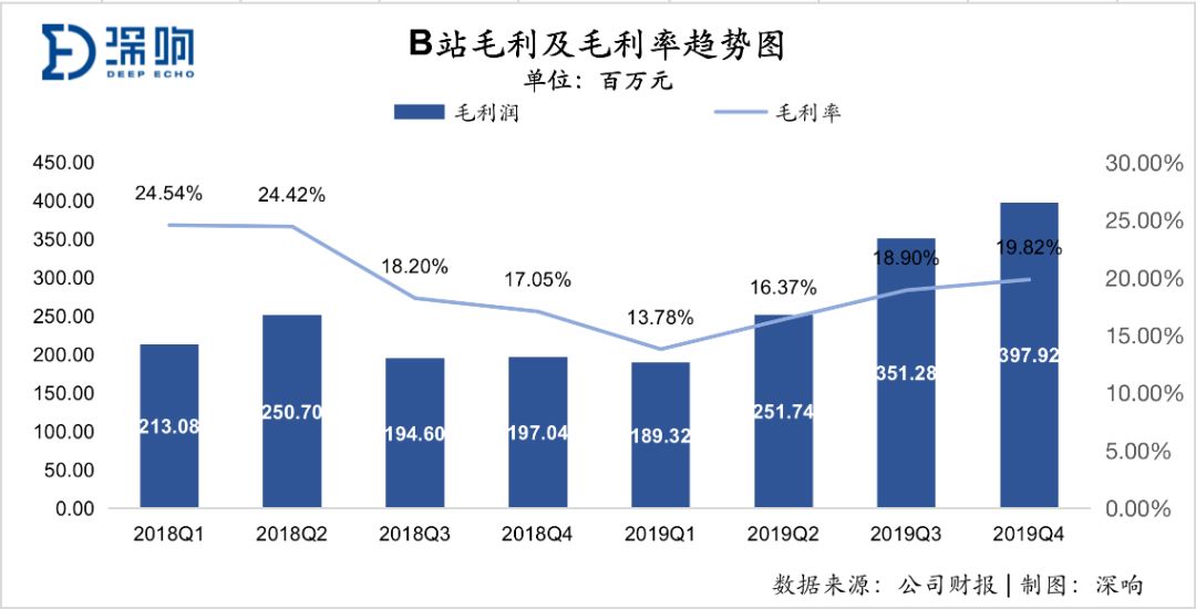 2019四季B站毛利润为3.97亿元,毛利率为19.8%,实现了连续三个季度的上涨,创下了年内新高,并高于市场平均预期的19.1%。